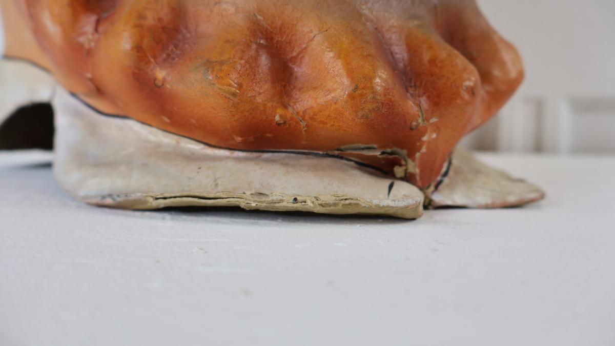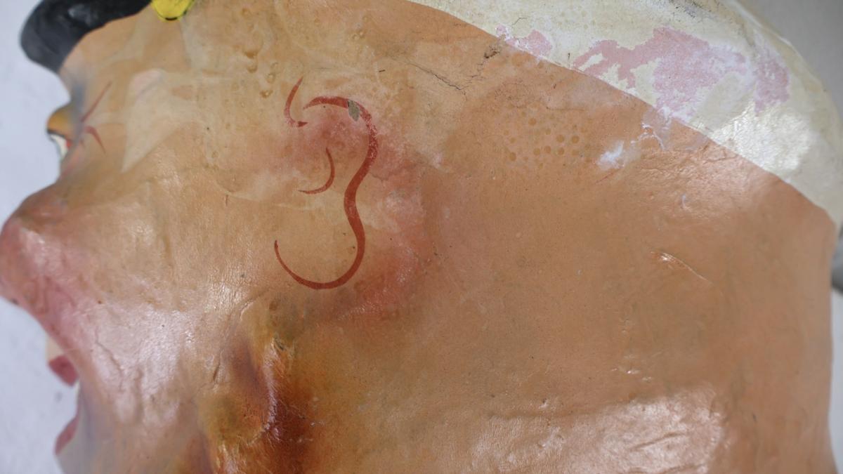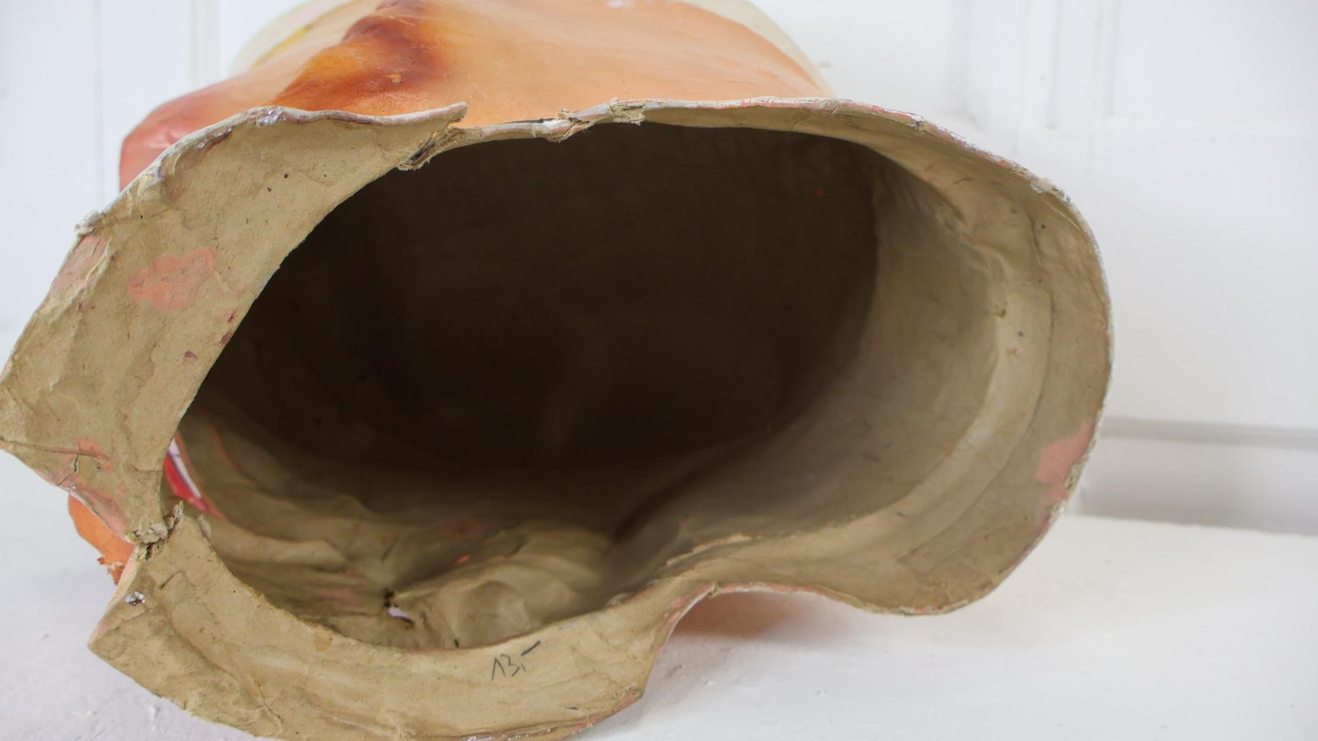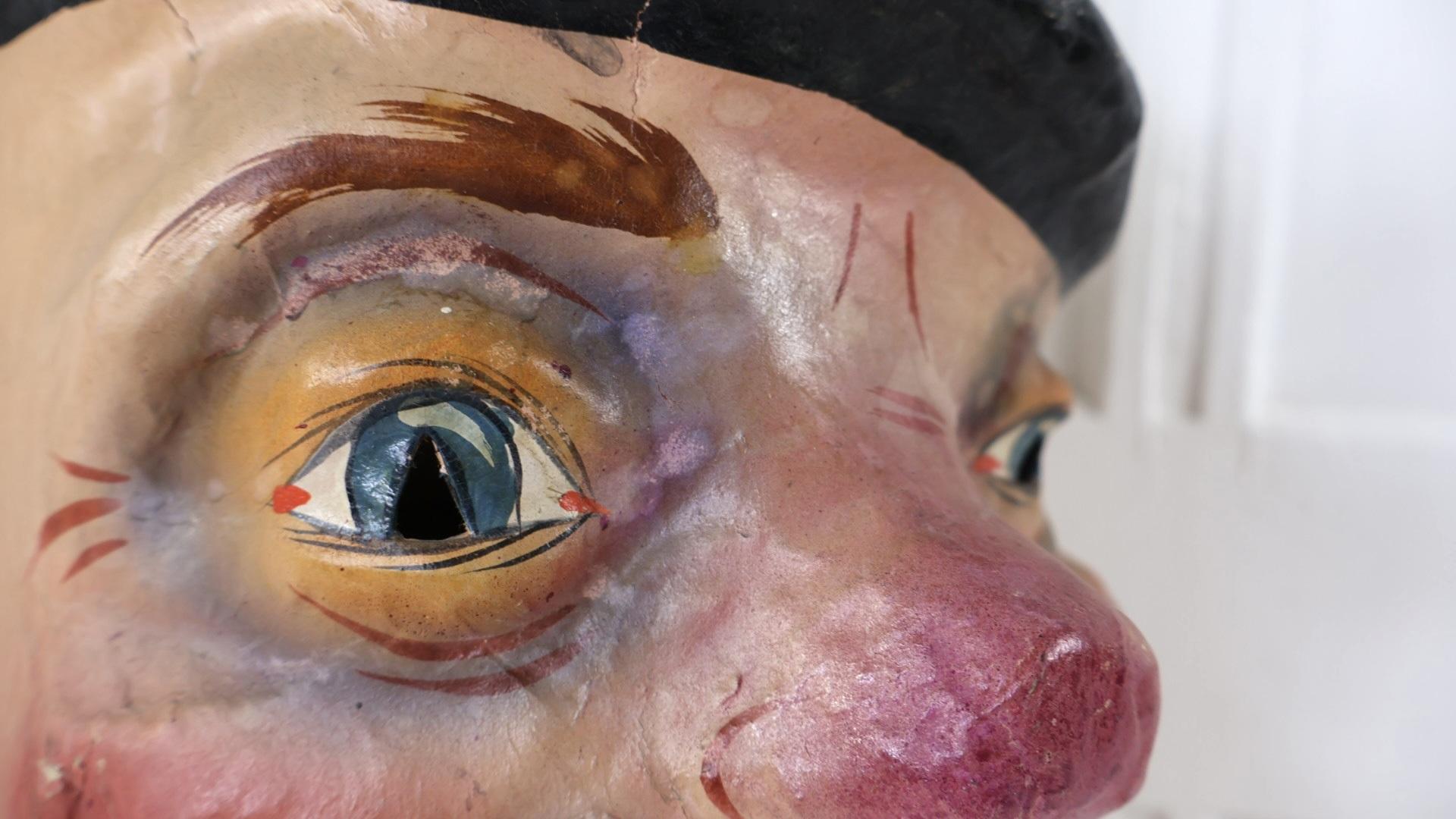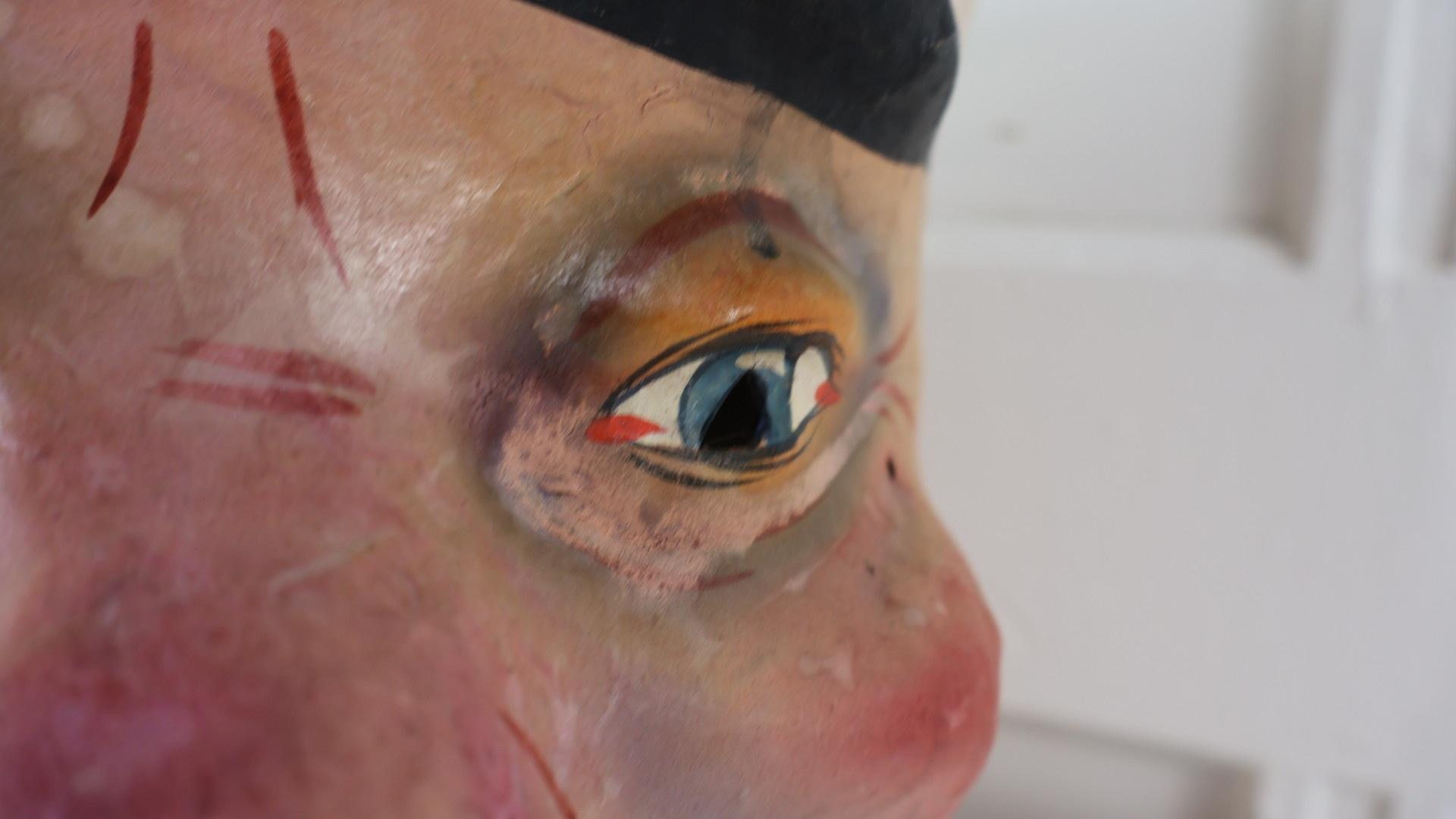 A 1940s, papier-mâché carnival mask of an old seaman, with a red nose and cheeks, ginger beard and a sailors hat.