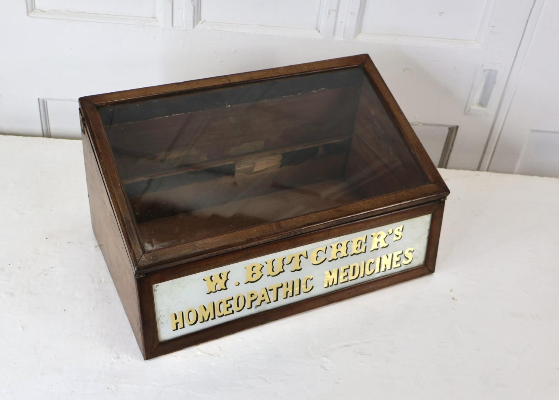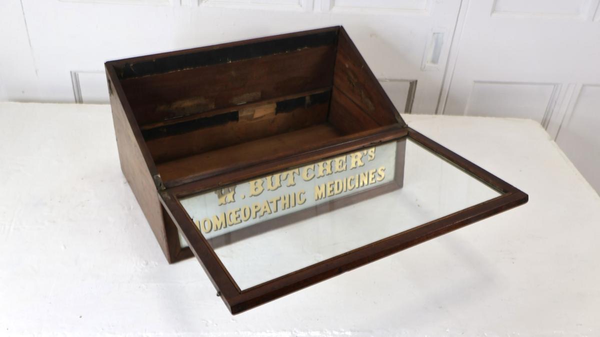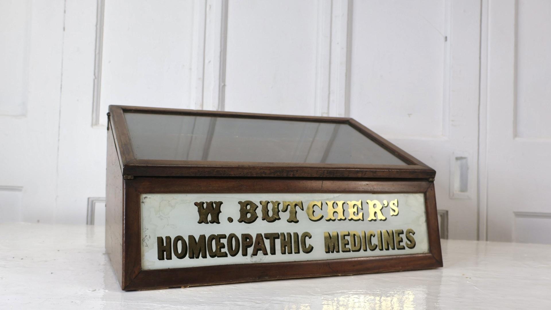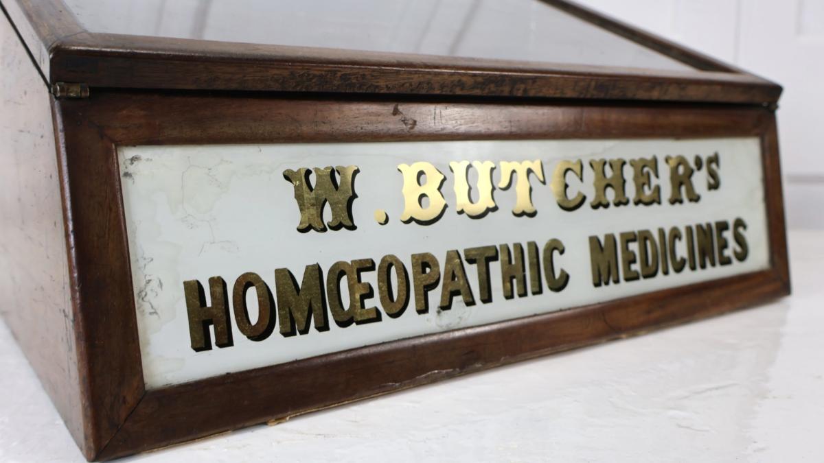 On the front is an opaline advertising panel displaying the pharmacists name and the wording Homeopathic Medicines.