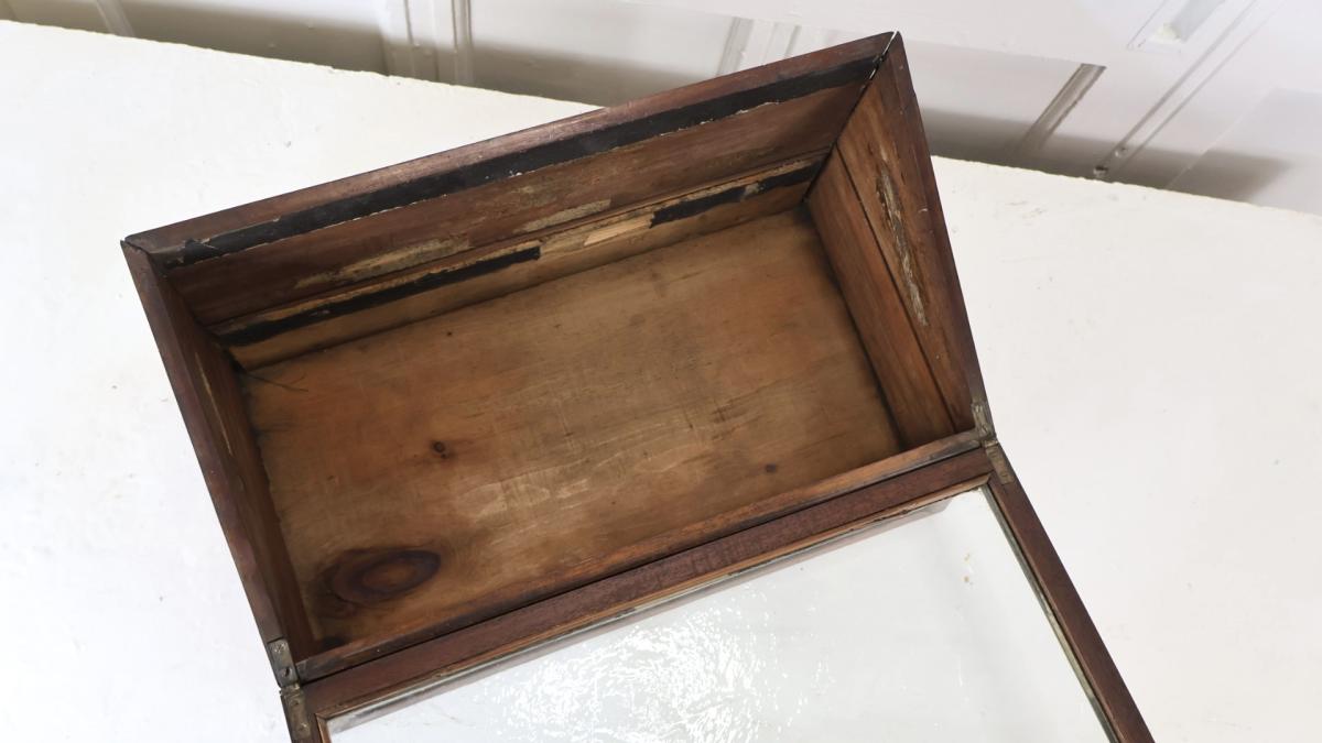 Comprising of a hard wood case with a hinged glass top retaining its brass clasps.