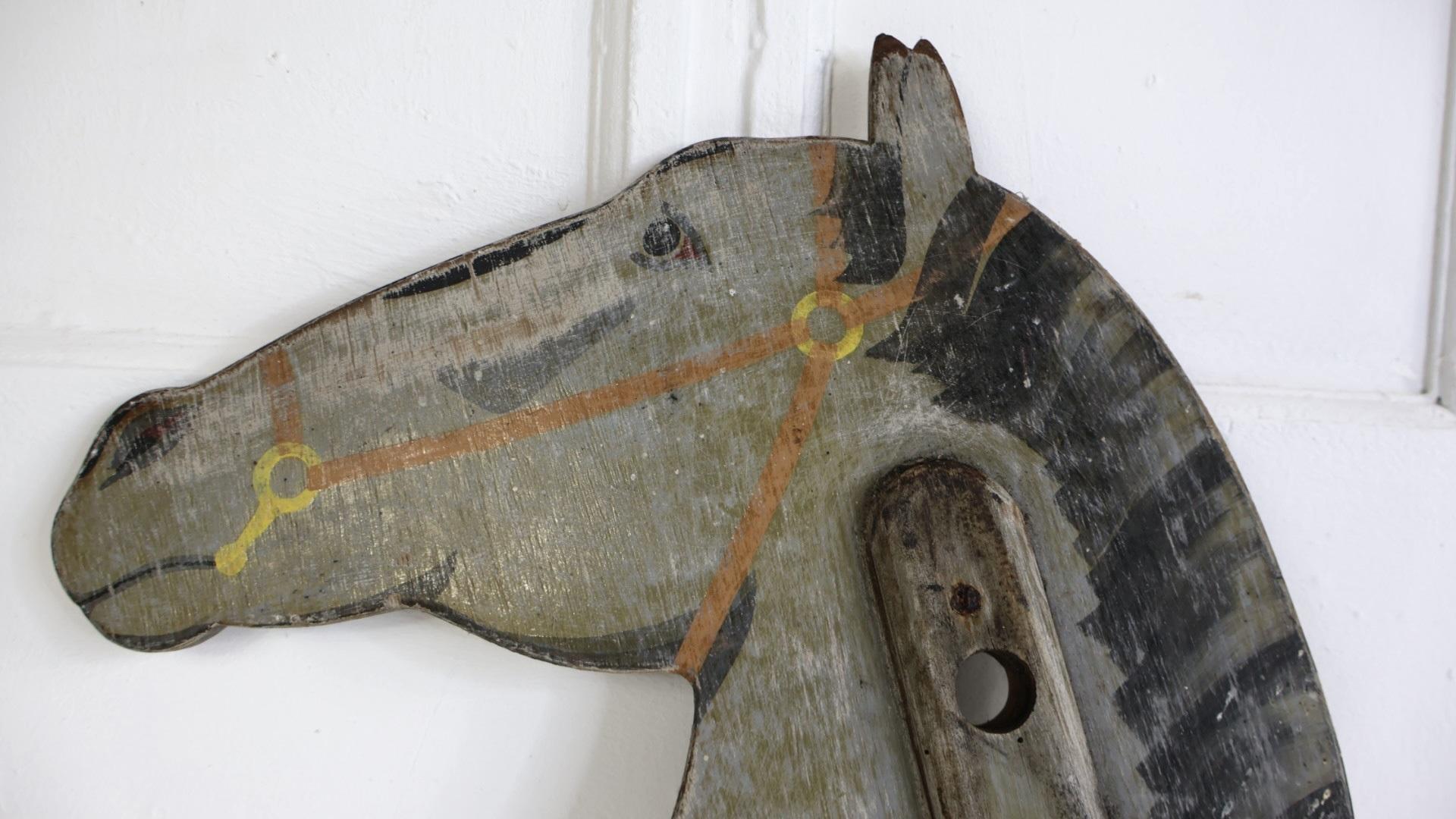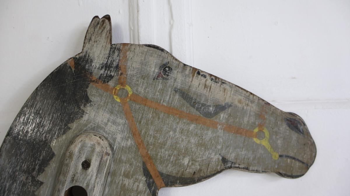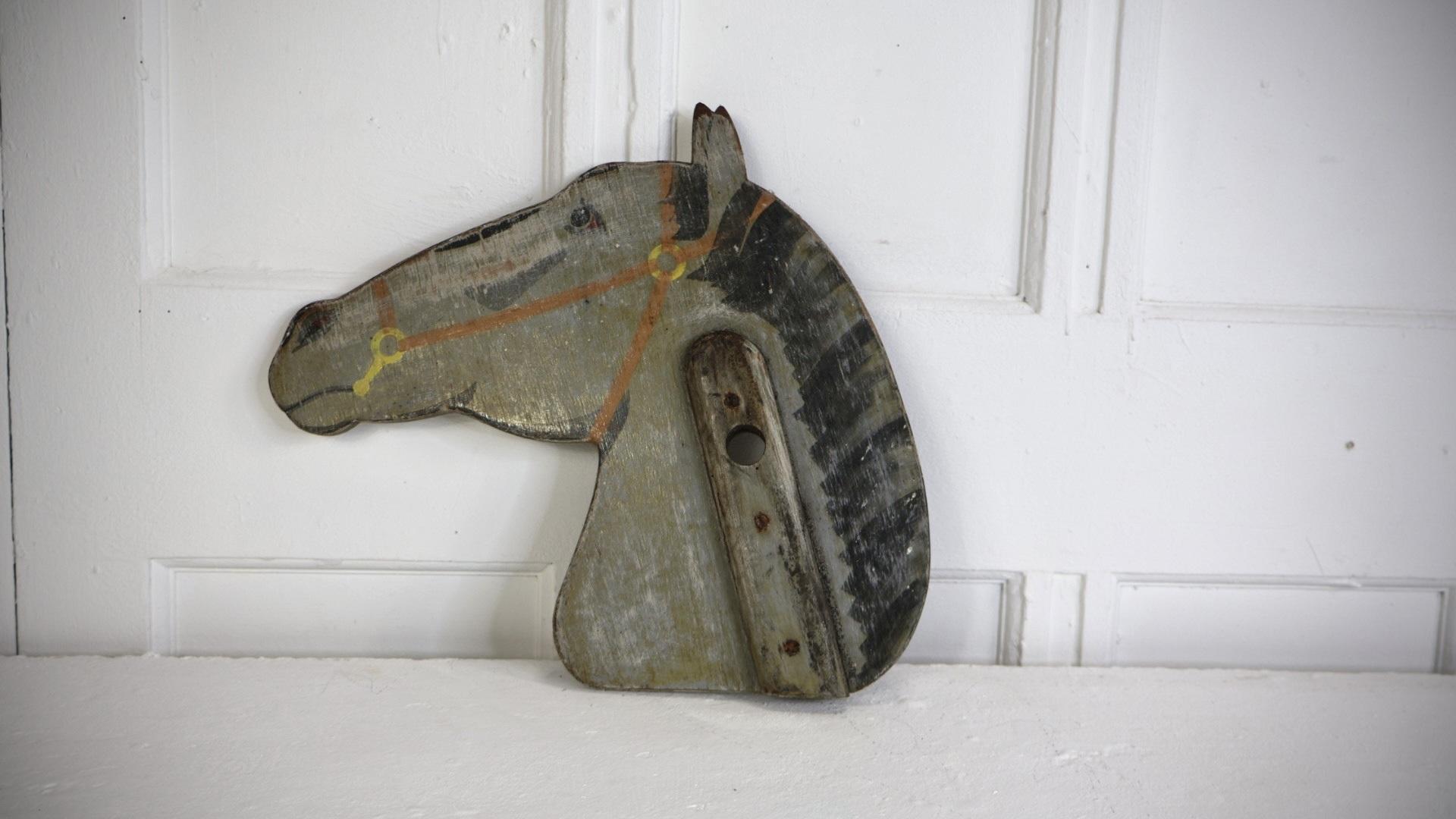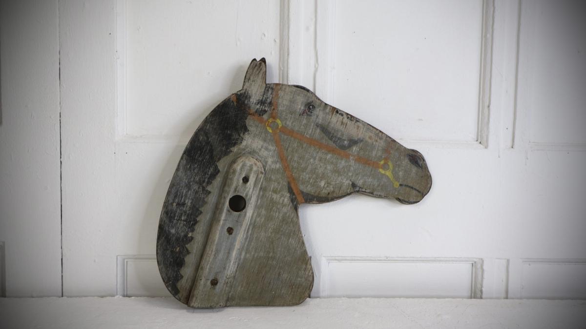 A decorative, double sided hobby horse head, depicting a dapple horse.