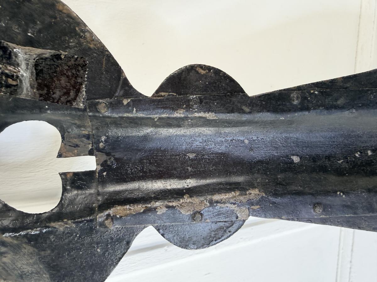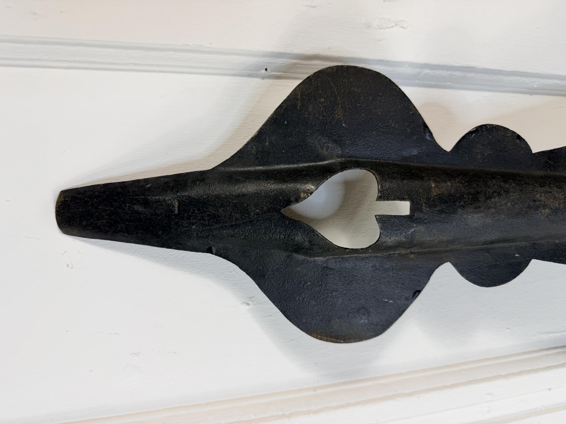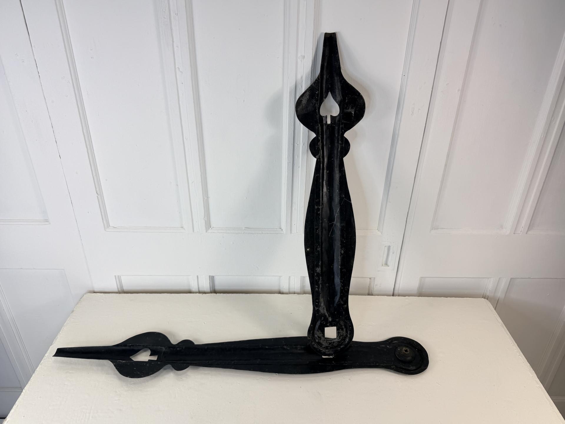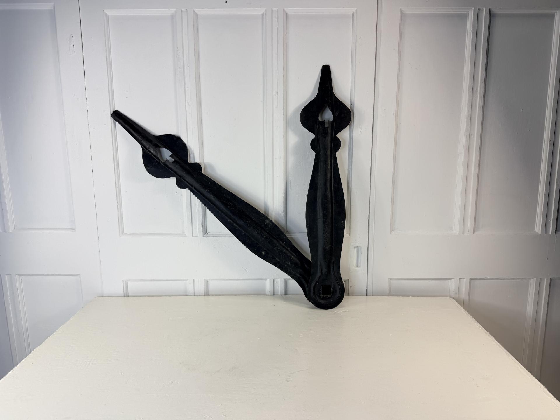 A pair of huge metal hand forged clock hands, originally from the face of a clock tower.