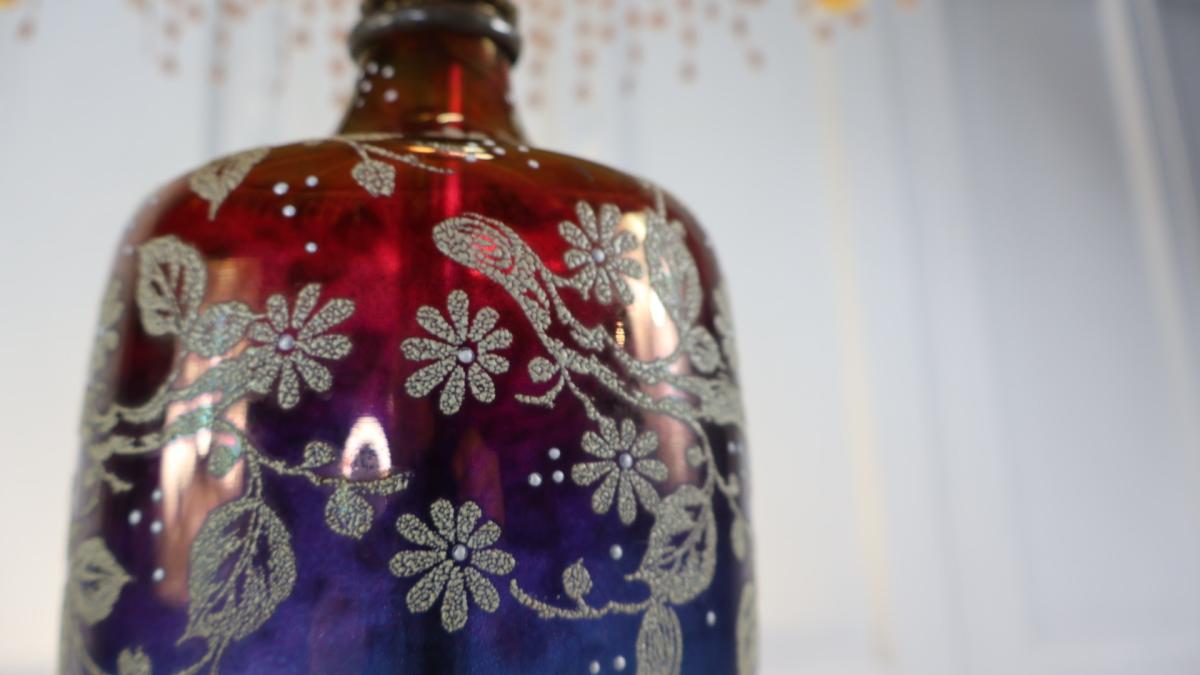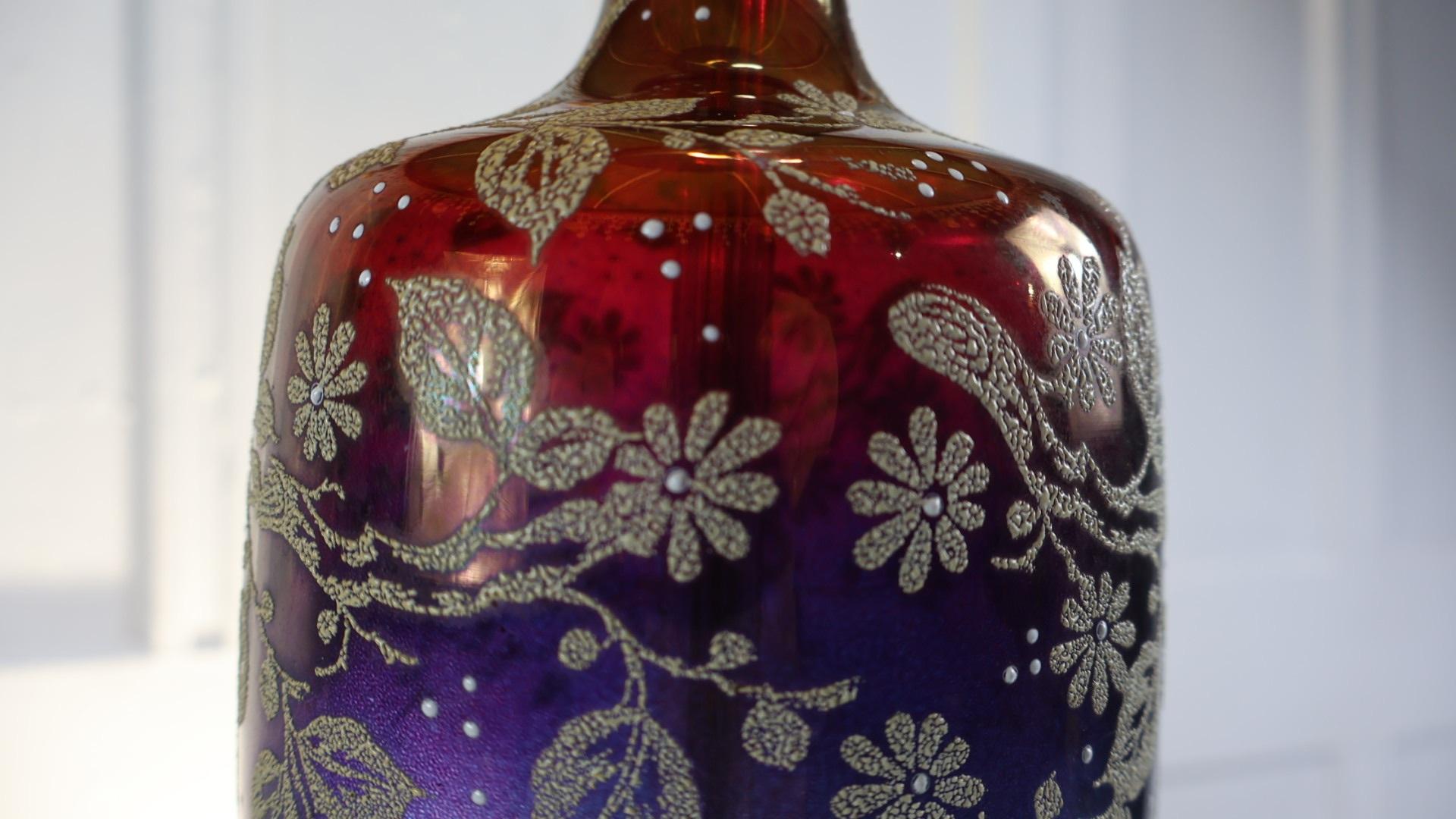 Incredibly decorative, multi coloured hand blown glass body, sitting on an impressive brass base.