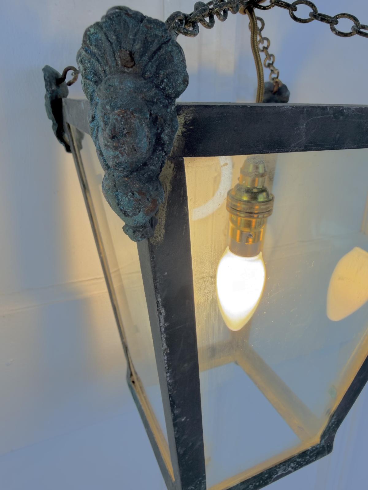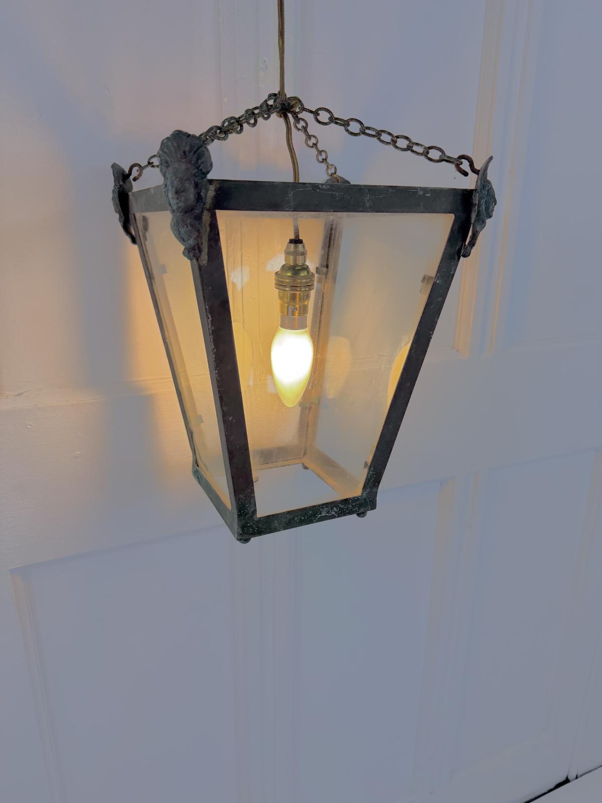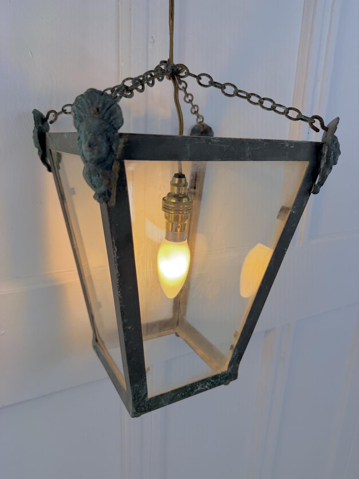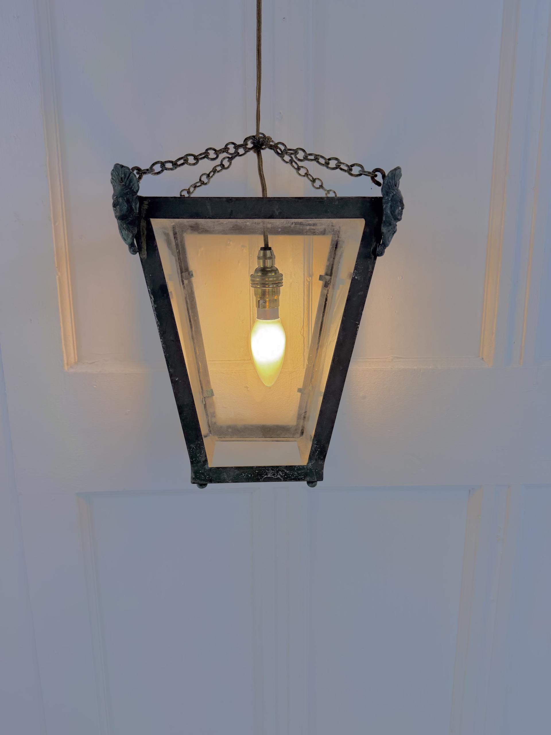 Could be used as a porch lantern, retaining its original glass and hanging chain.