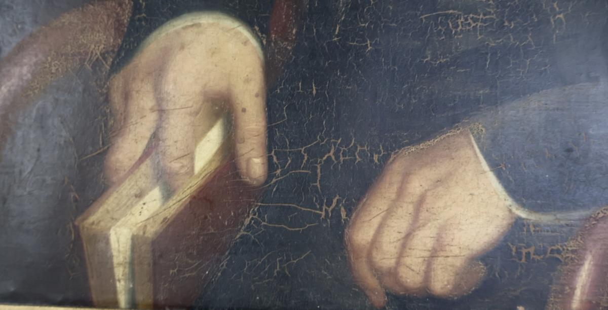 The hand holding the book is incredibly well painted, and the painting is in very good condition with age appropriate signs of wear and use.