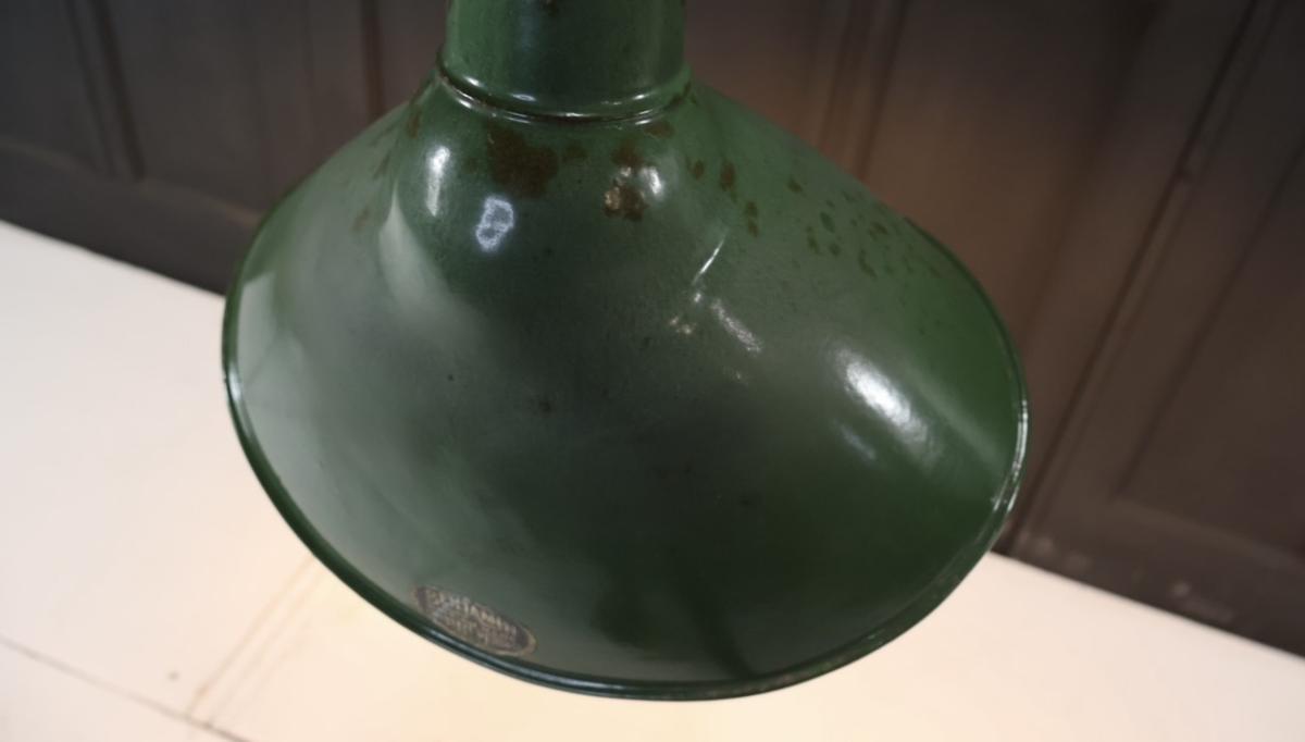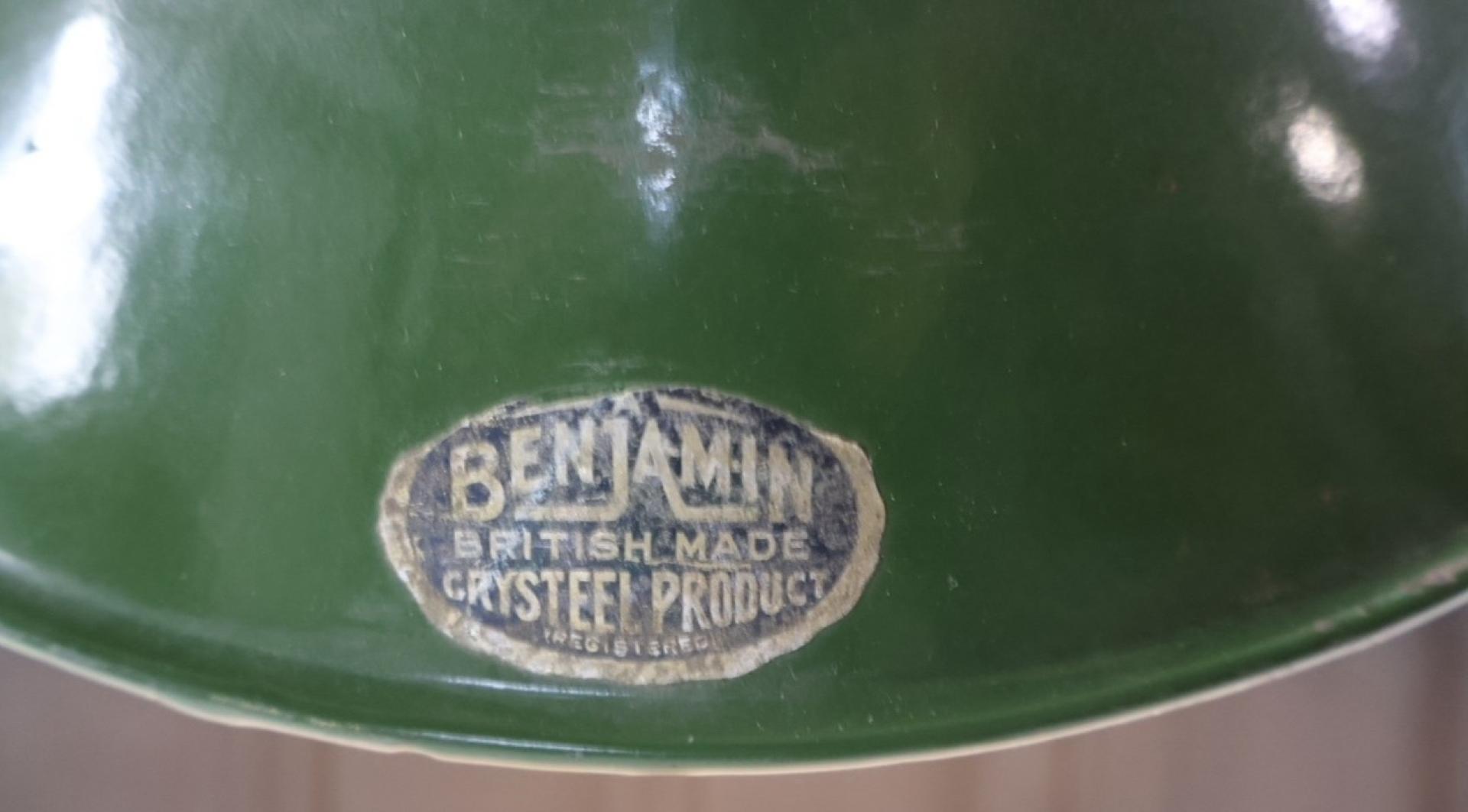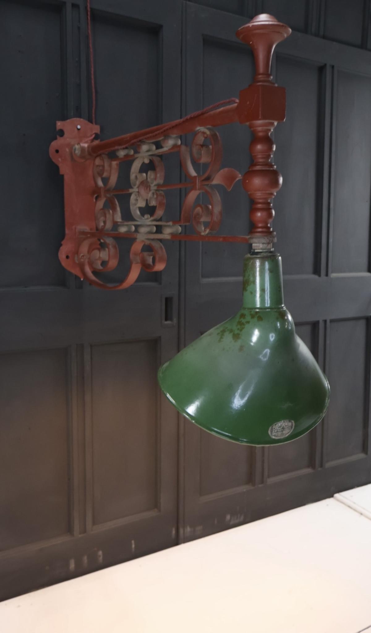 Comprising of an ornate wrought iron bracket and original Benjamin green enamel shade.