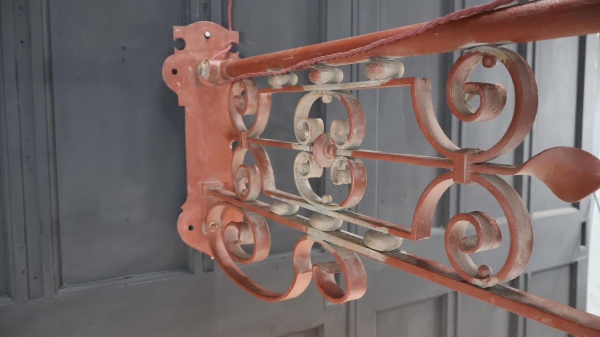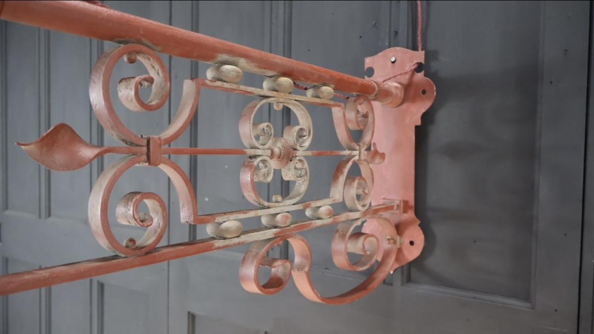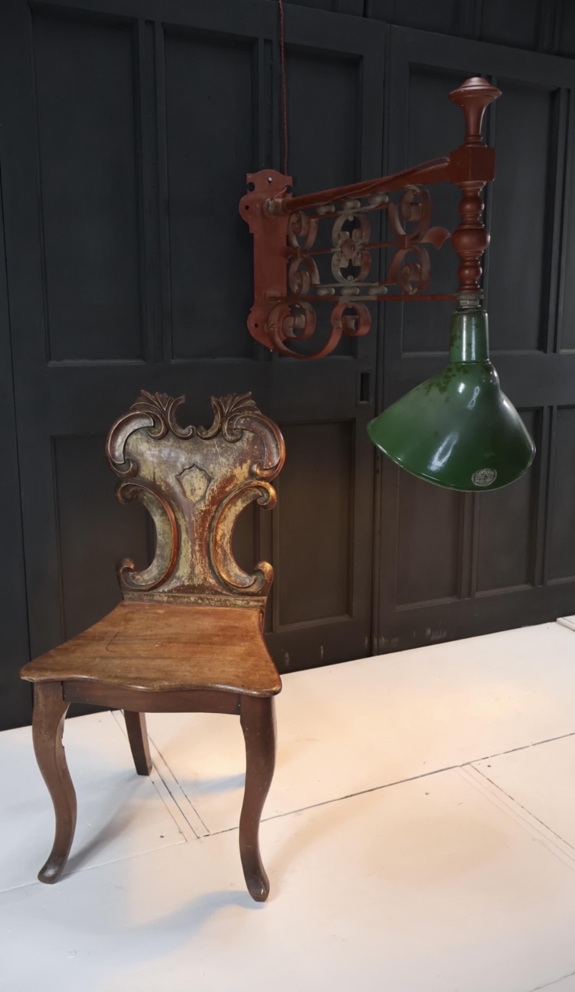 Comprising of an ornate wrought iron bracket and original Benjamin green enamel shade.