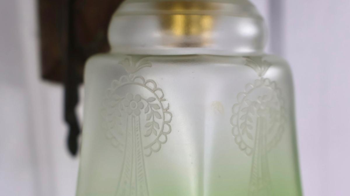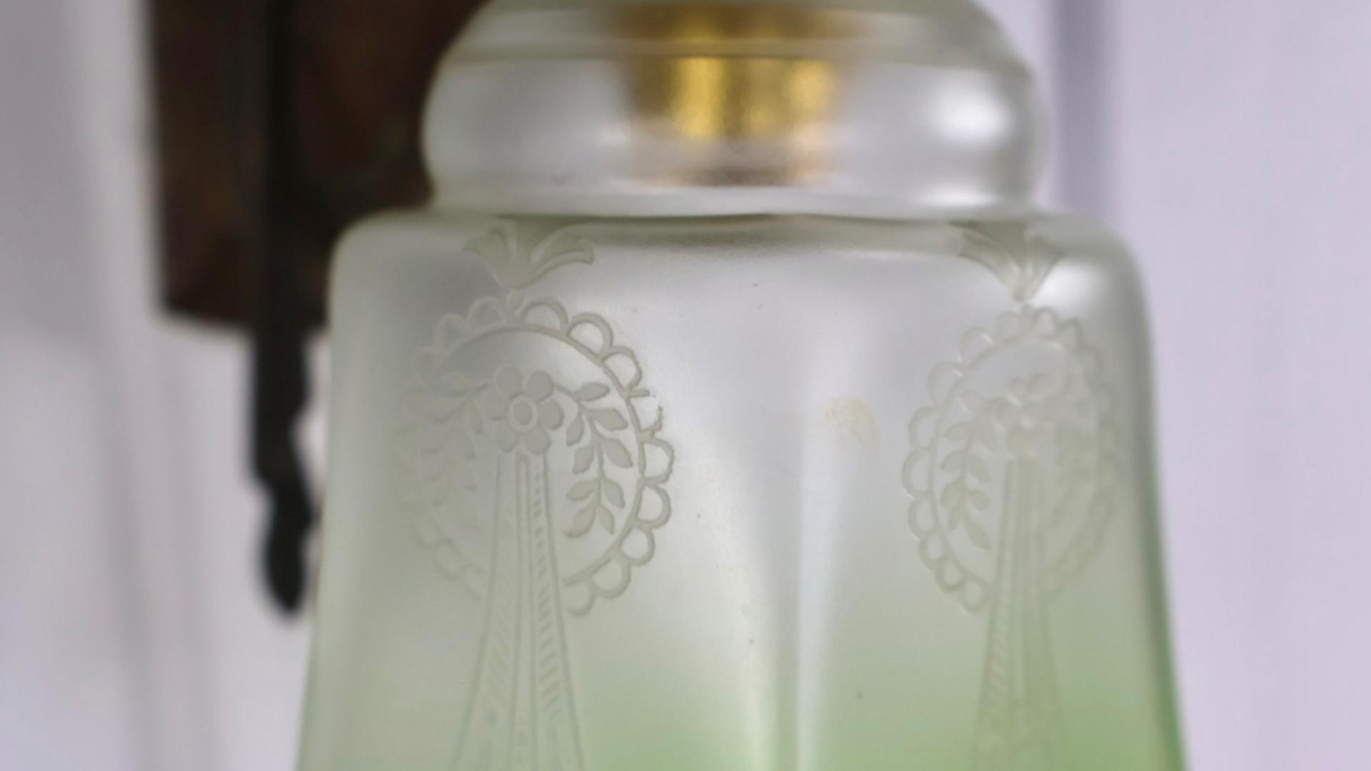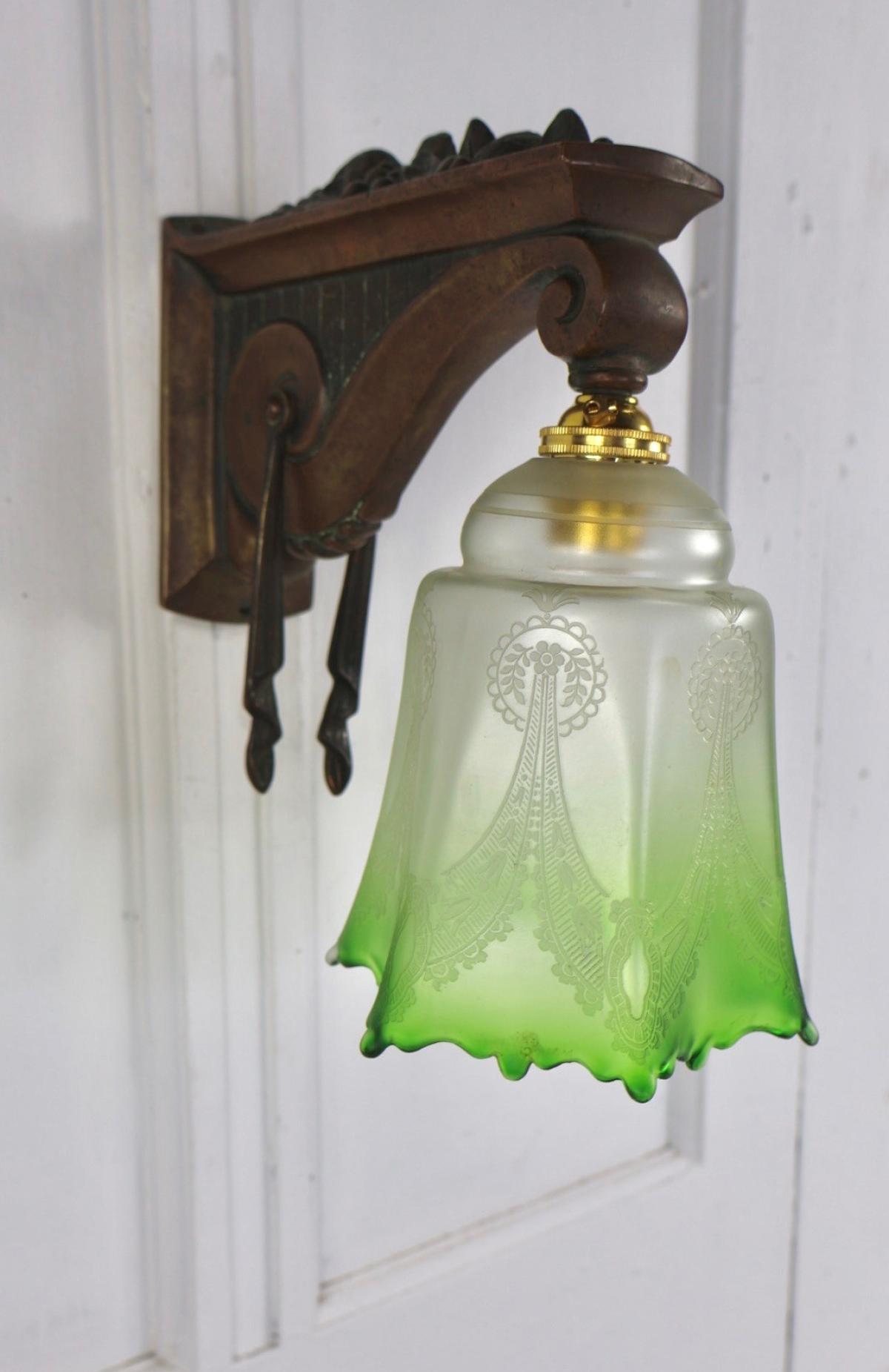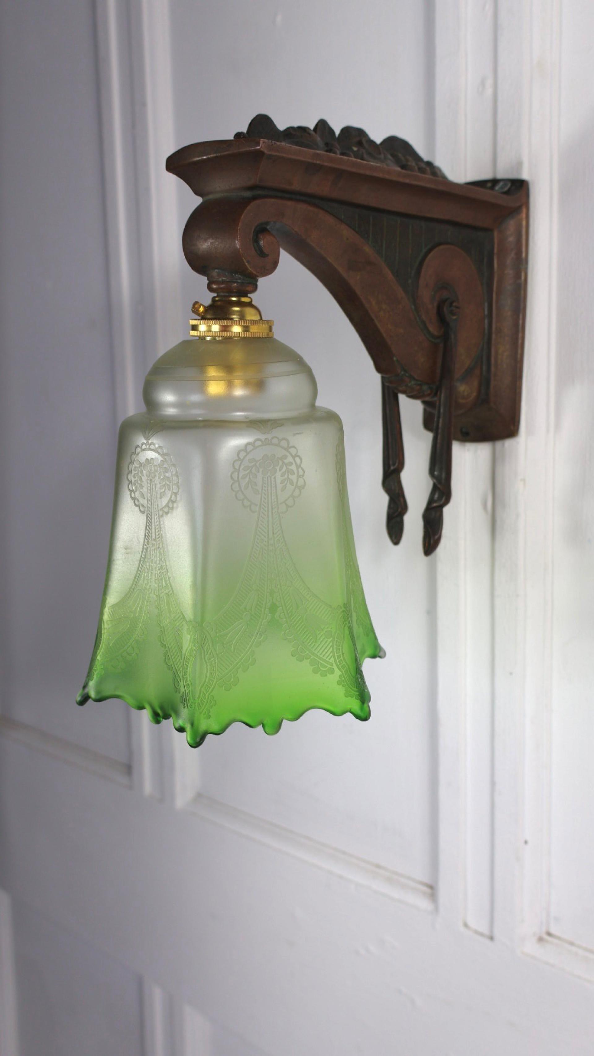 A French, Art Nouveau wall light comprising of a decorative, embossed brass wall bracket, with an elegant etched green glass light shade.