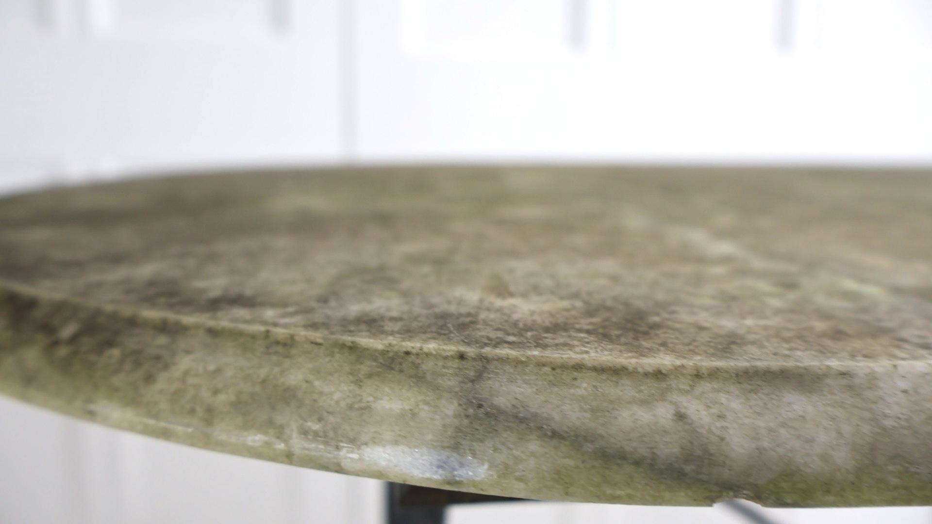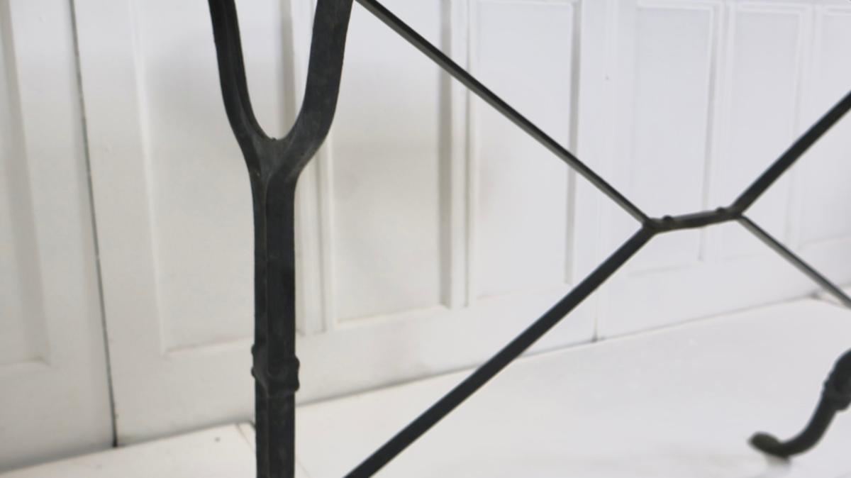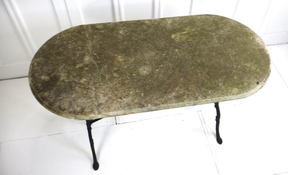 A nicely weathered marble top with a bevelled edge, sitting on a decorative cast base retaining its central brace.