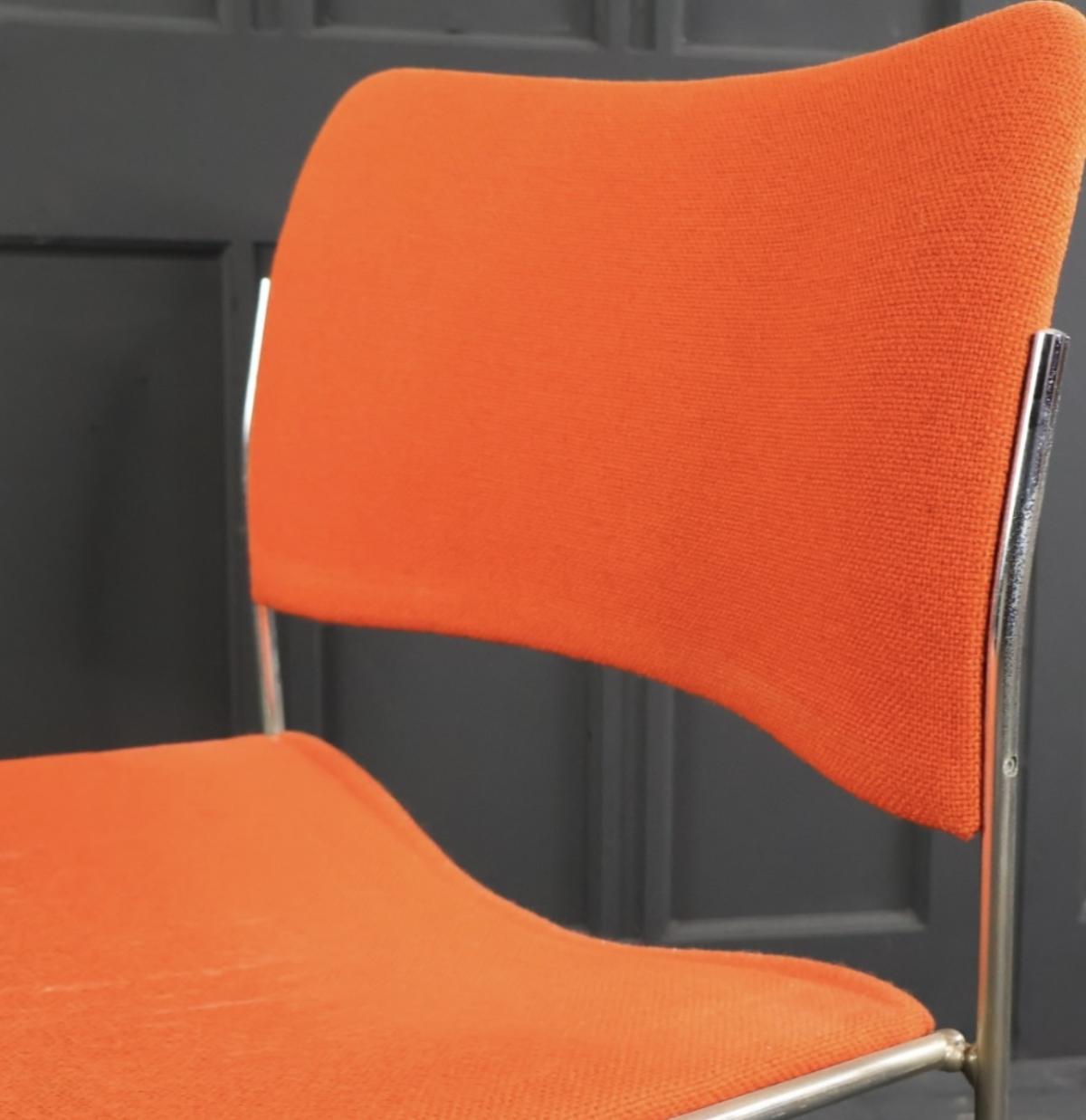 Each chair has a solid steel sled base, and its original sunburst orange upholstery.