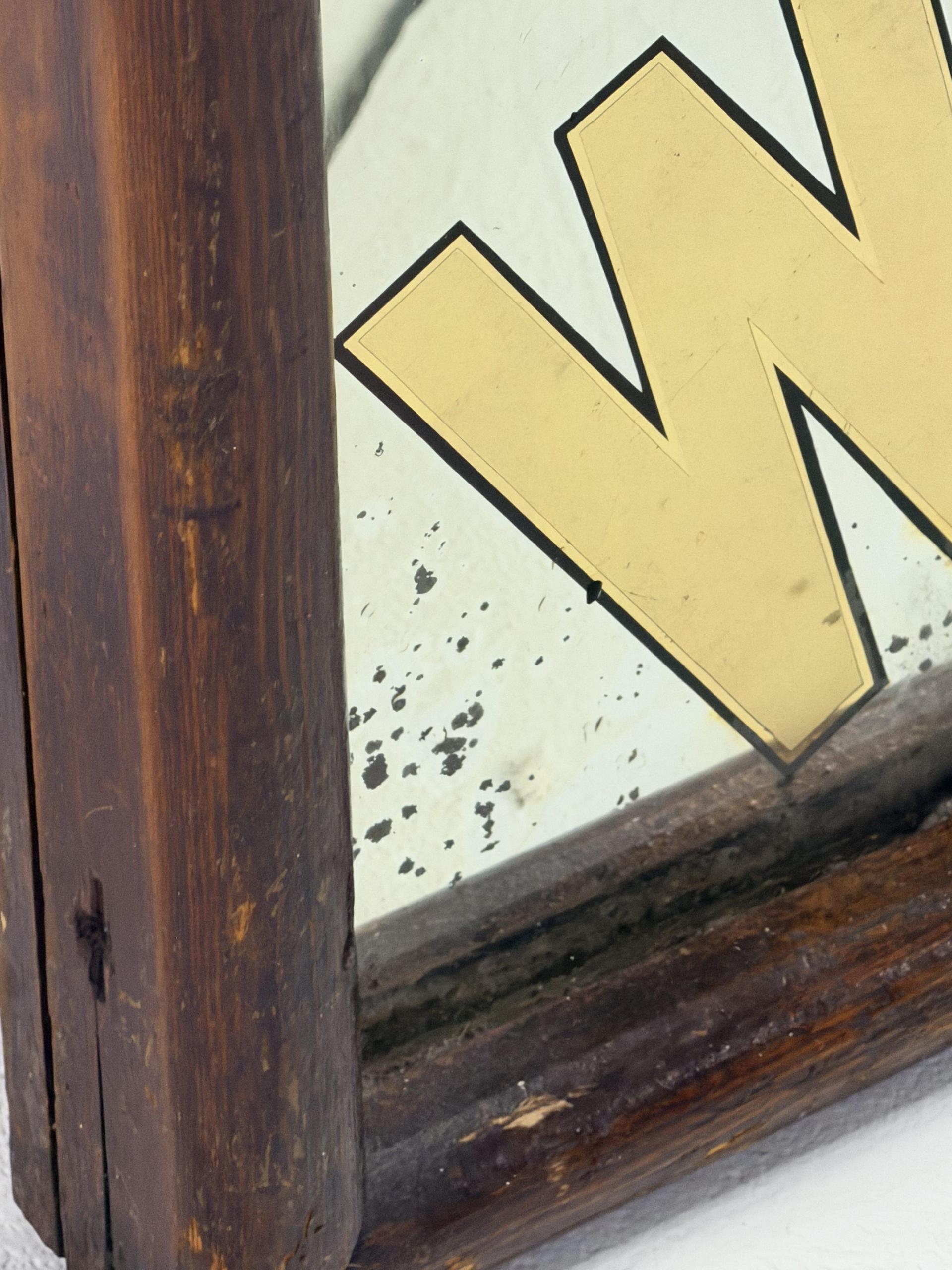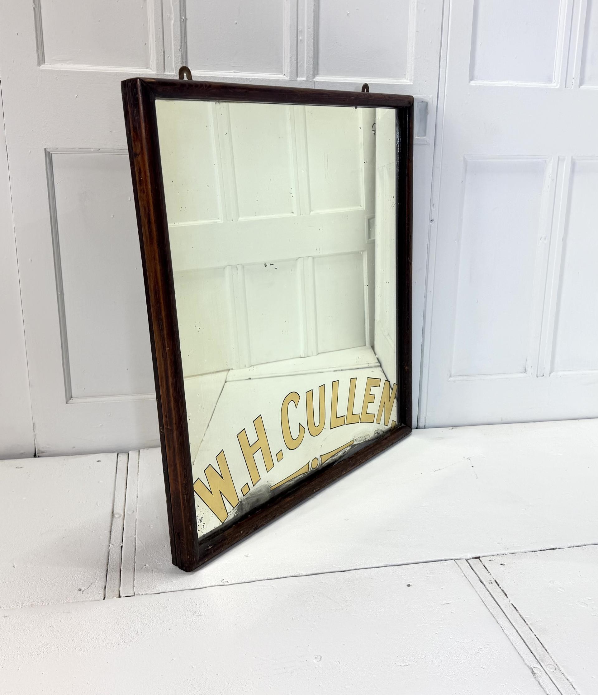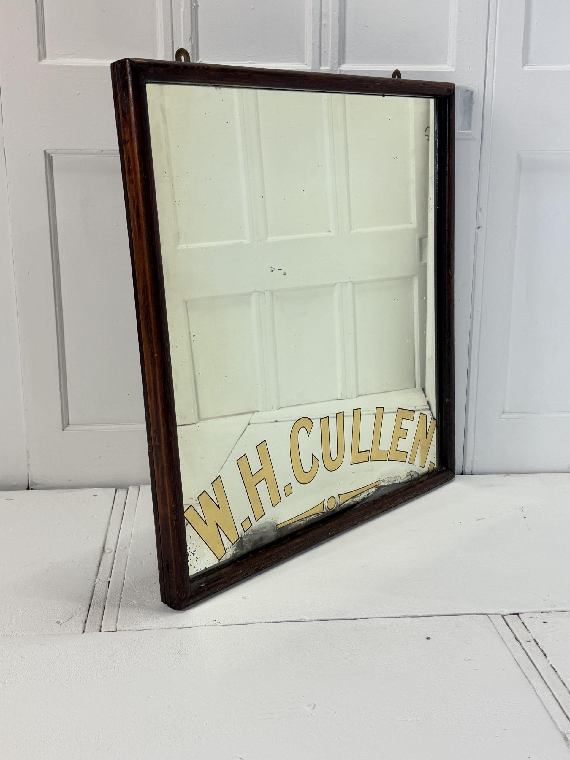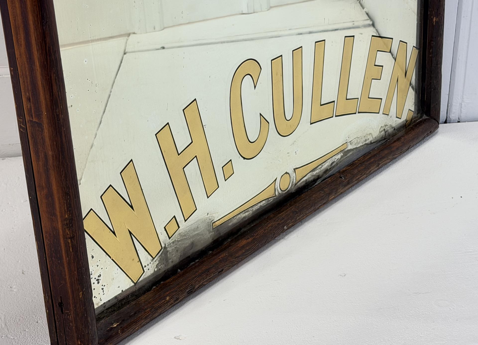 An Edwardian English large tailors mirror, with the original tailors name reverse painted in gold leaf on the mercury plate.