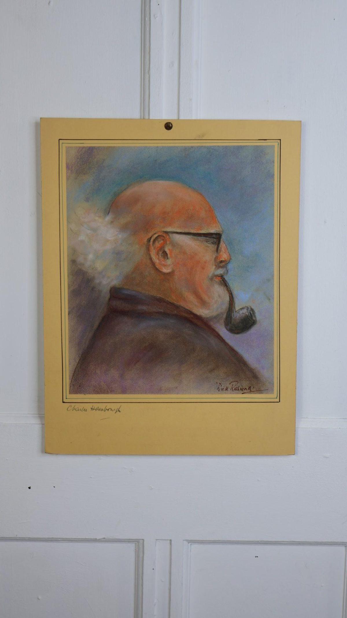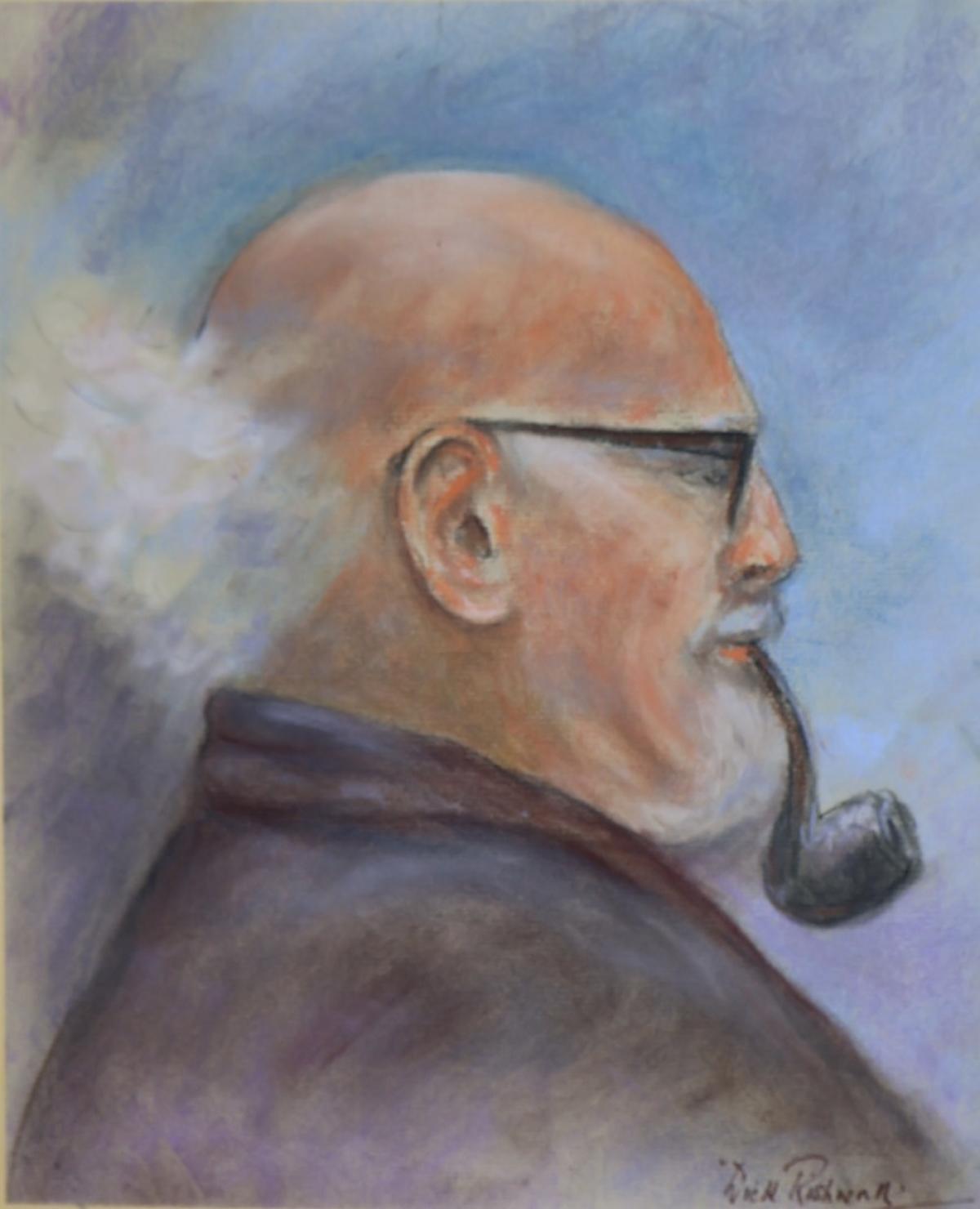 A rather charming and well executed side portrait of a bald man smoking a pipe.