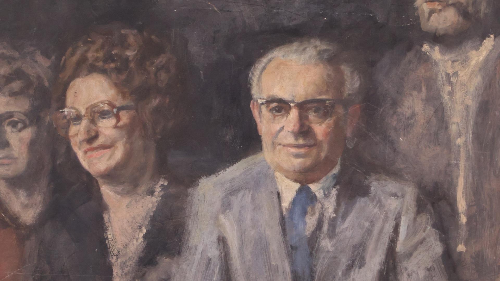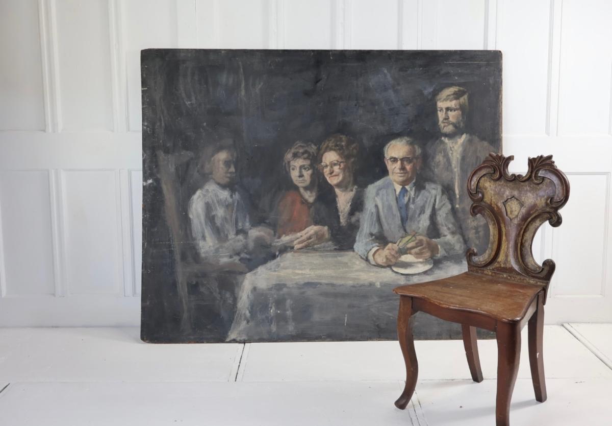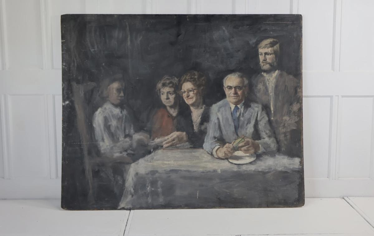 A large oil on canvas depicting 5 people sitting around a table.