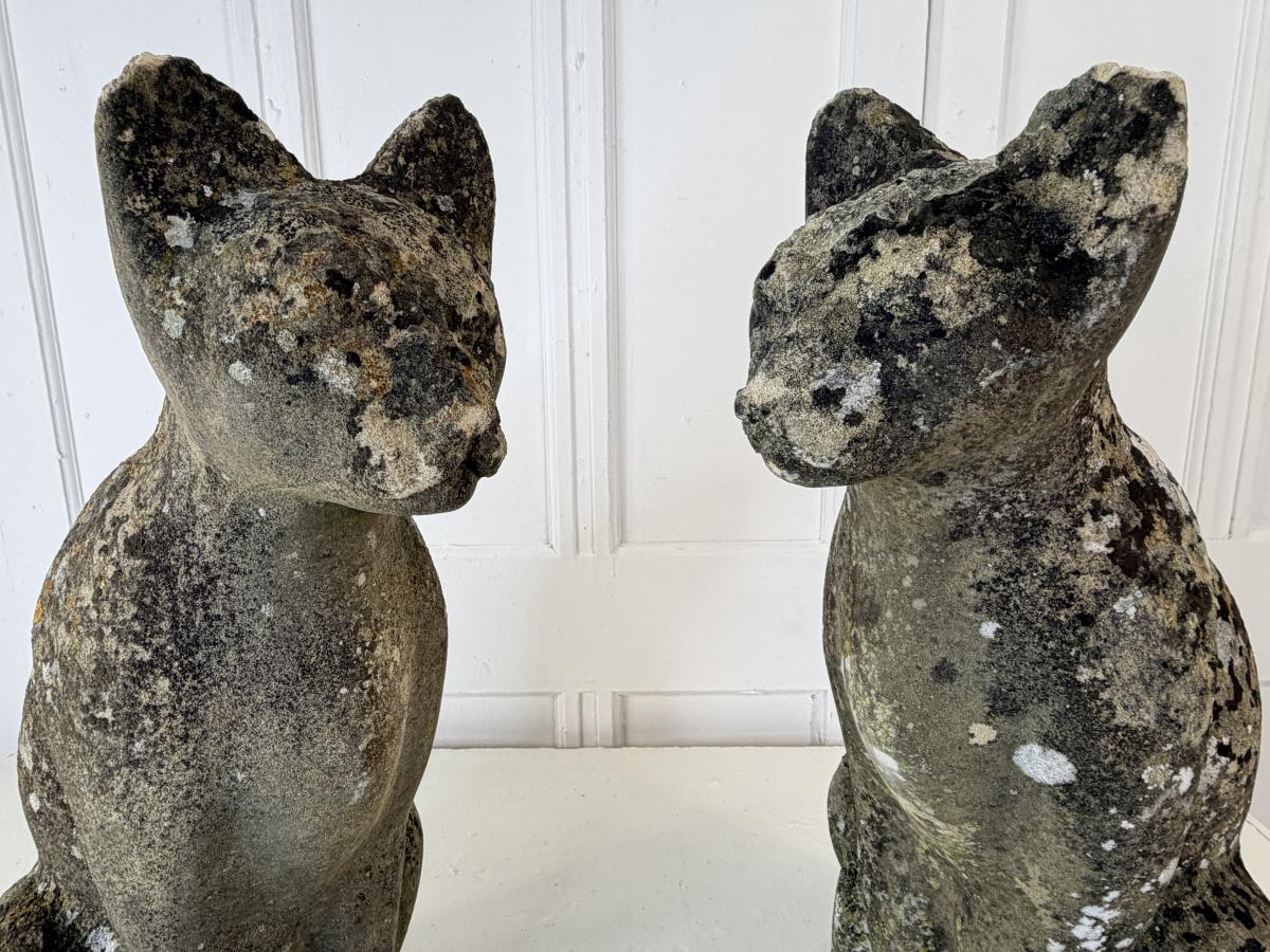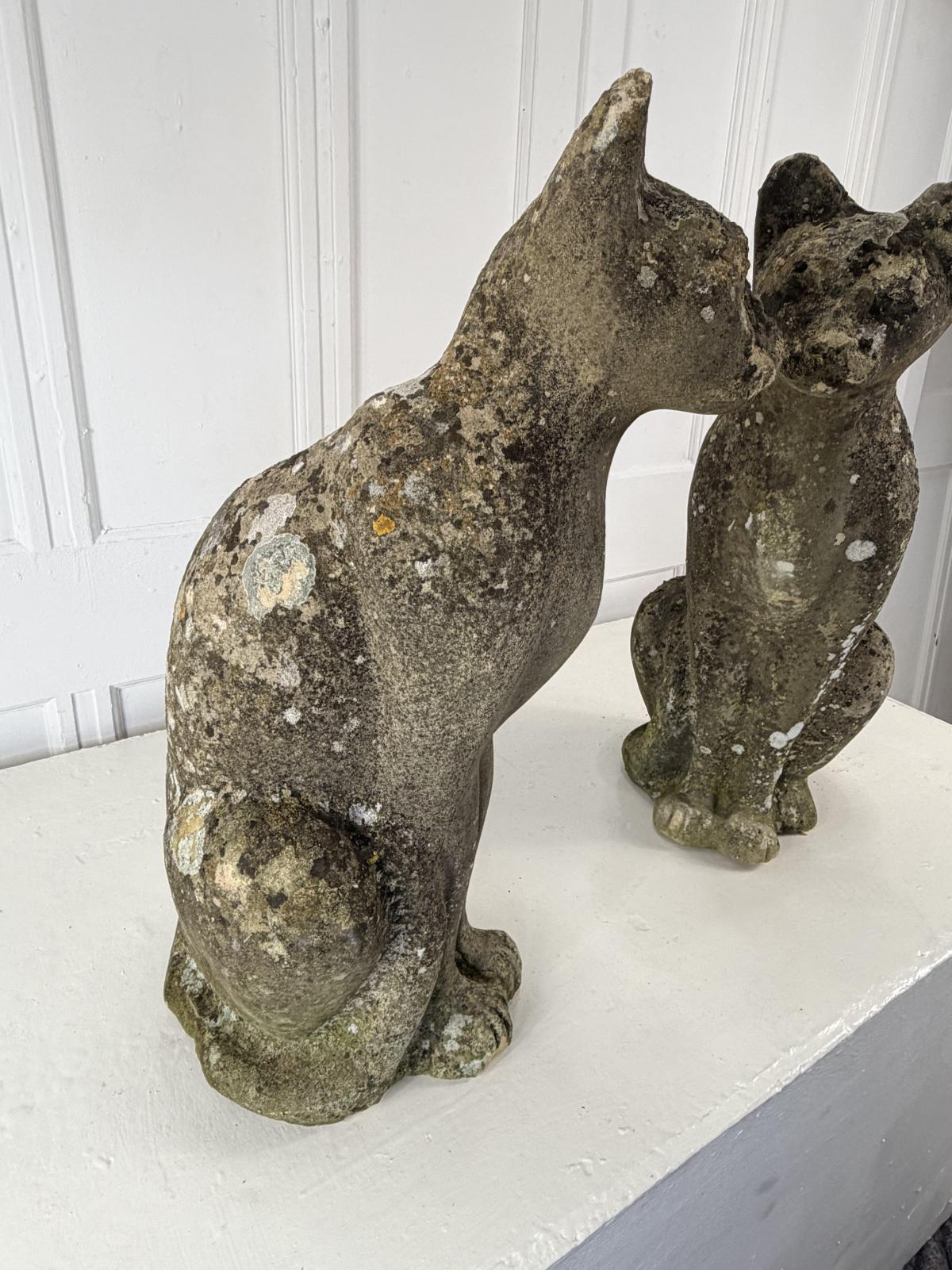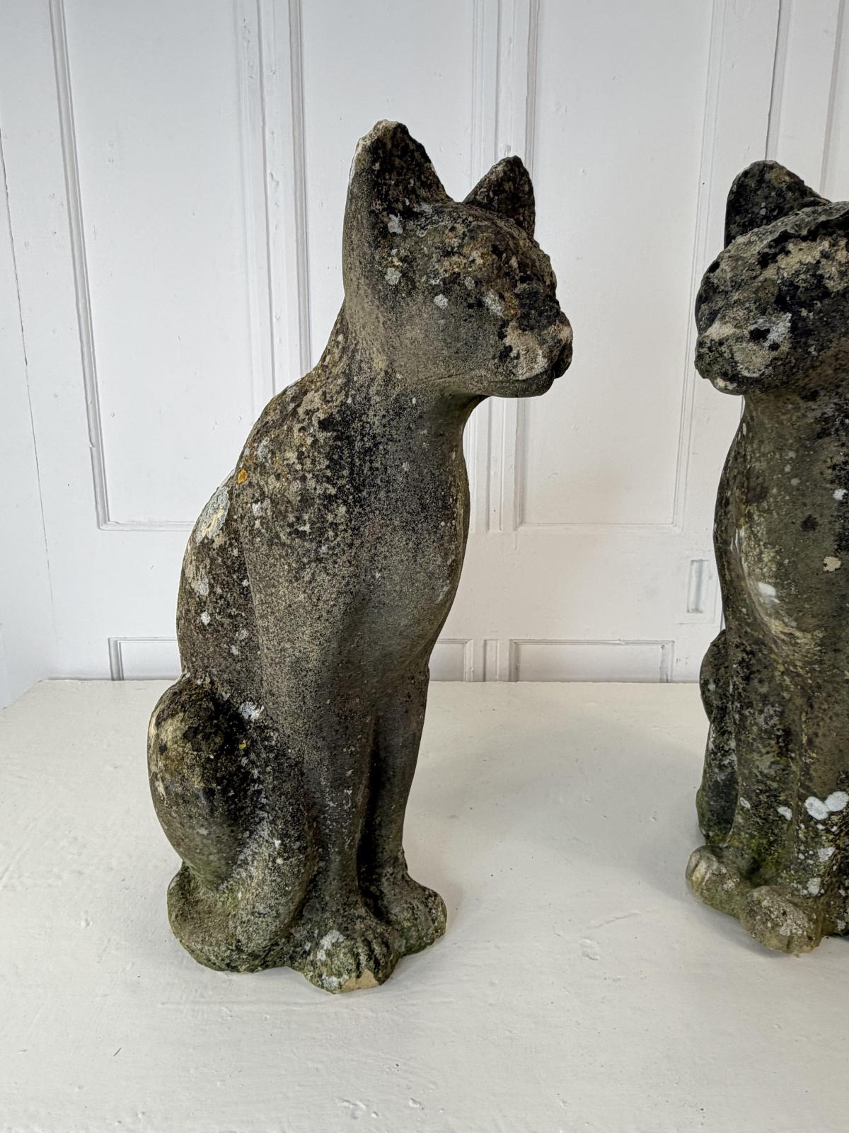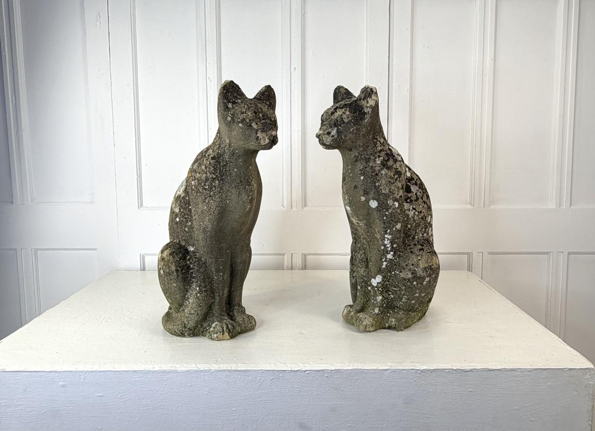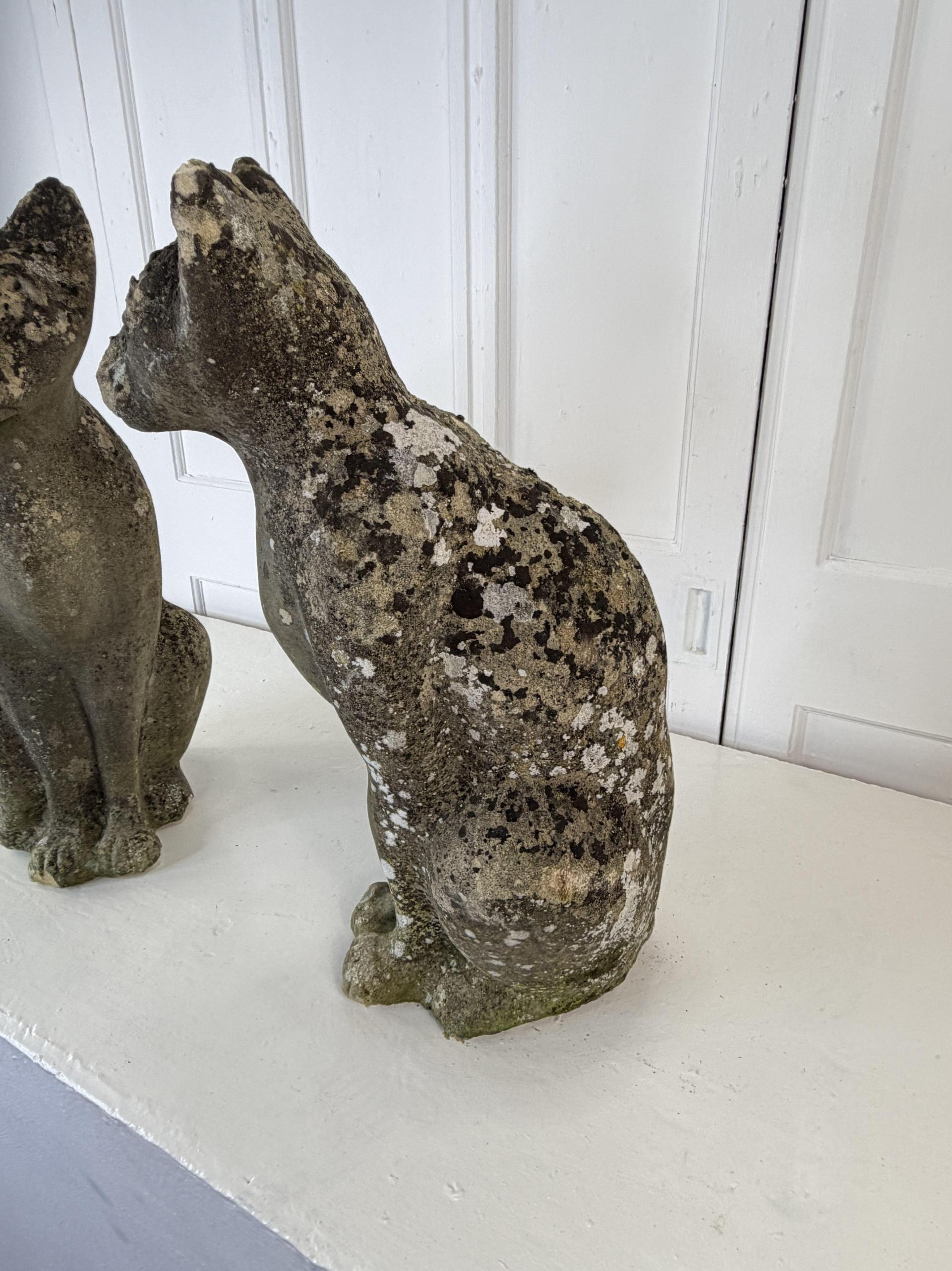 A very decorative, nicely weathered pair of recon stone cat statues.