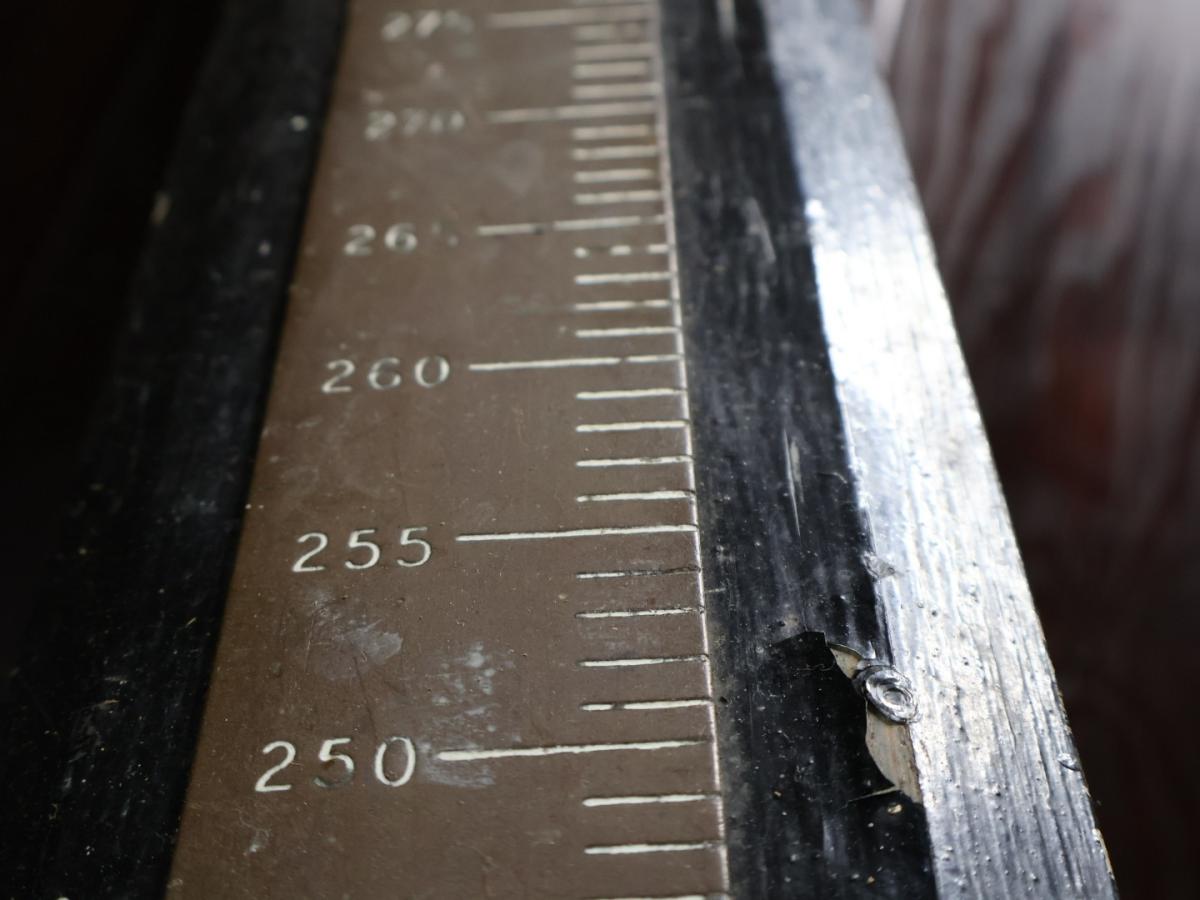 A huge, period, solid brass rule stretching to 339cm.