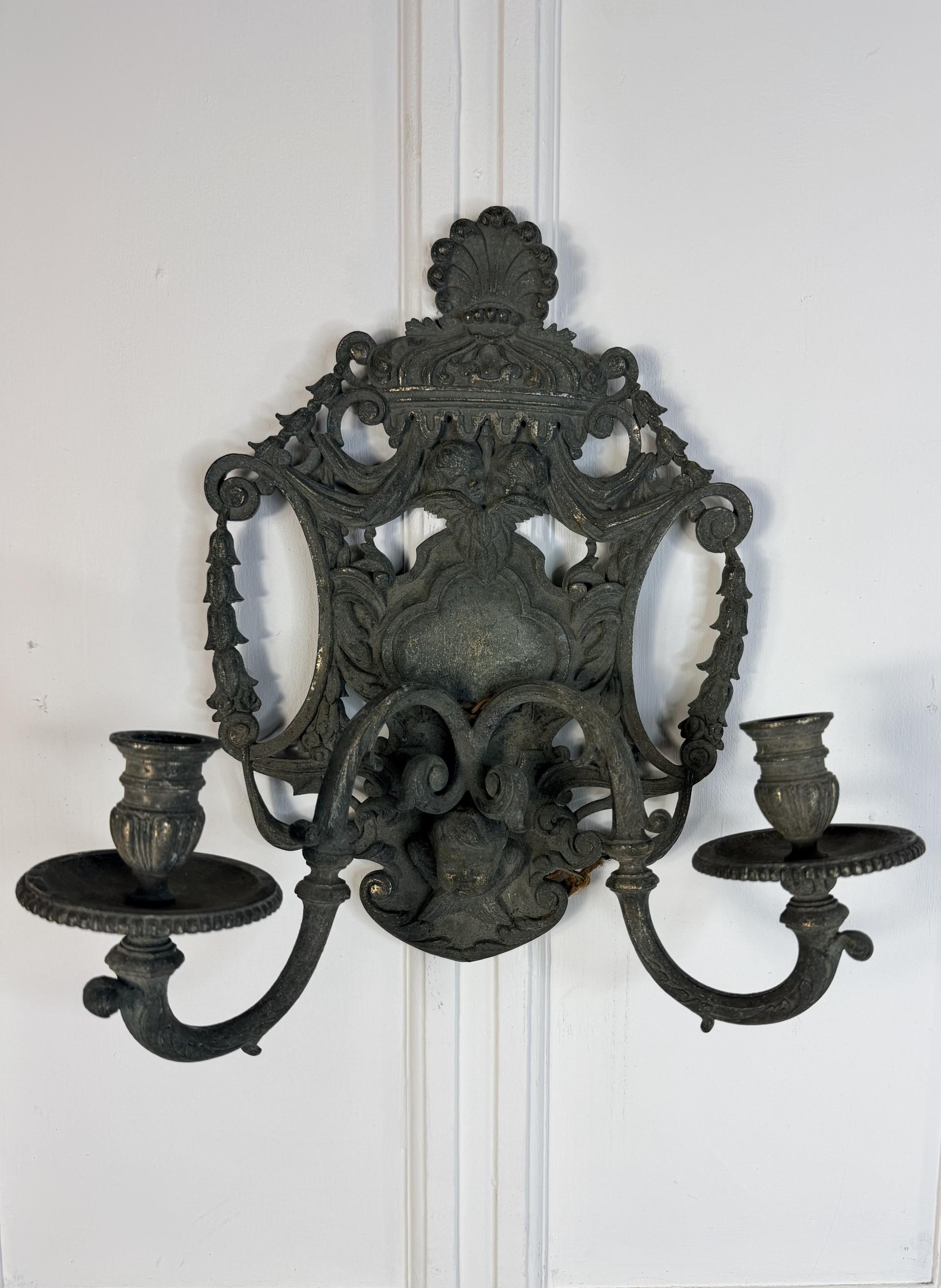 A very decorative, 1900s English, solid brass wall sconce, rewired upon sale.