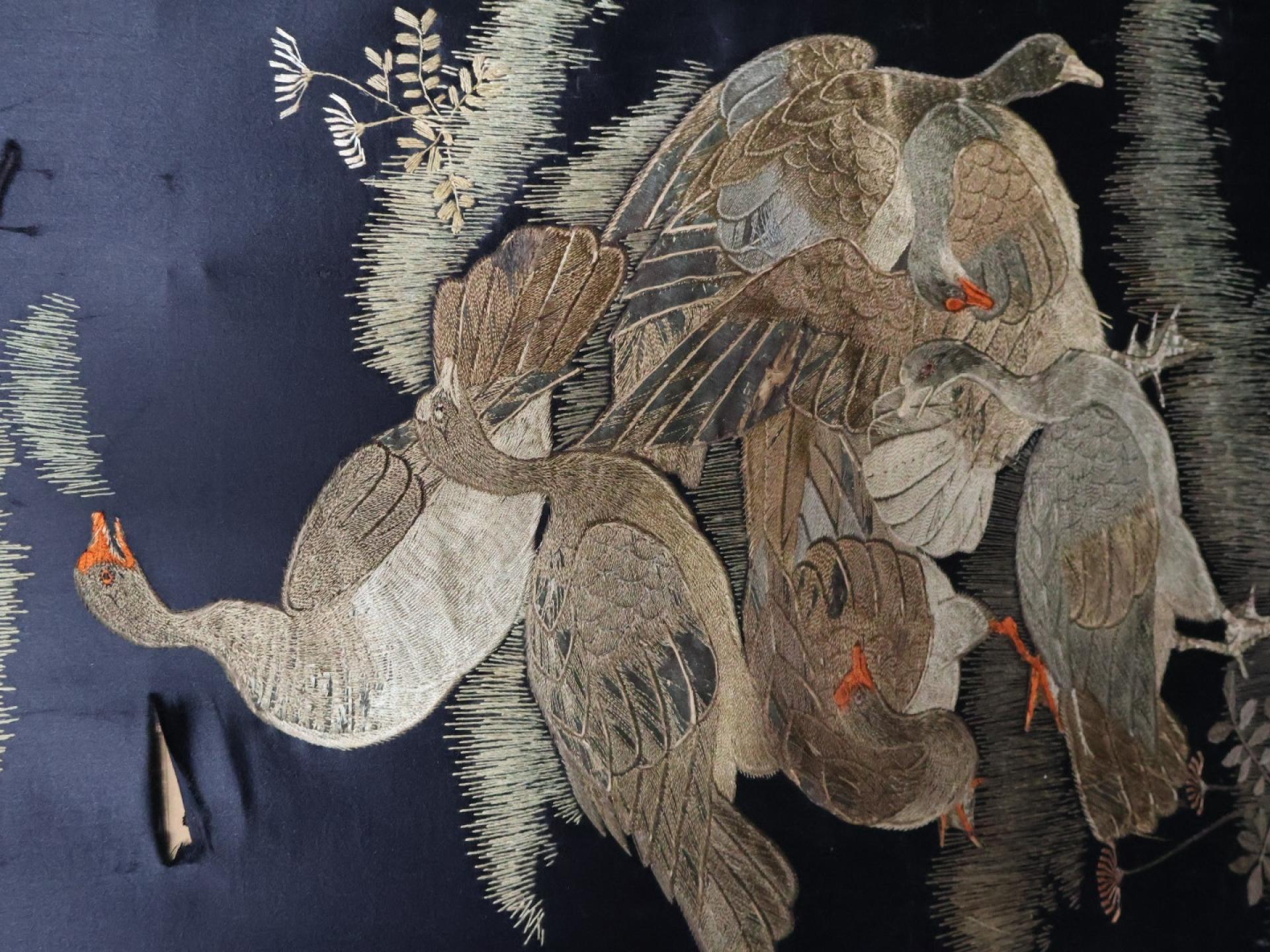 4 silk, c1900s, chinoiserie panels depicting geese and birds.