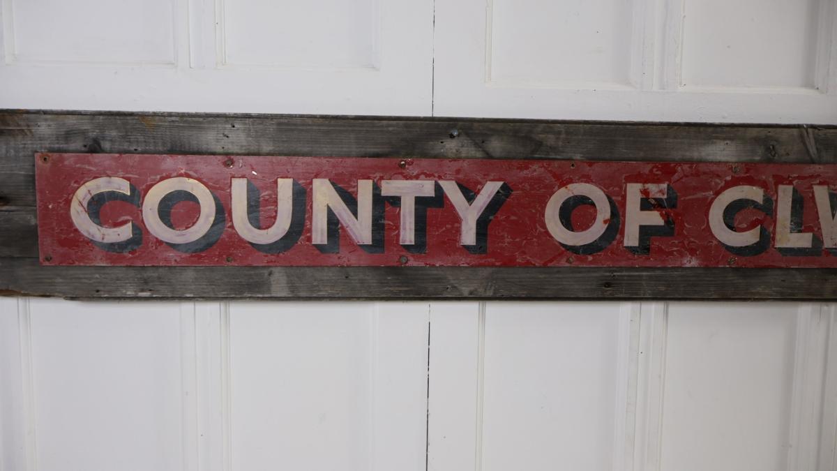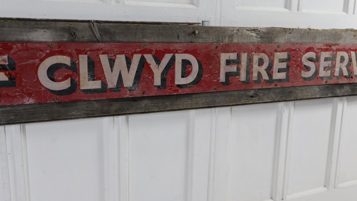 A decorative, long, hand painted tin sign mounted on its original wooden plank for the county of Clwyd fire service.