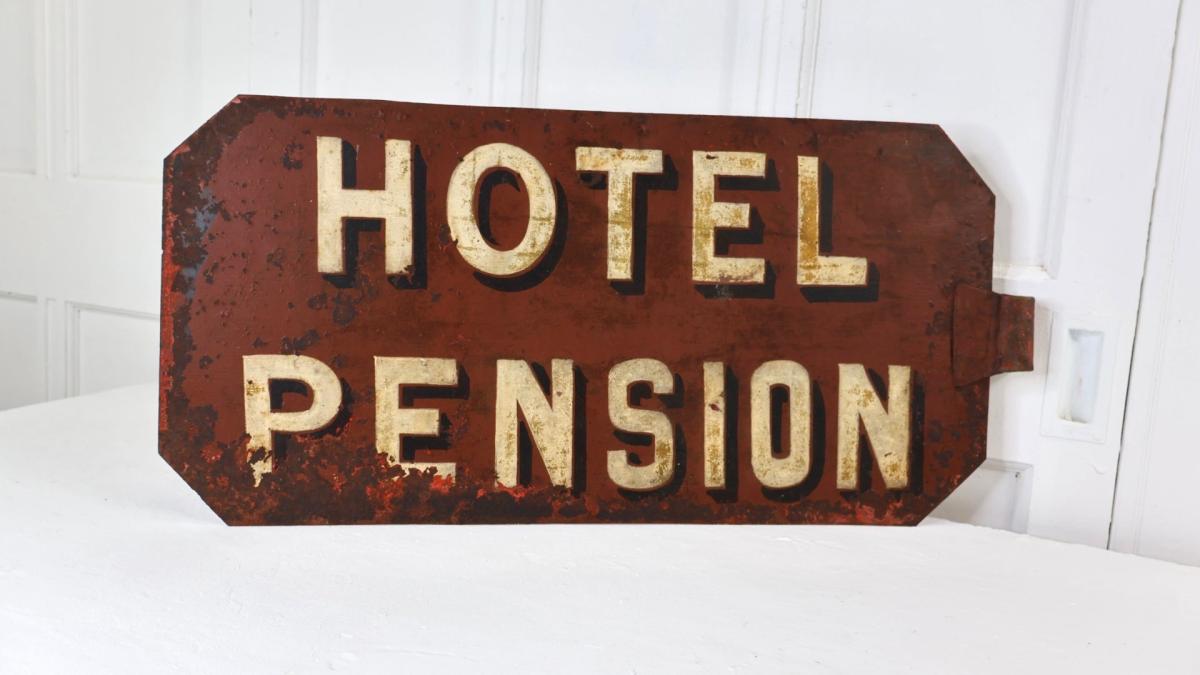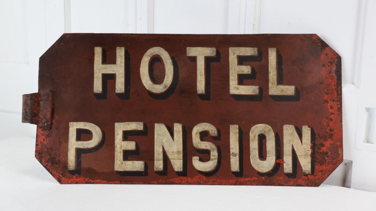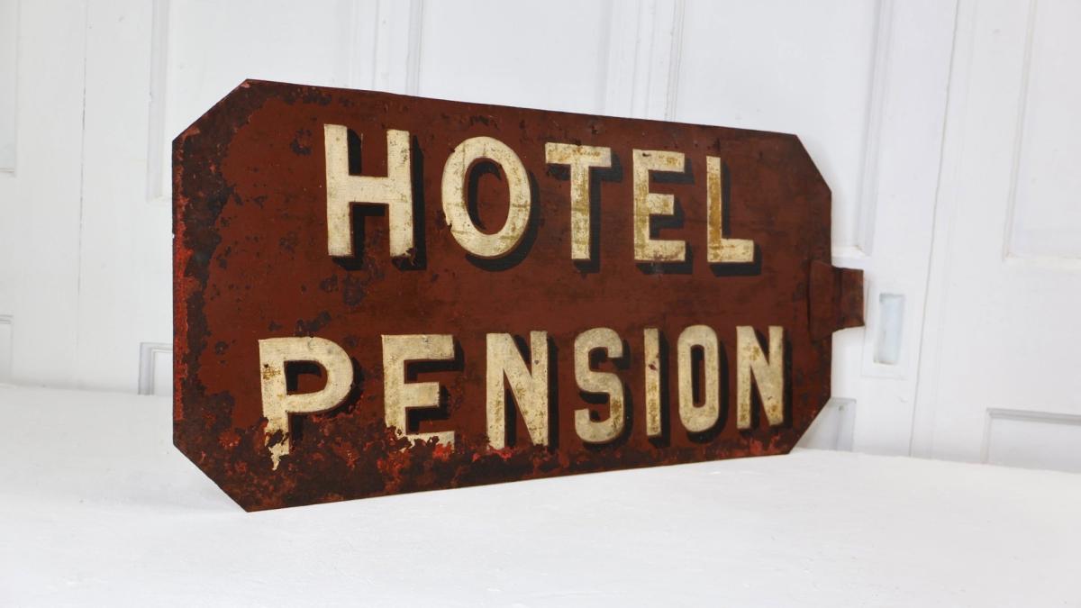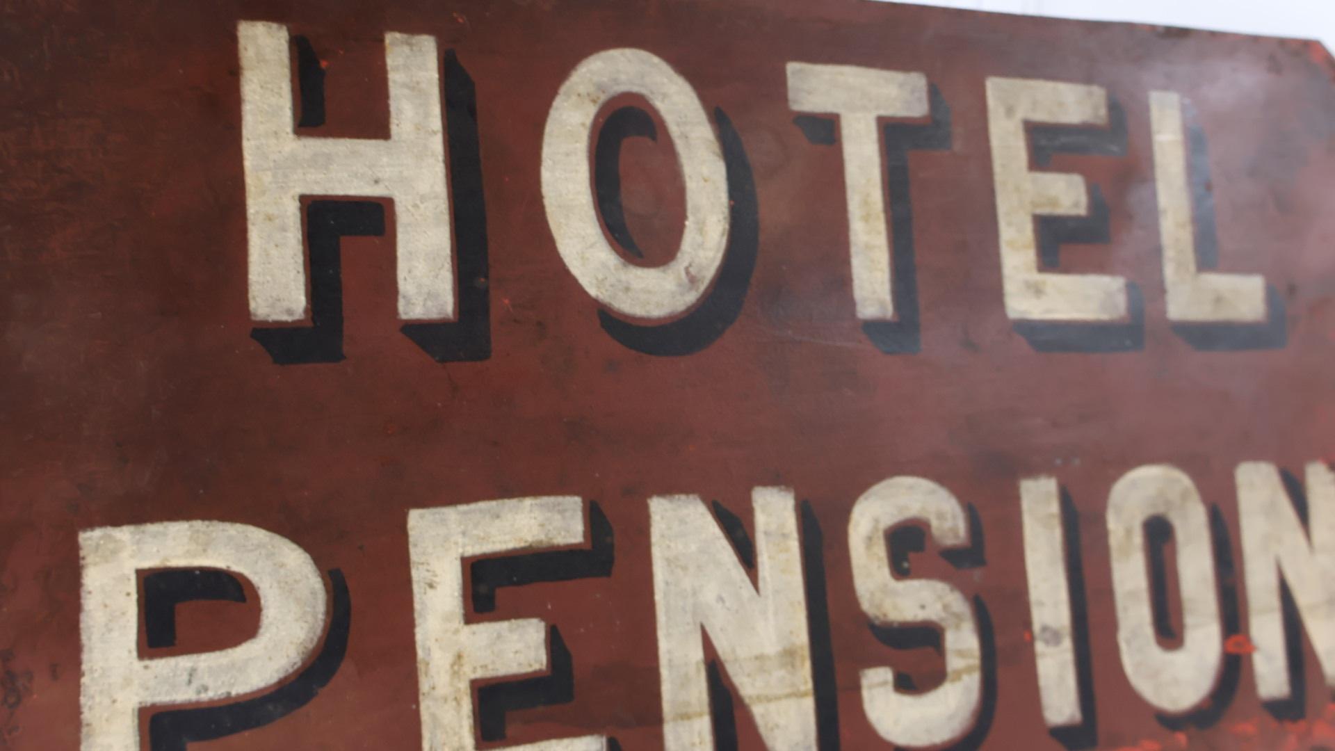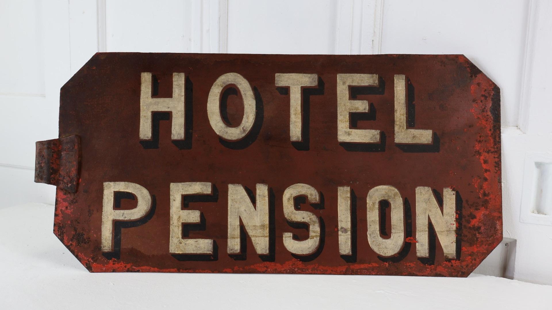 An early 1900s hand painted metal sign for Hotel Pensions.