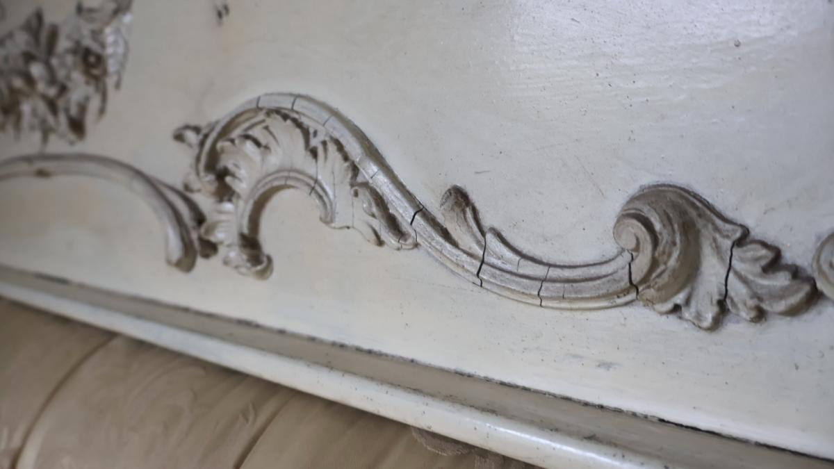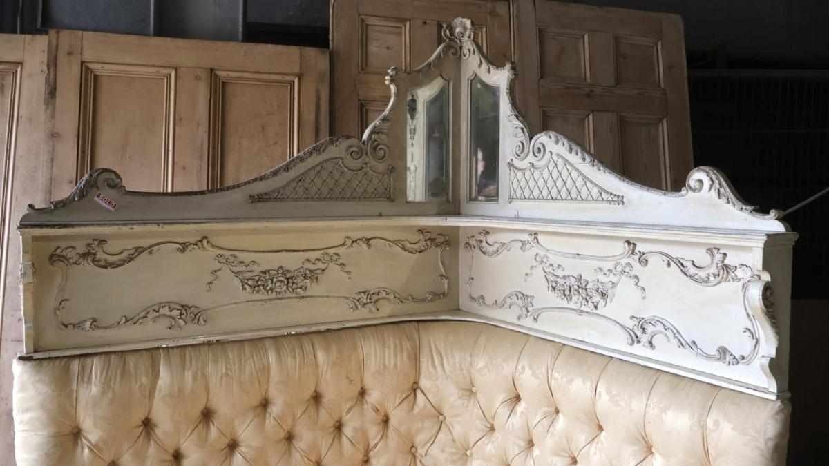 With a decorative wooden pediment with 2 bevelled mirror inserts.