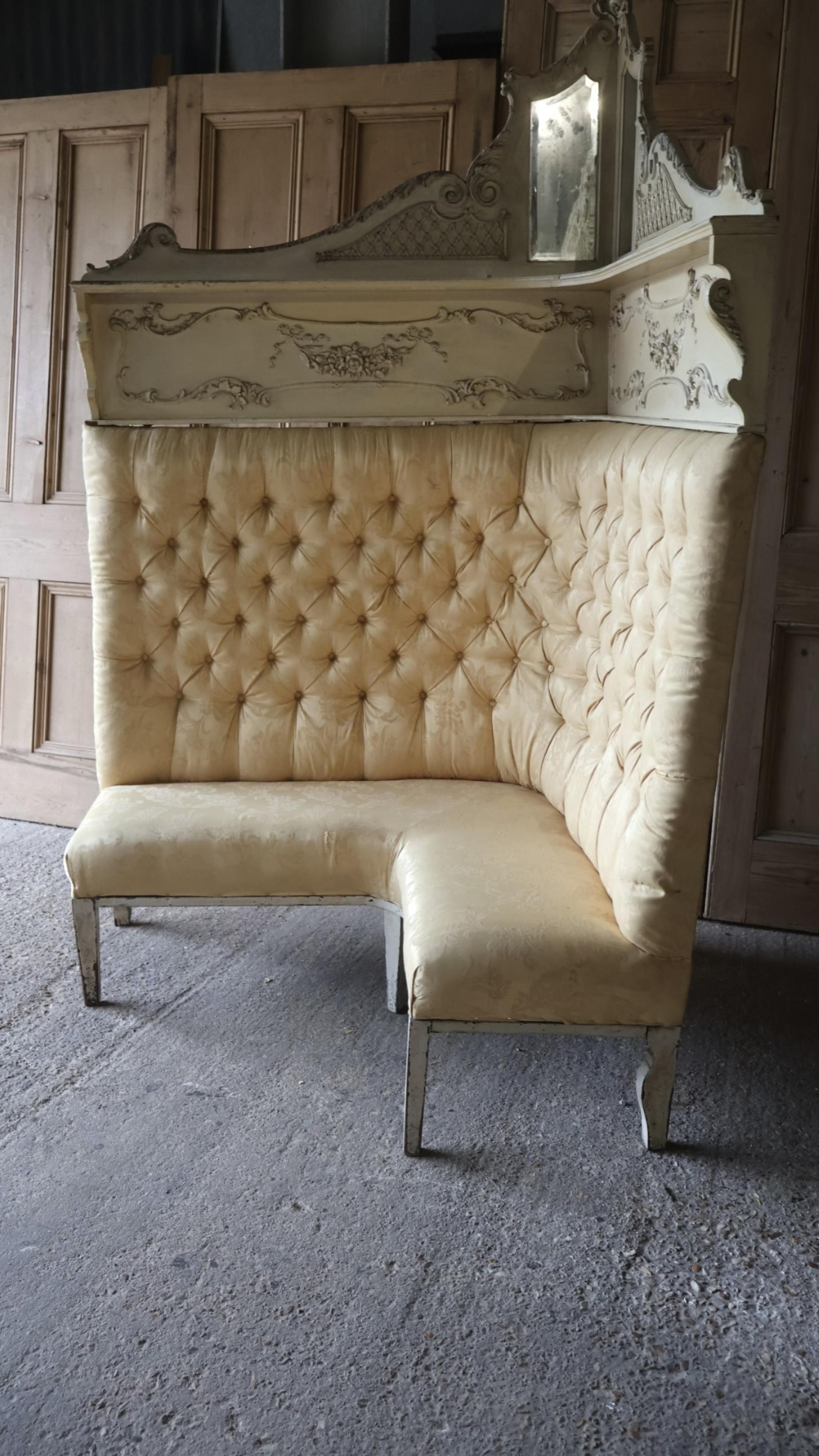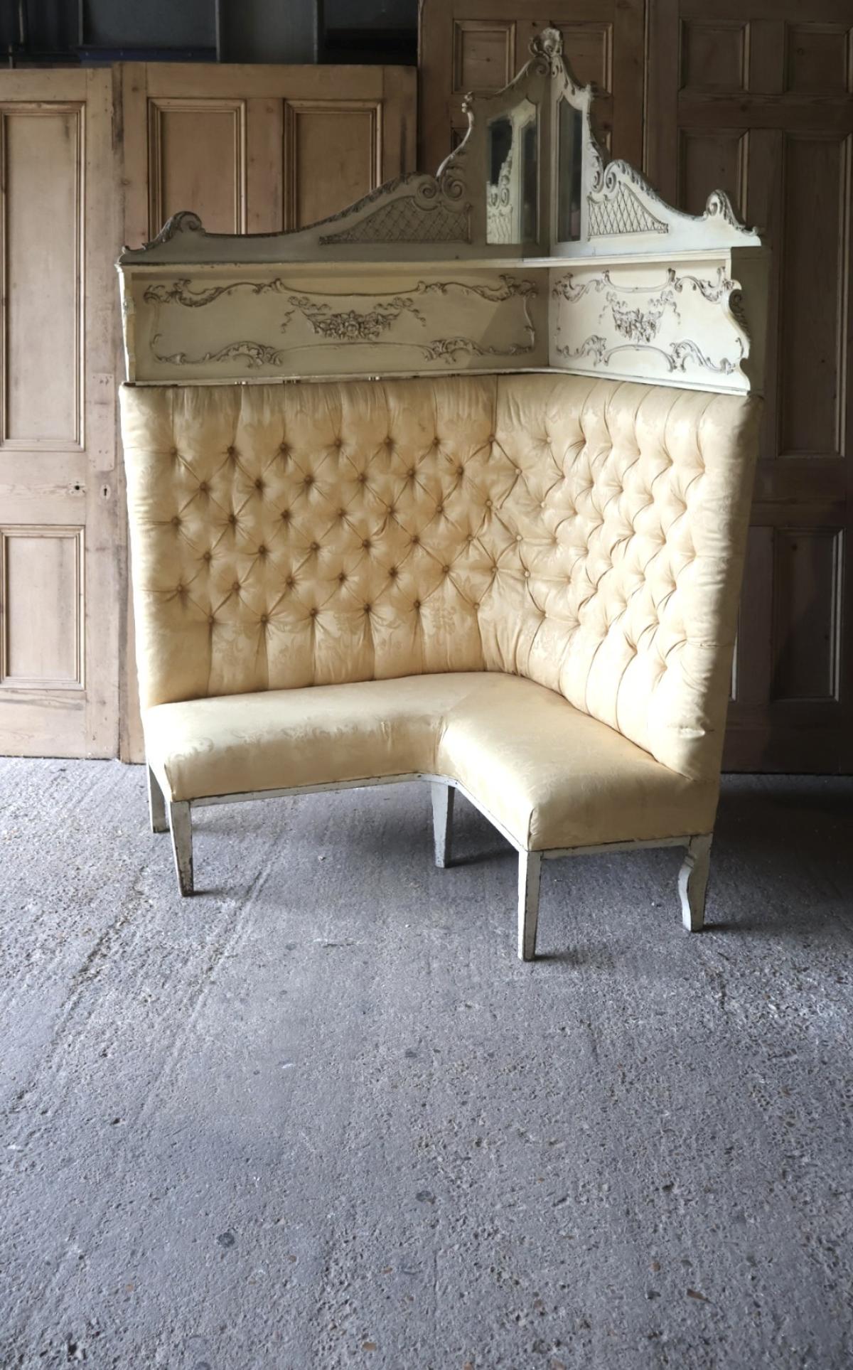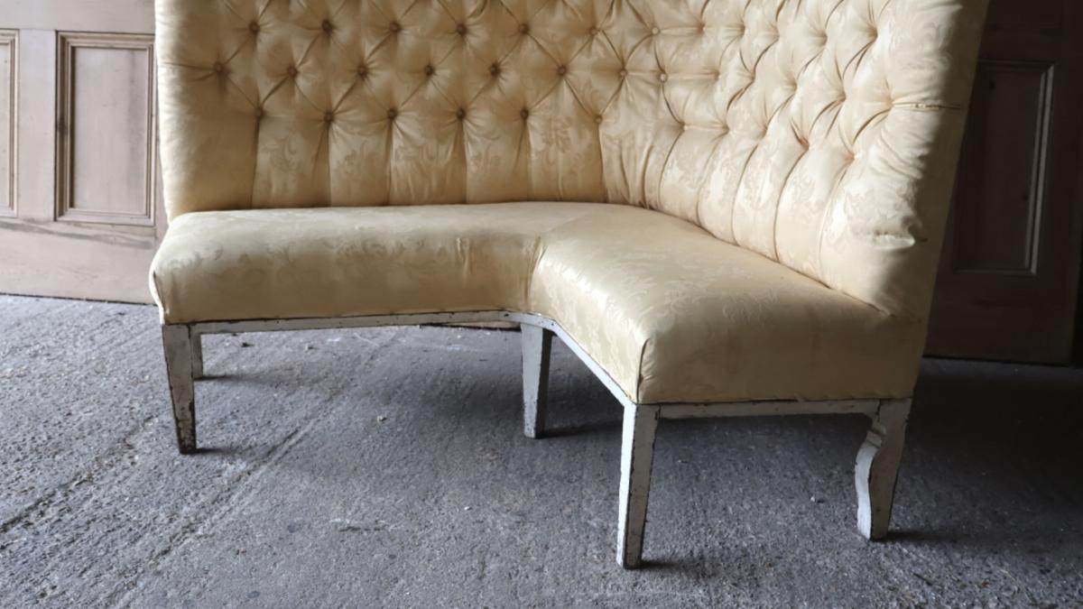 Salvaged from a French gentleman’s club in Paris, a corner button back sofa in its original yellow fabric.