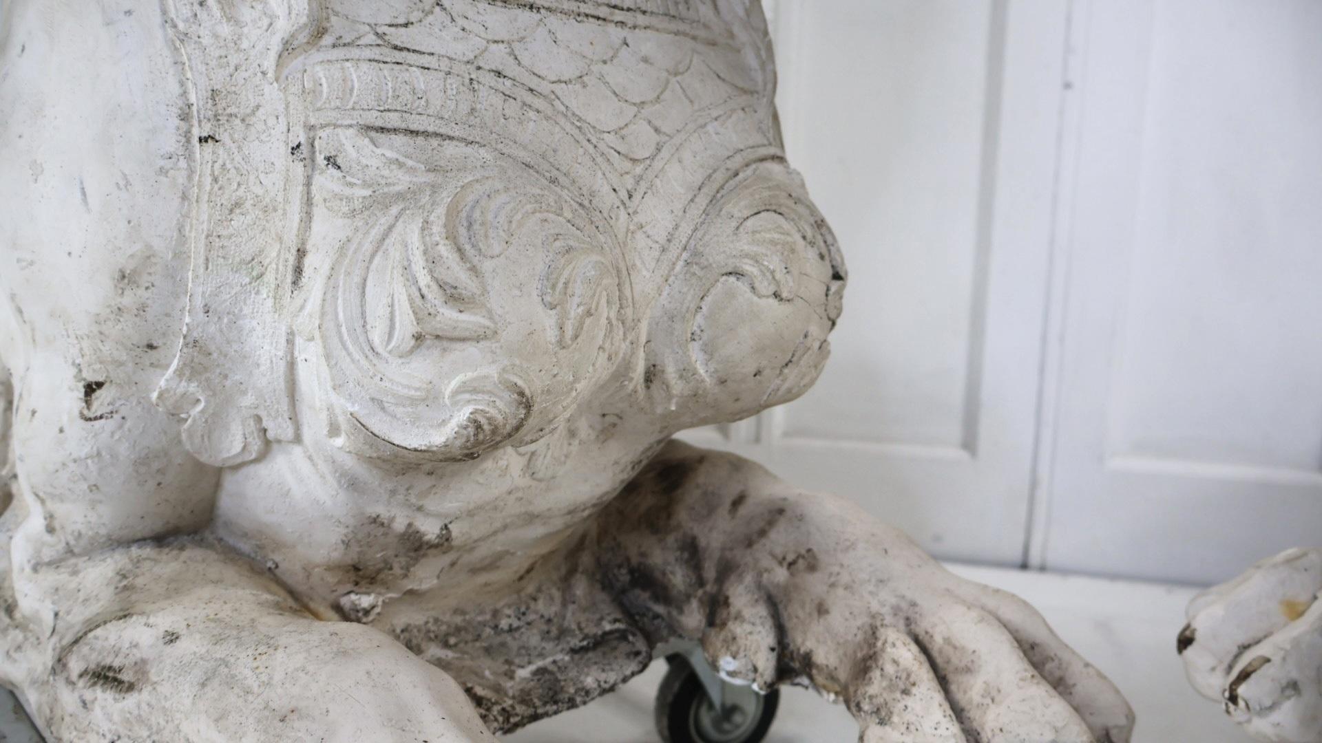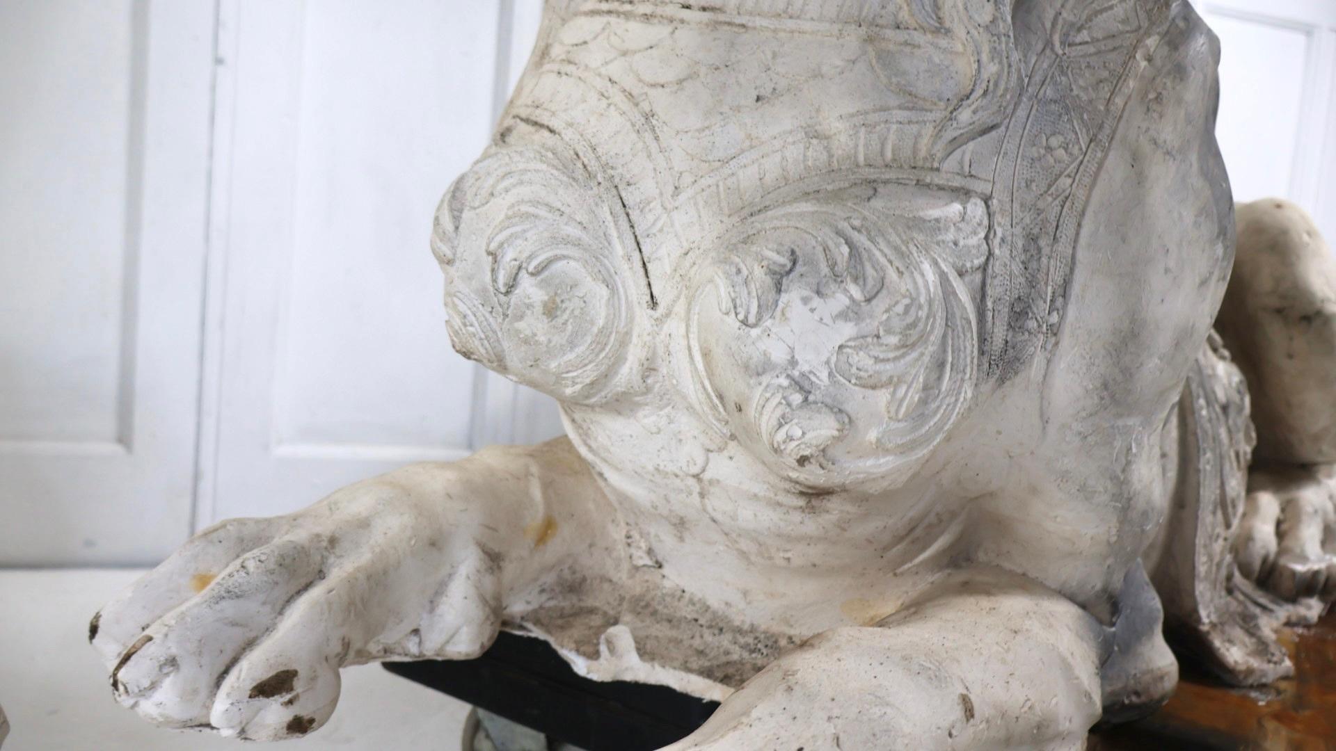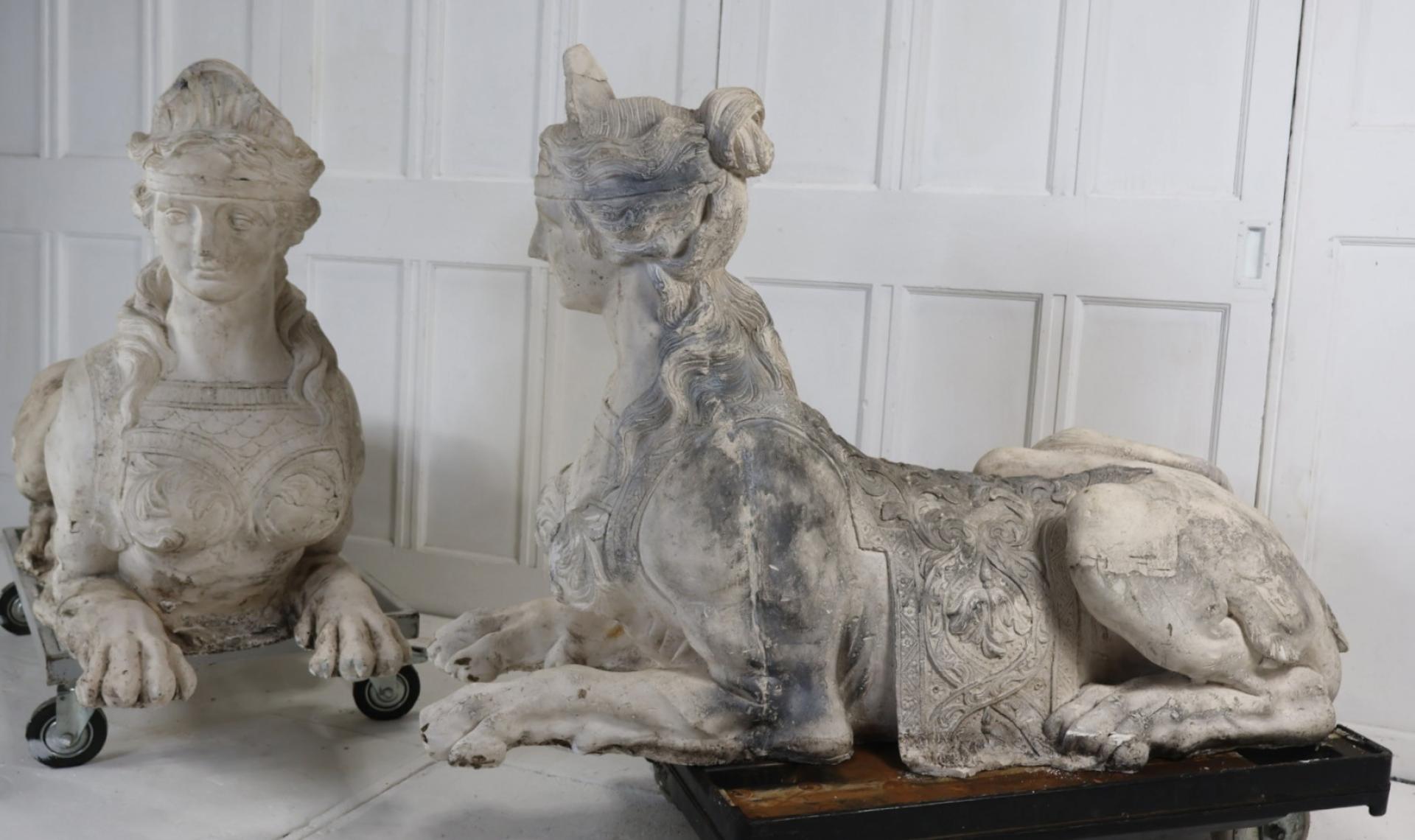 A pair of incredibly decorative large solid plaster sphinx, in the manner and style of 19thc England and Provence, France.