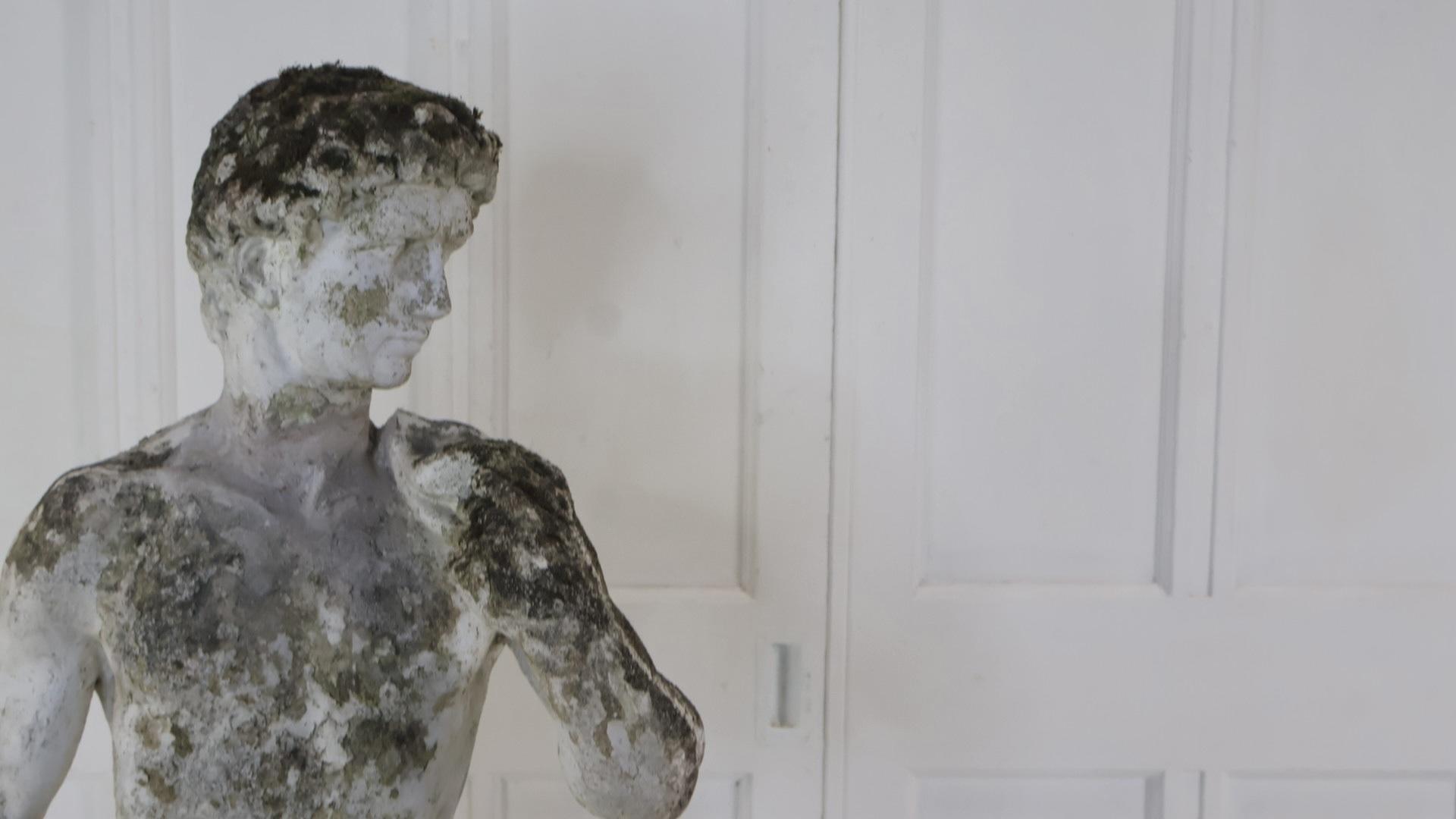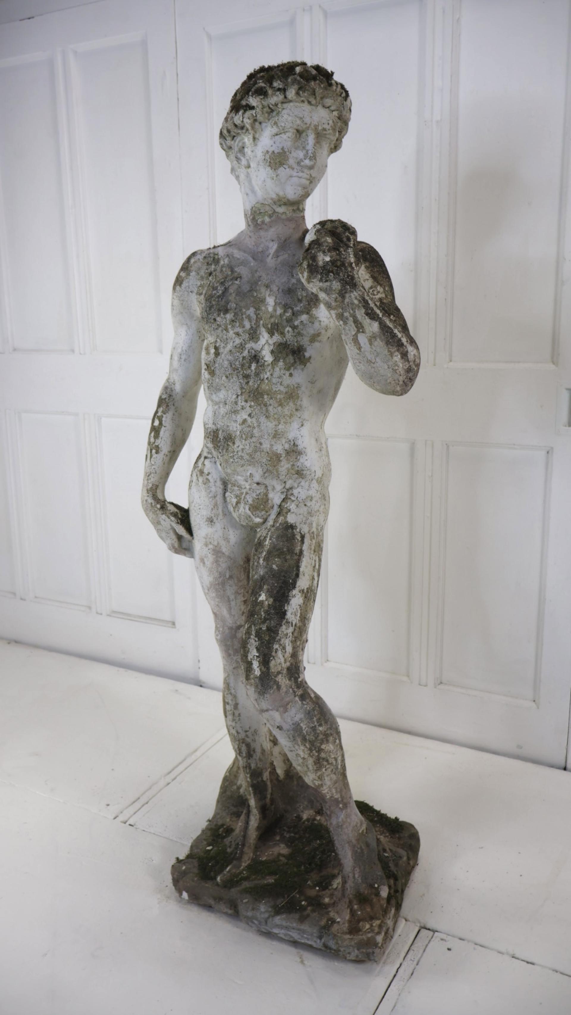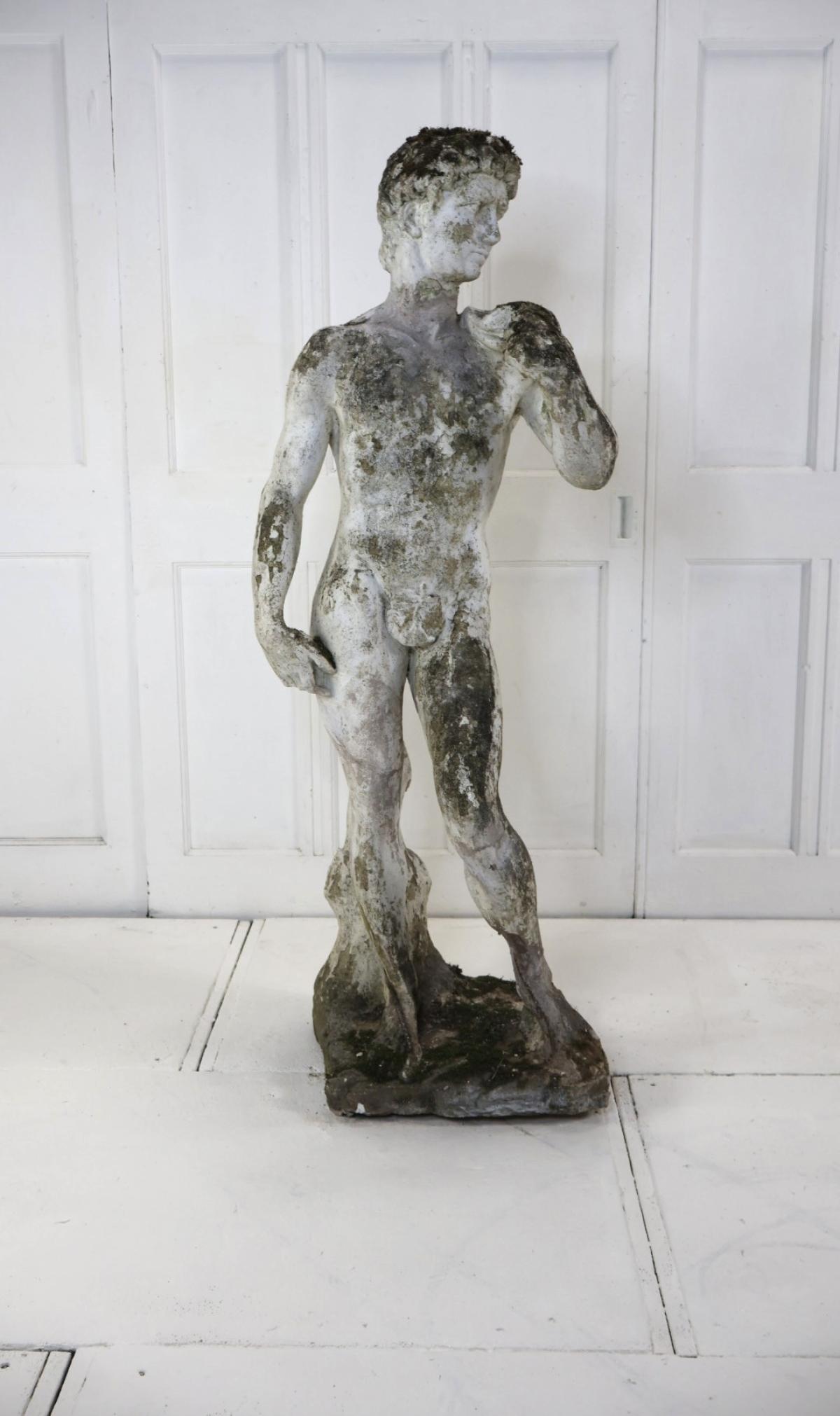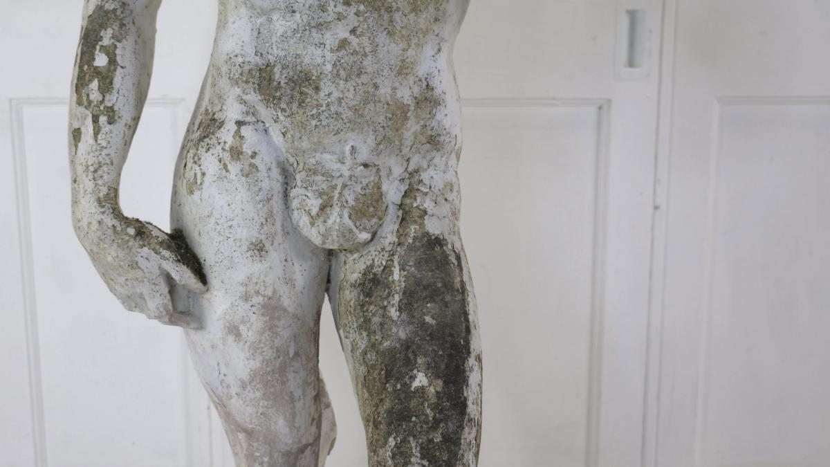 A decoratively weathered, reconstructed stone statue of Michelangelo’s iconic Renaissance sculpture of David.