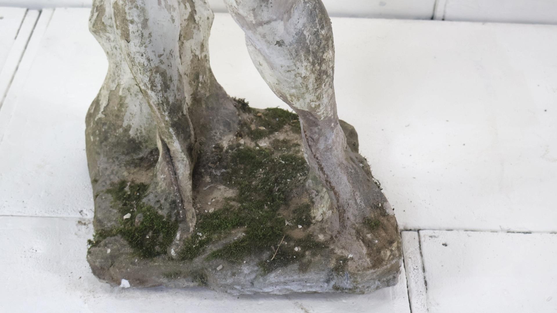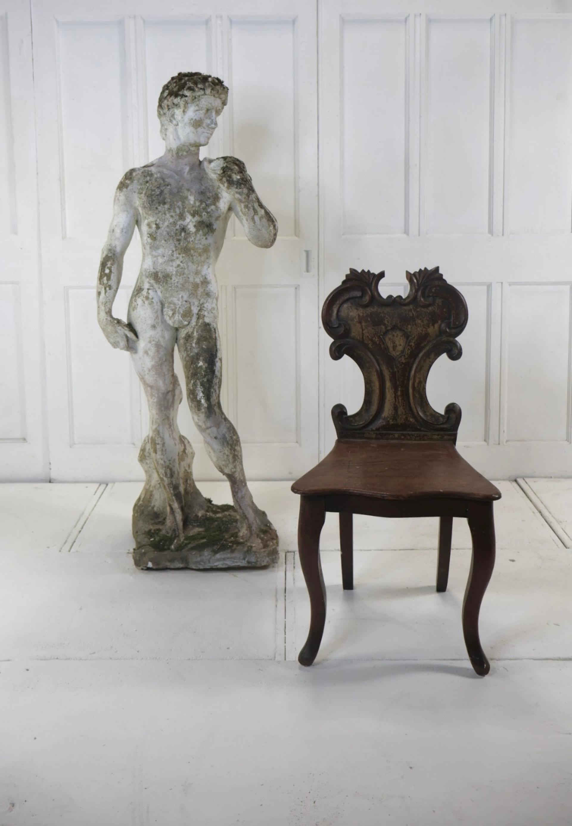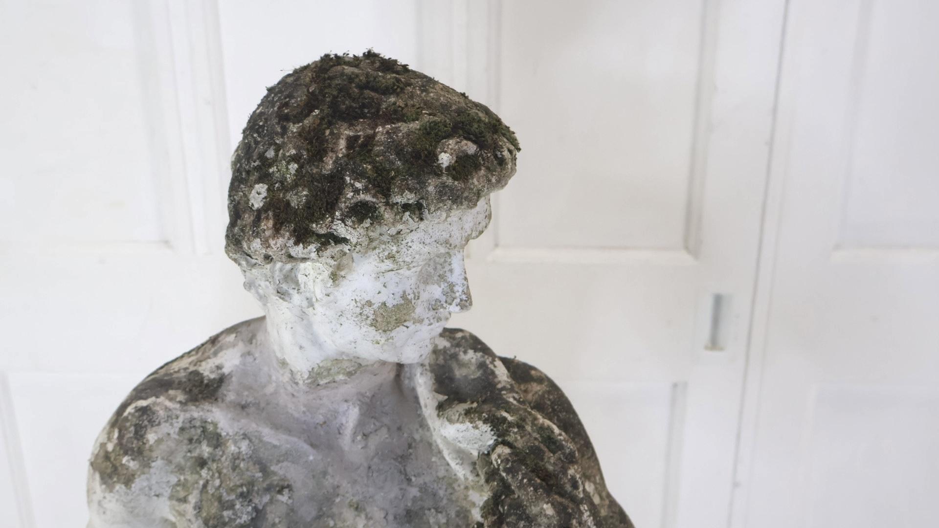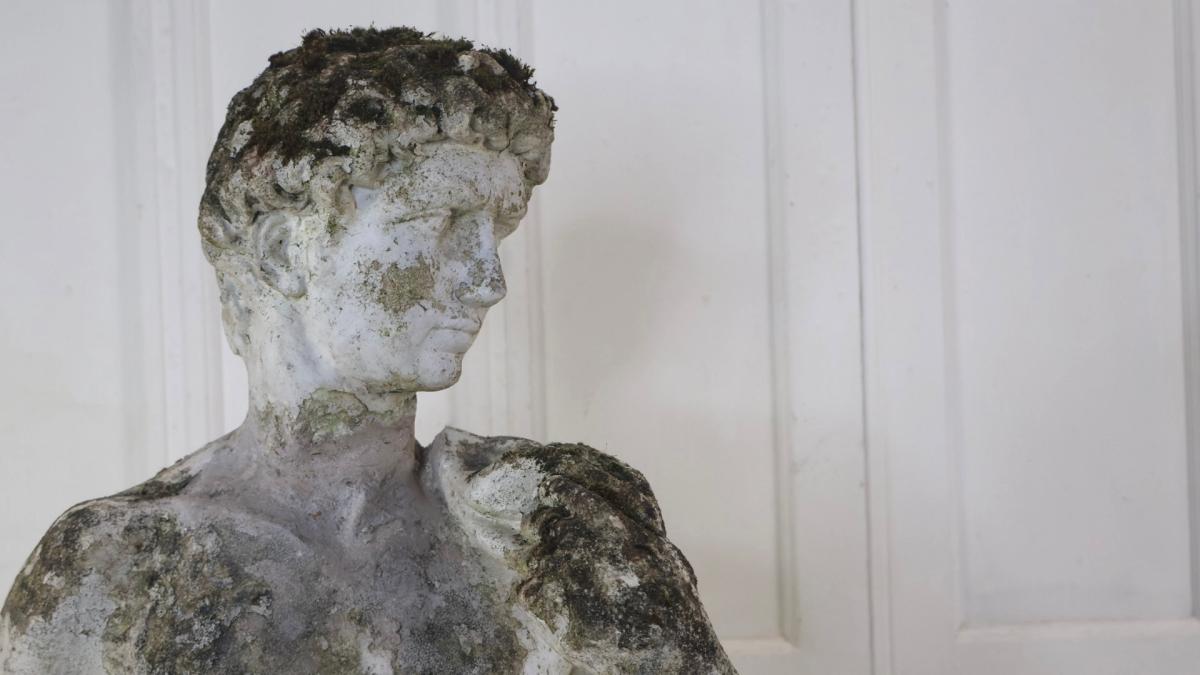 A decoratively weathered, reconstructed stone statue of Michelangelo’s iconic Renaissance sculpture of David.