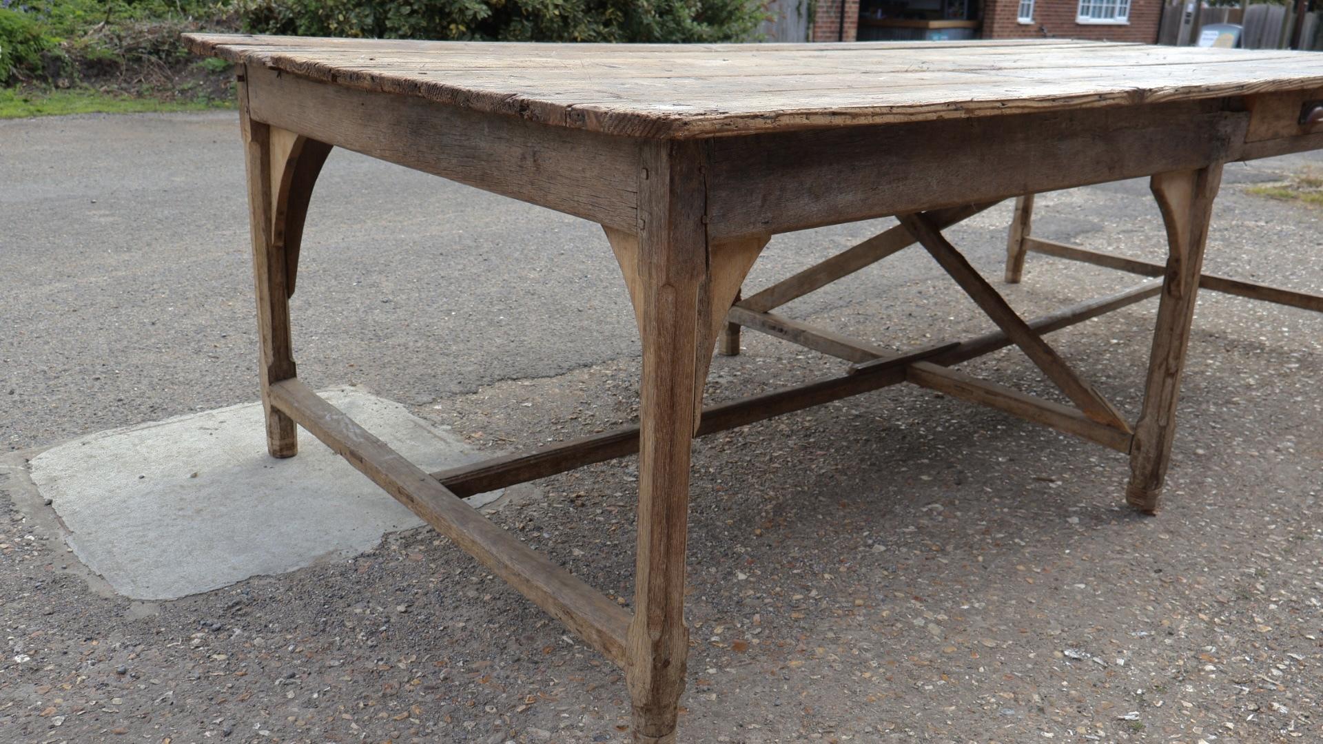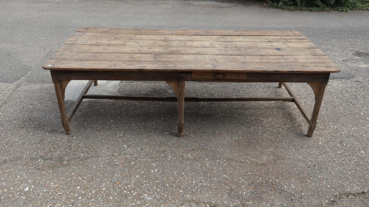 An early 1800s, English, pine and elm dining table, approx 8.5ft x 4 ft wide.