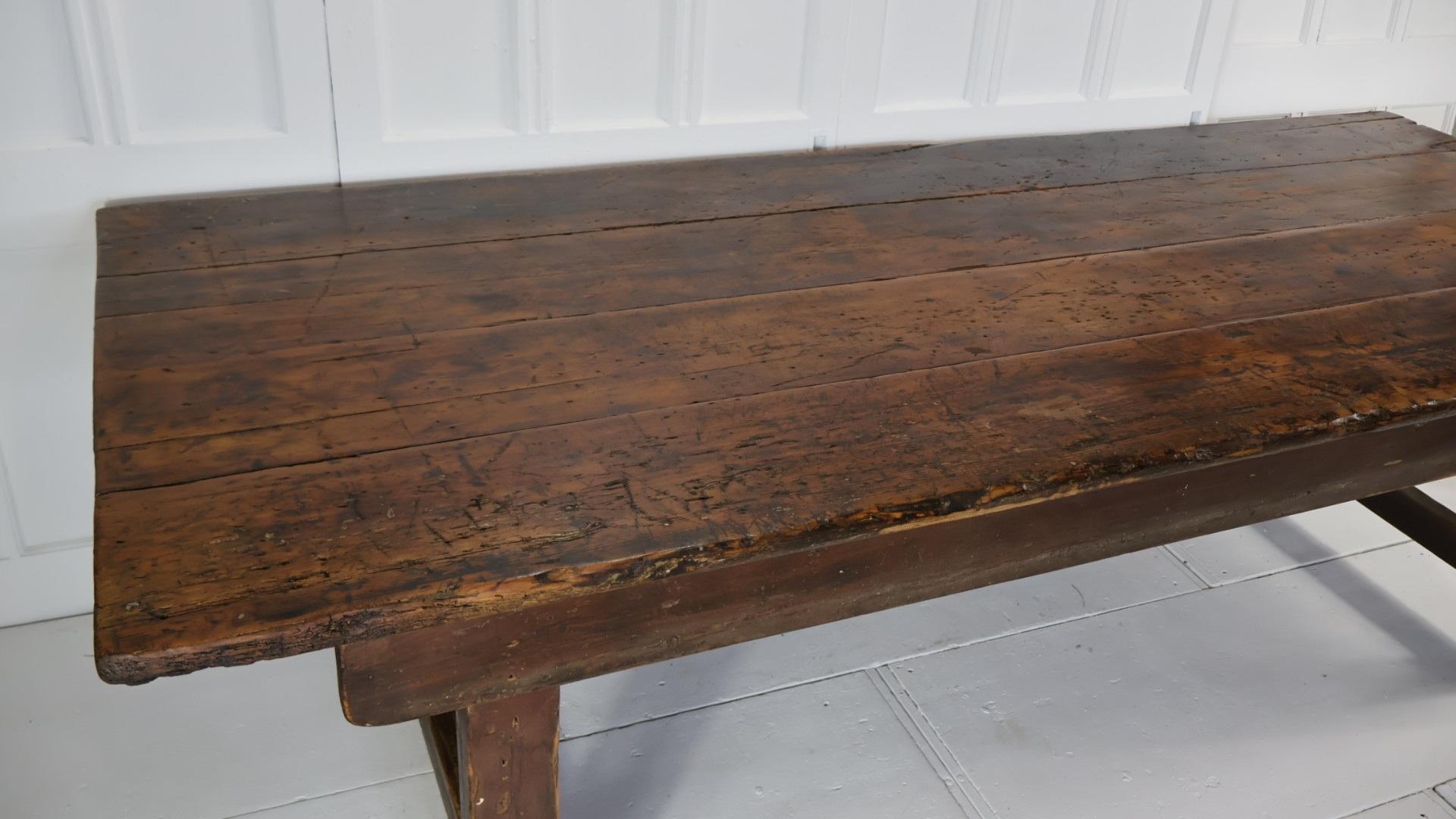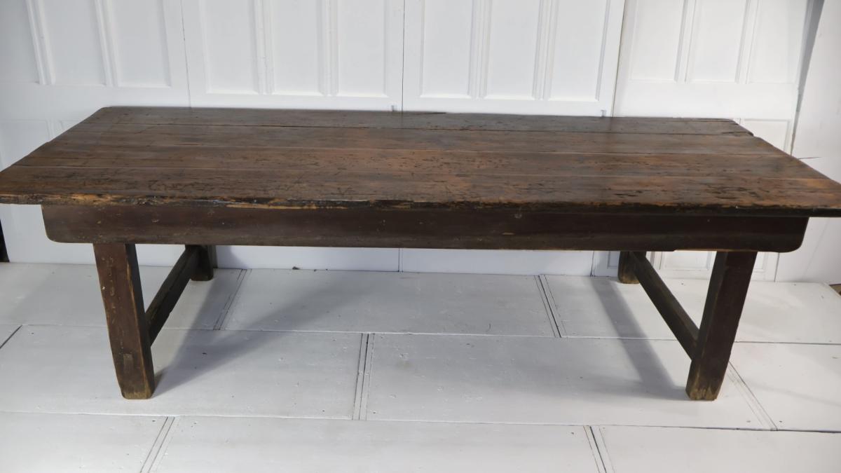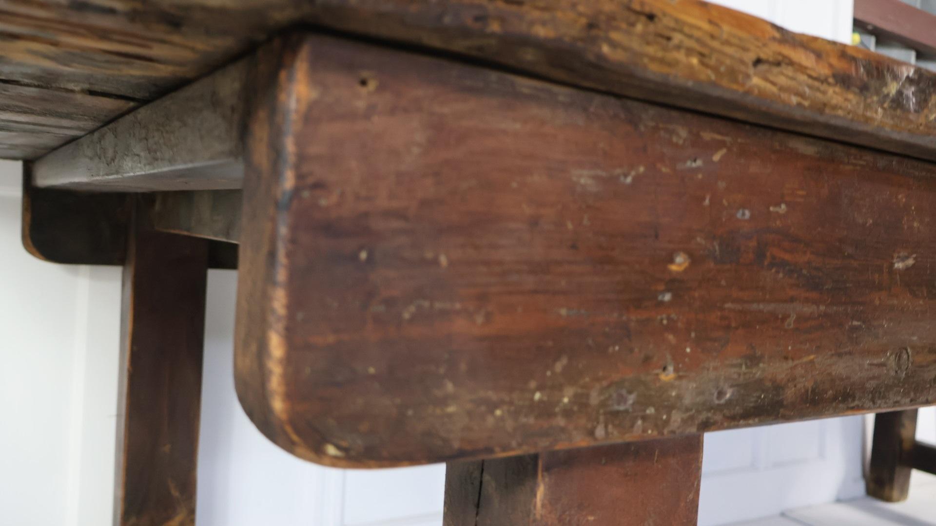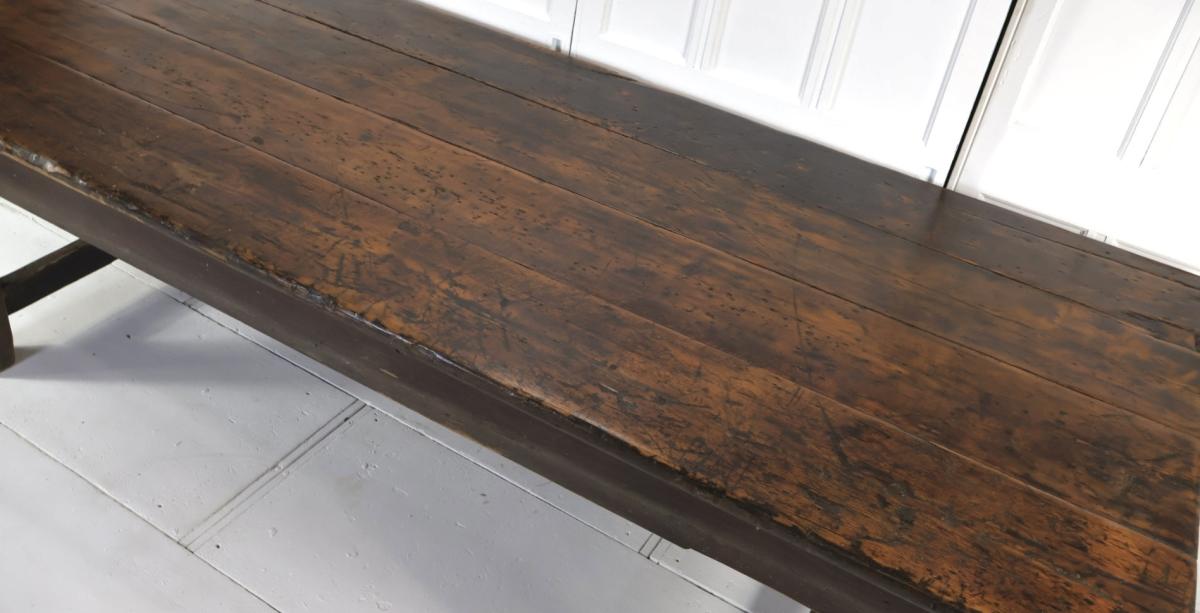 A monumental English farmhouse table, pitch pine and over 9 ft long.