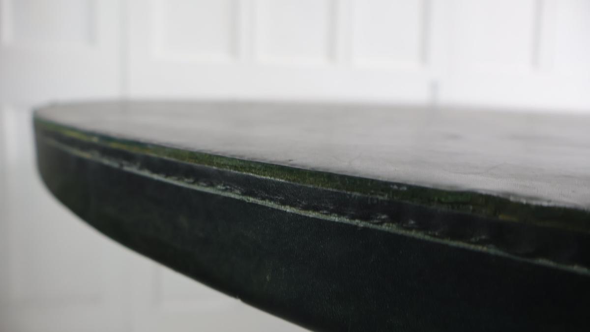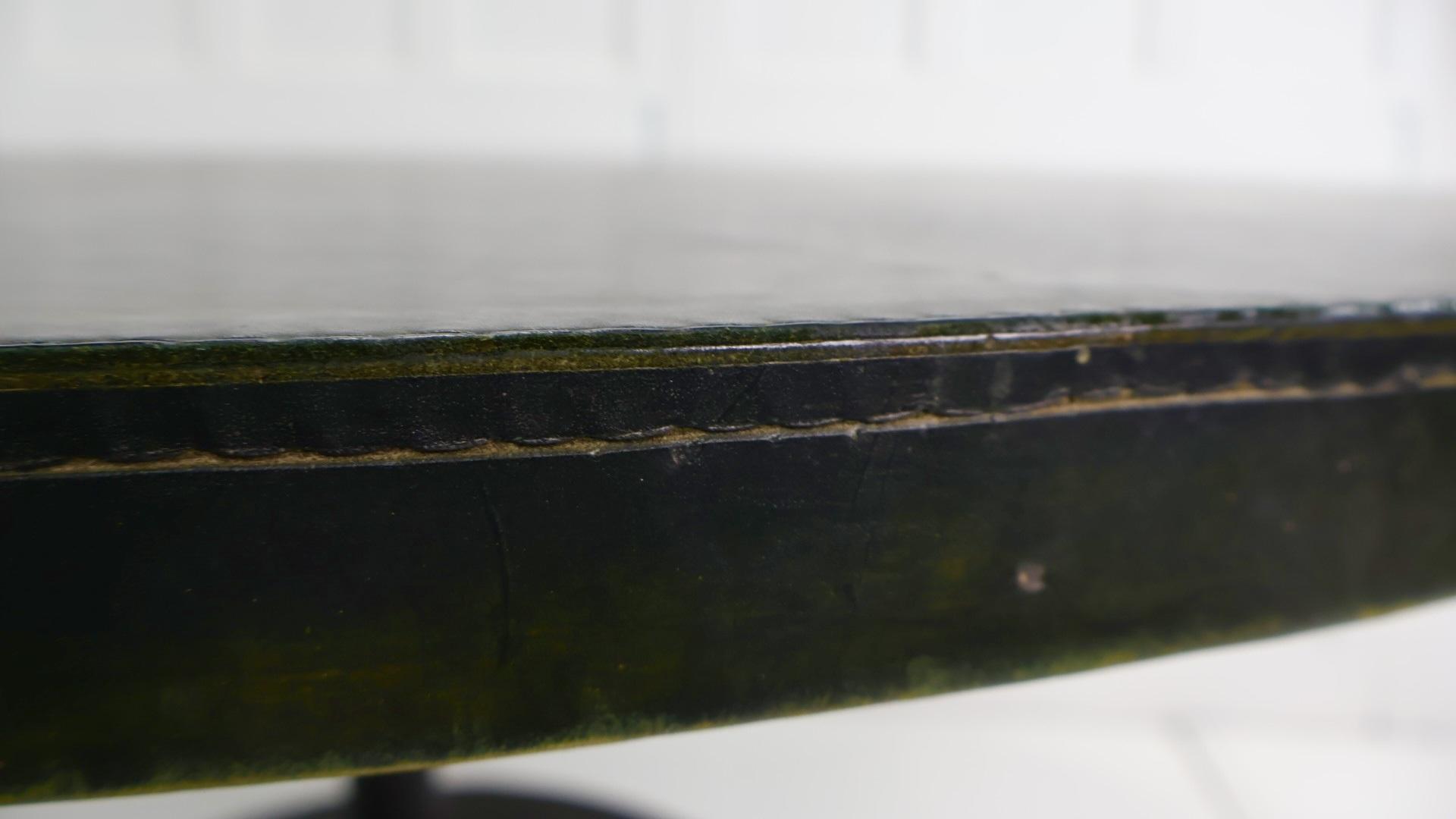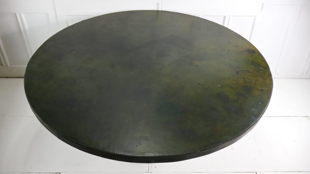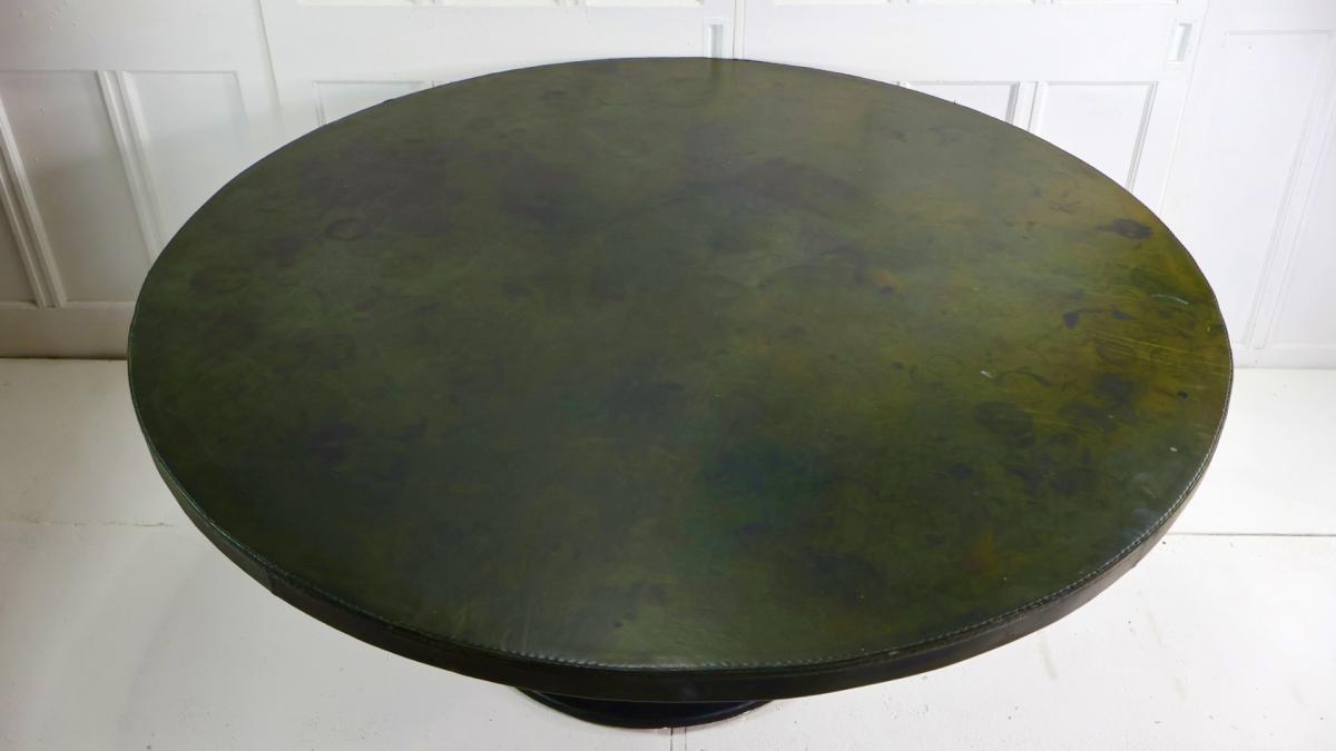 In the style of an Ellipse table, a large 5ft diameter, leather topped dining table with a decorative bottle green mottled colour to the leather.