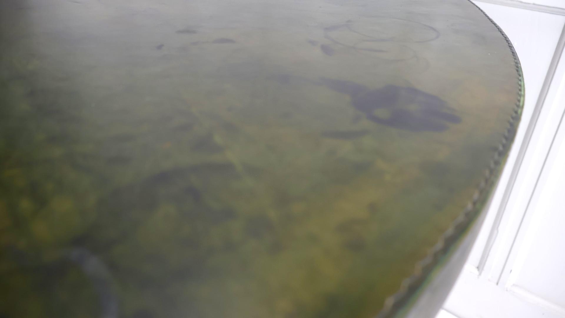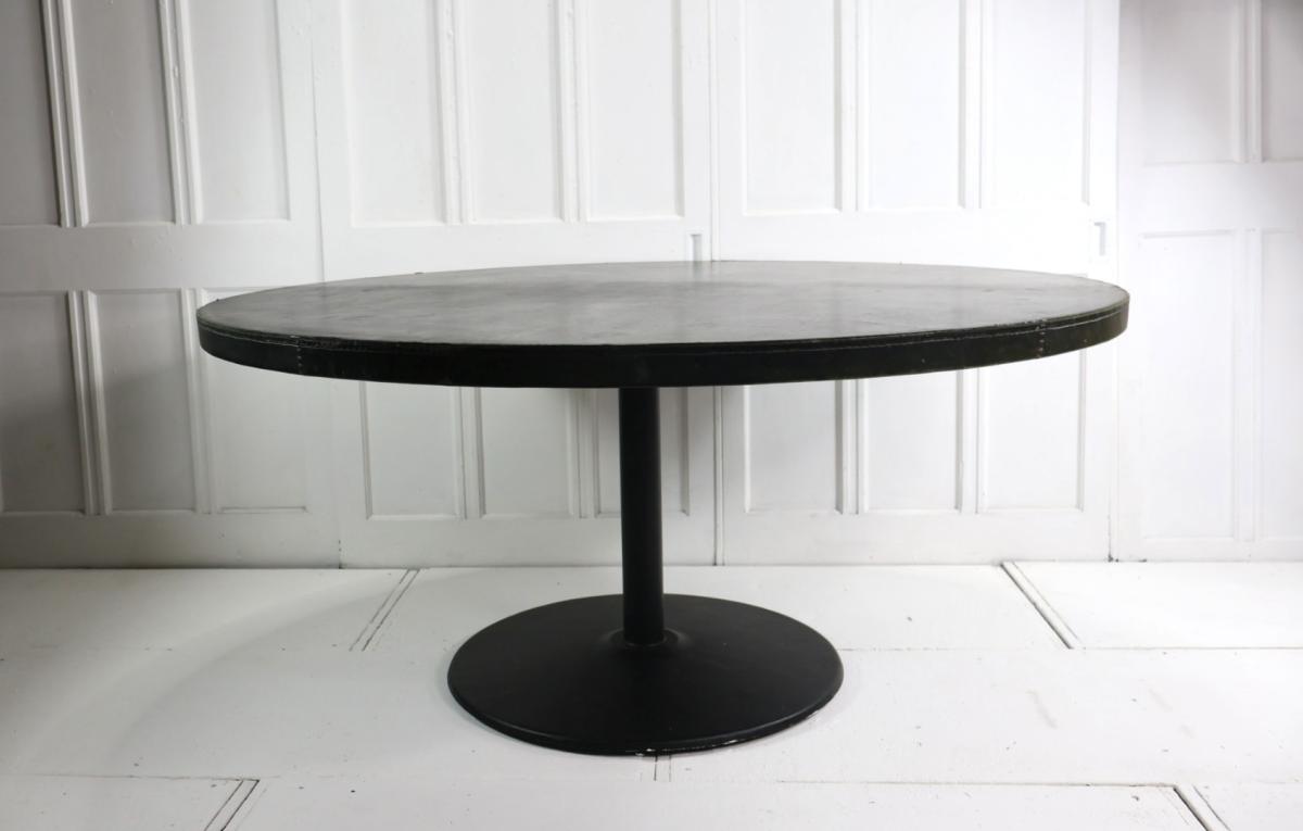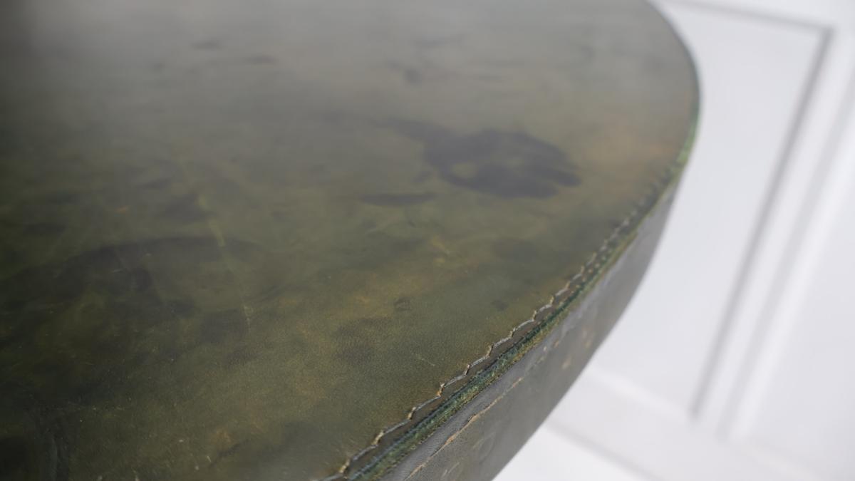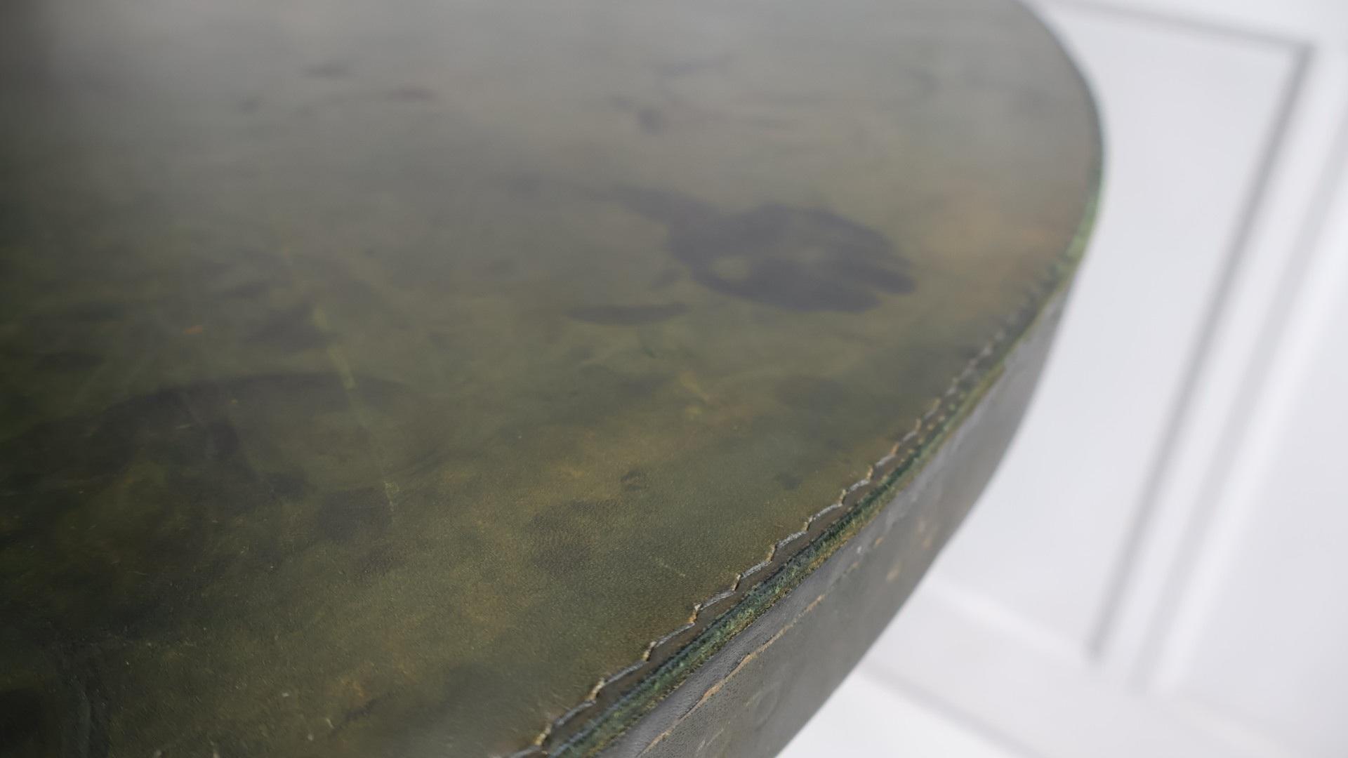 In the style of an Ellipse table, a large 5ft diameter, leather topped dining table with a decorative bottle green mottled colour to the leather.