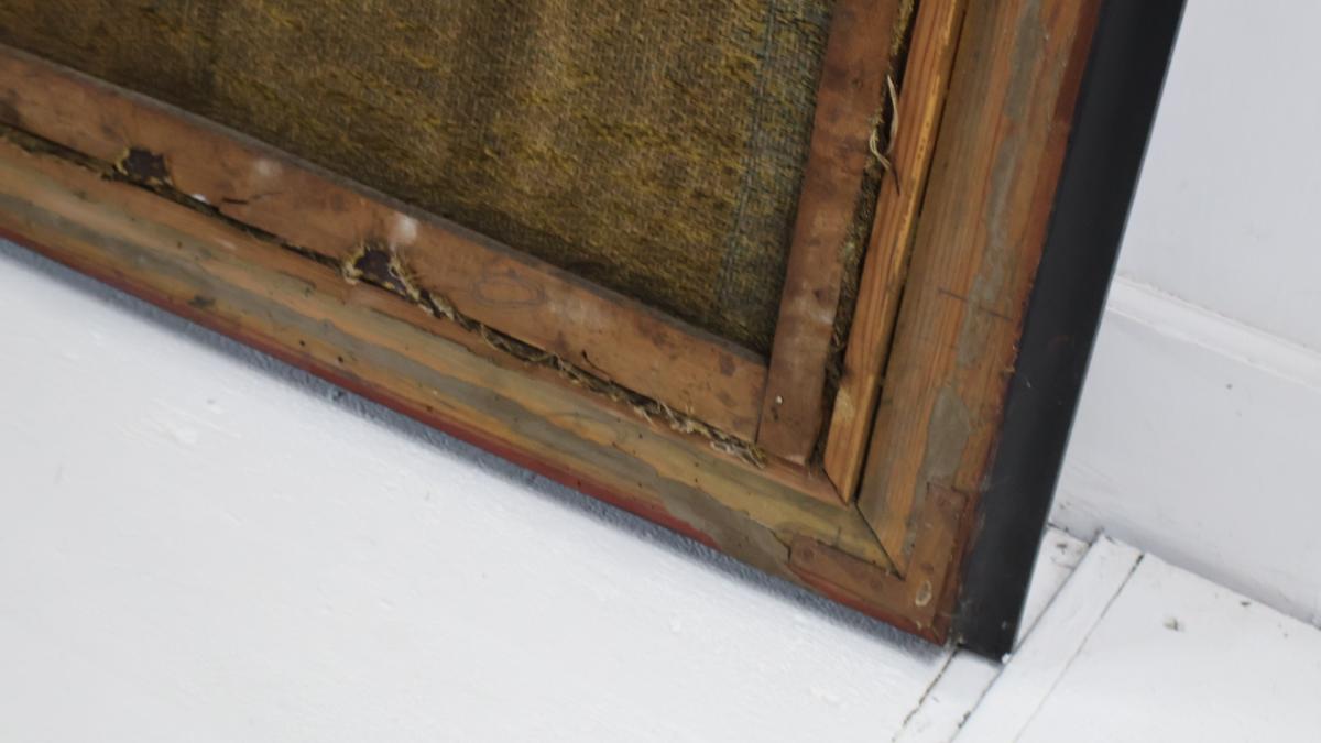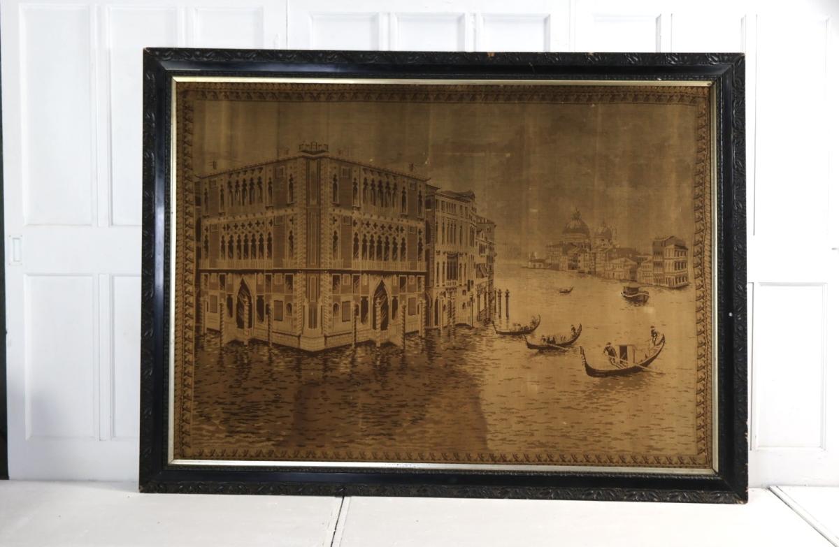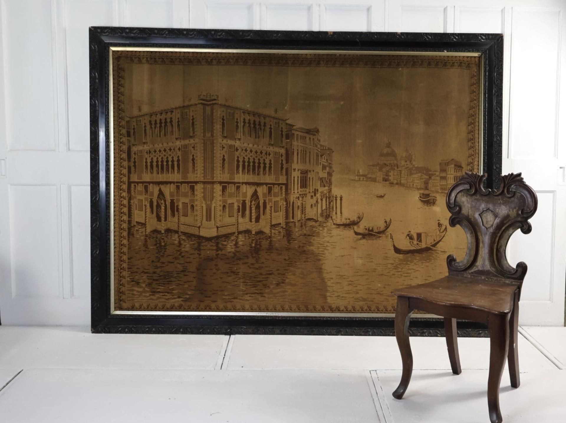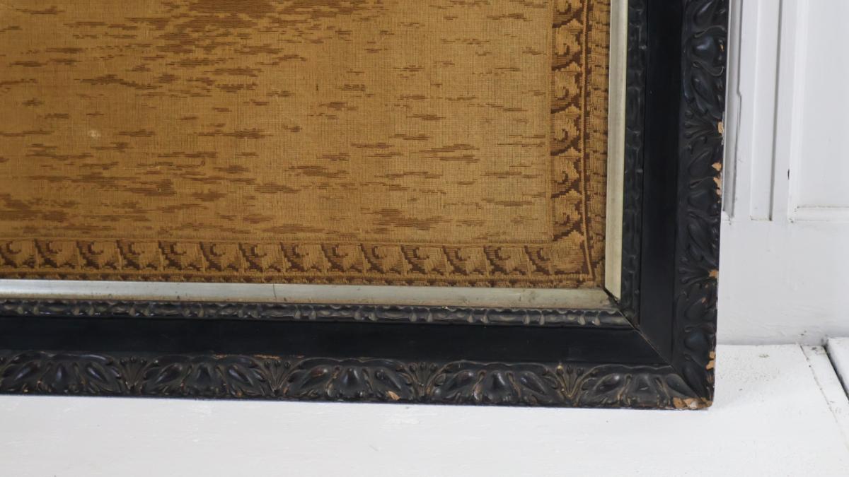 In its original, period, ebonised frame and retaining some of the original backing paper and brass hanging hooks.