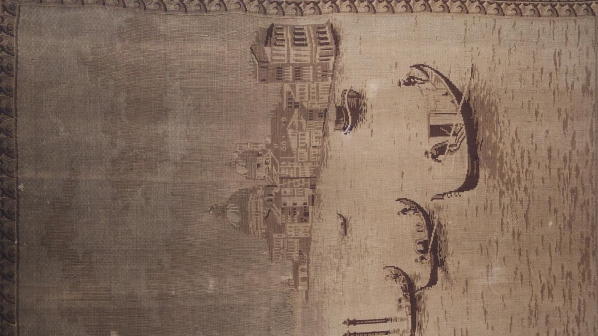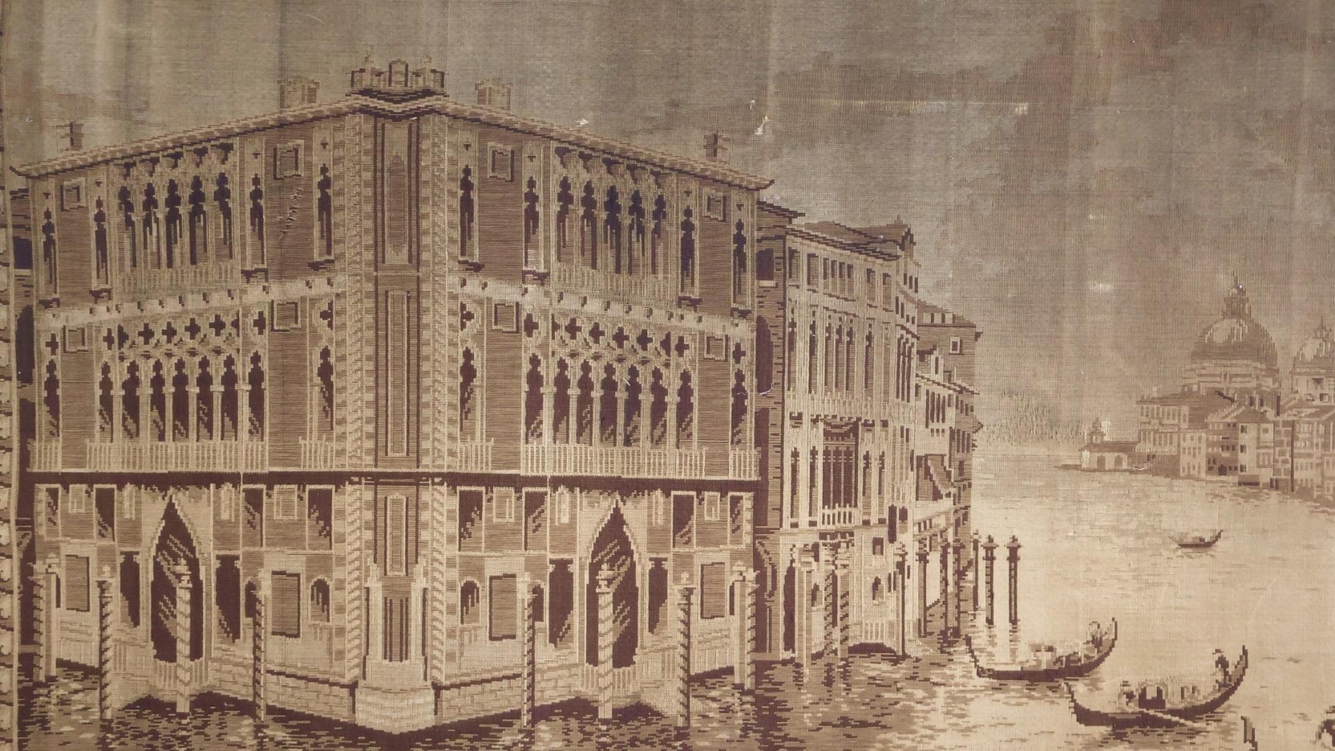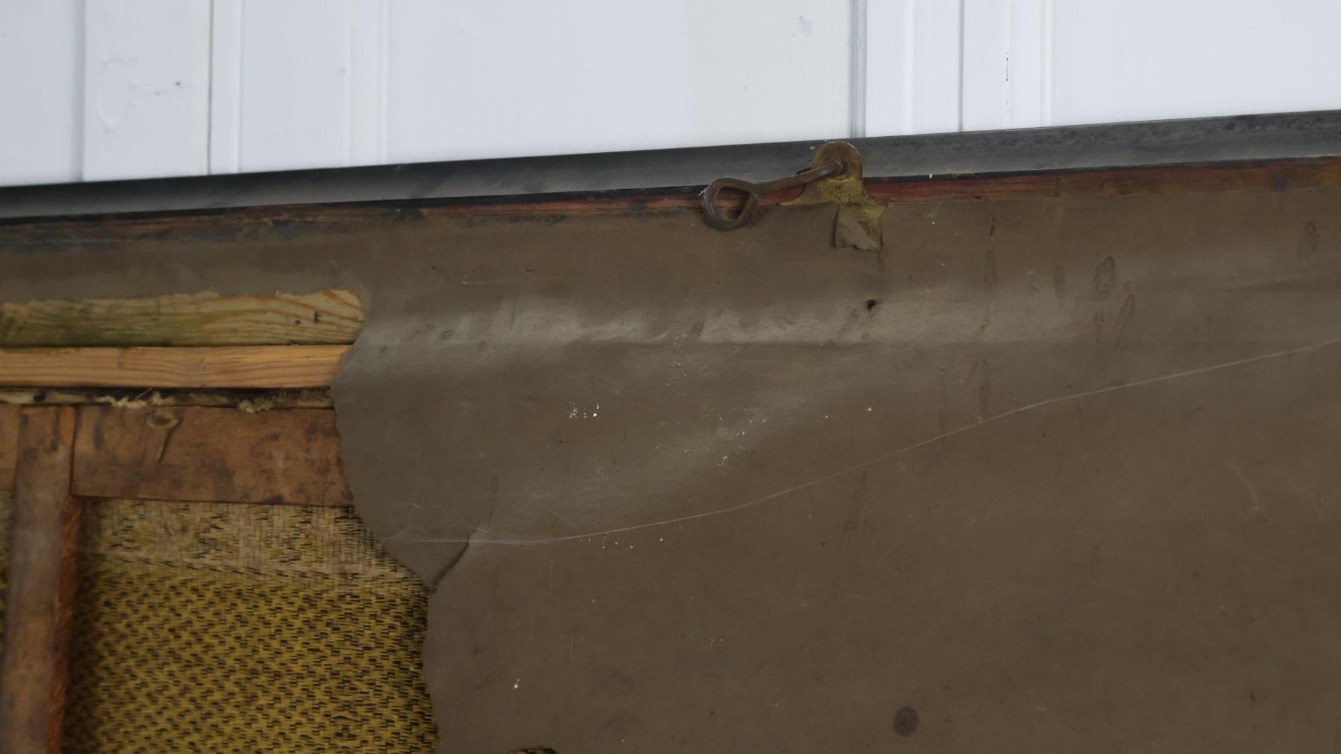 In its original, period, ebonised frame and retaining some of the original backing paper and brass hanging hooks.