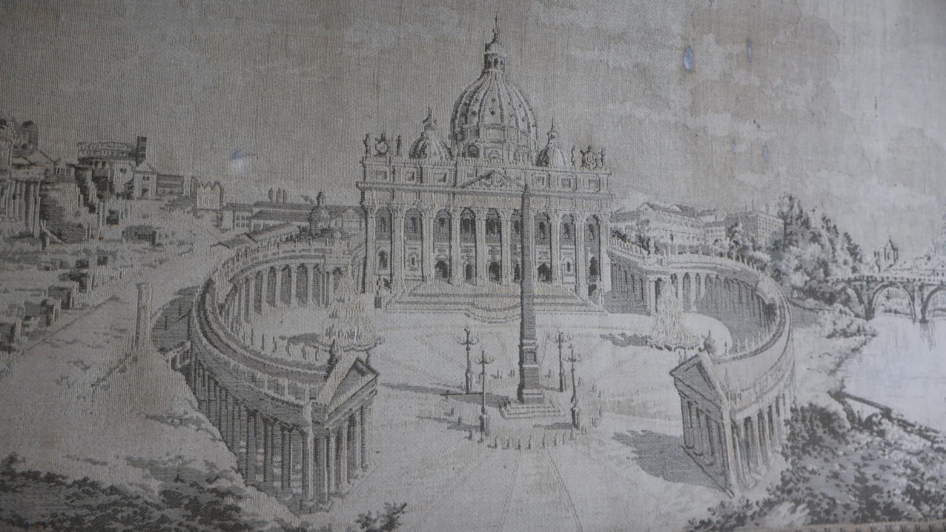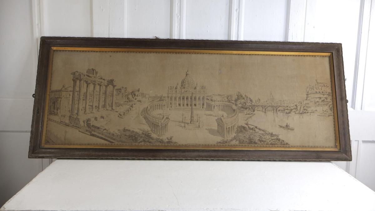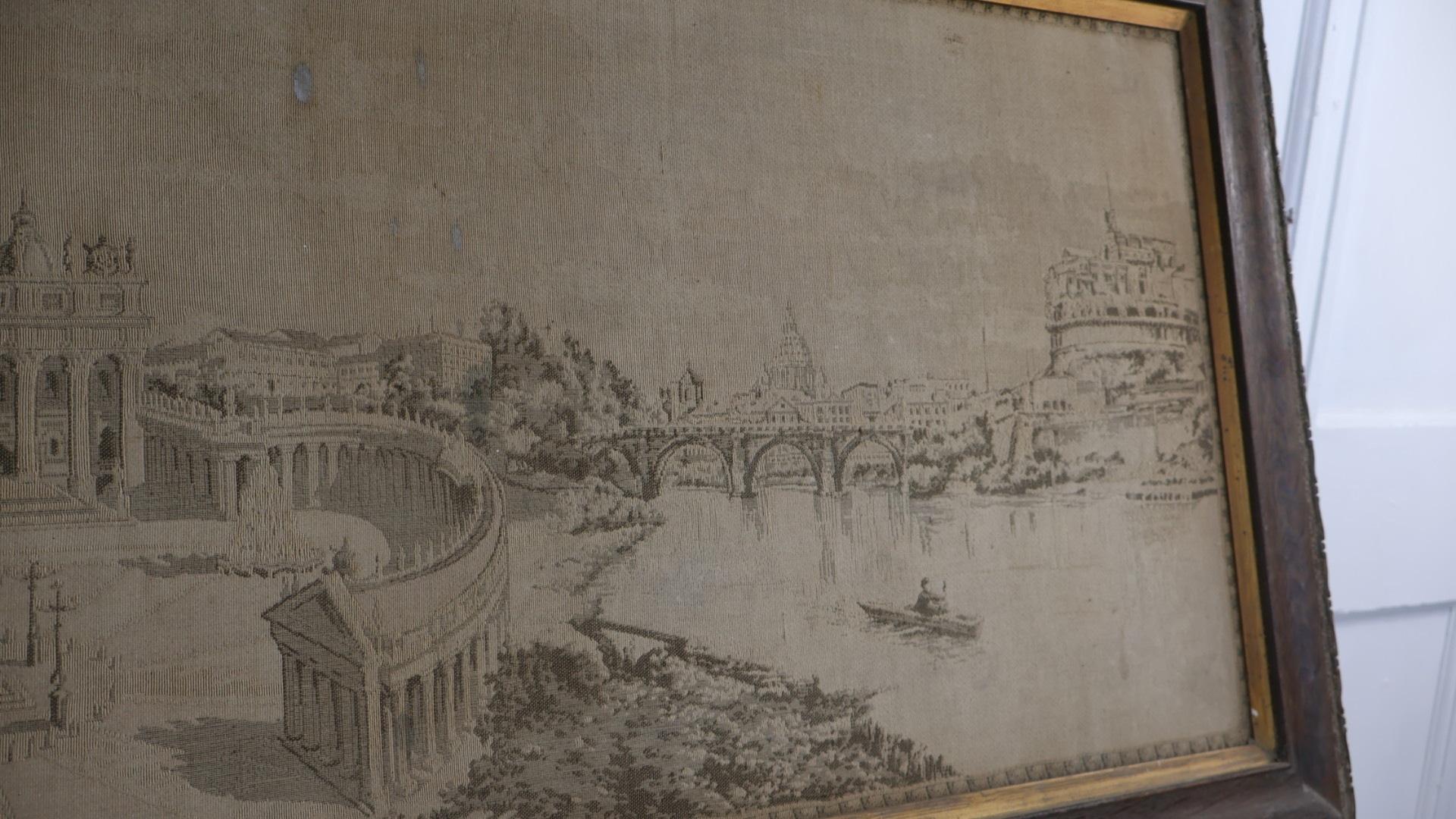 A 19thc grand tour tapestry depicting the city of Rome, in its original wooden period frame.