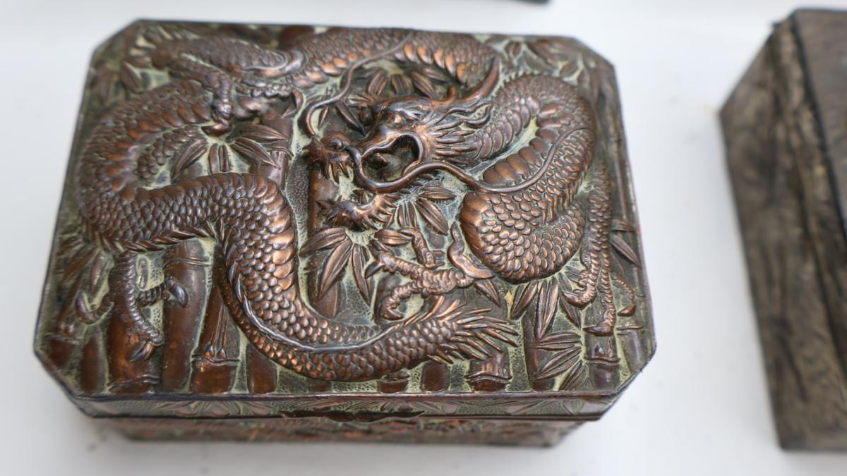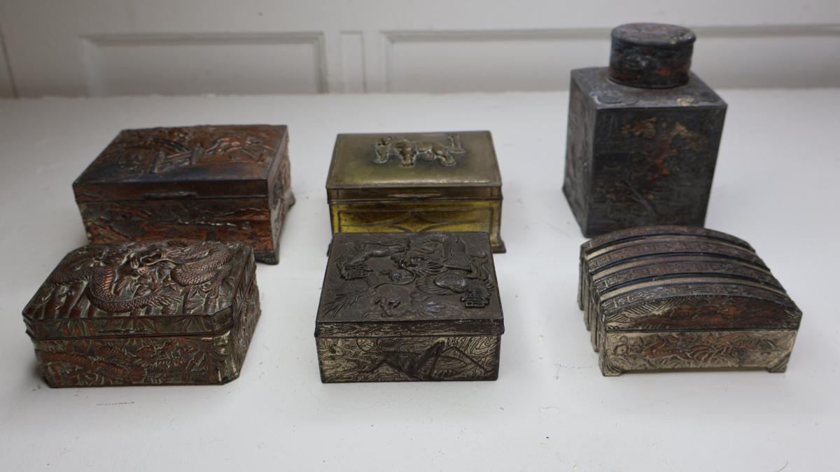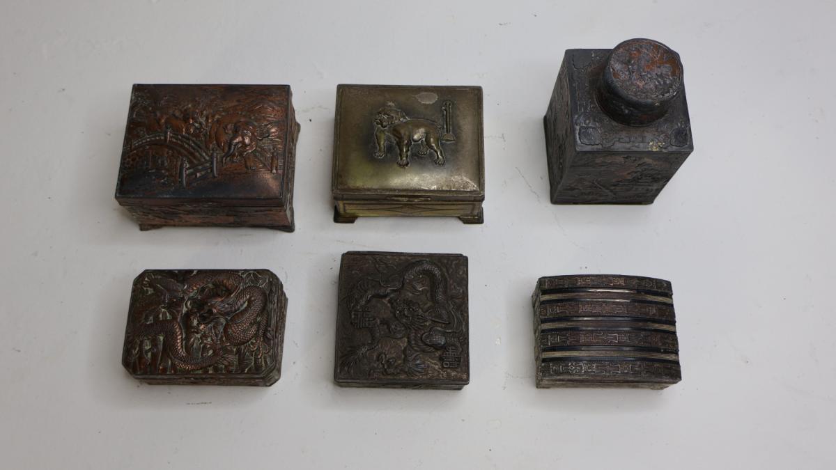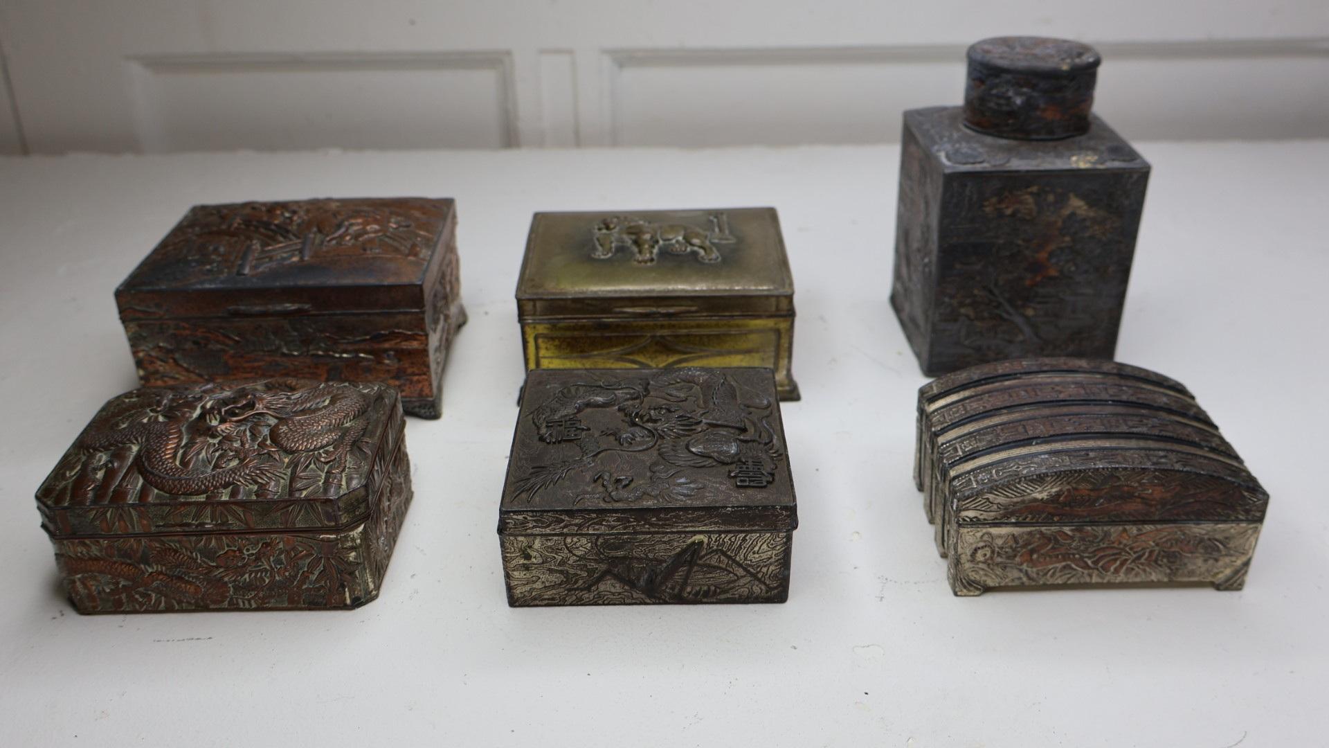 A collection of 6 Japanese tins, all of incredible quality, comprising of copper, shelter or brass.