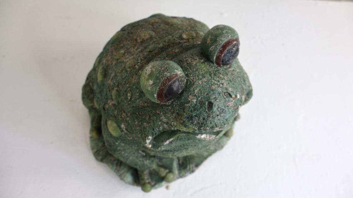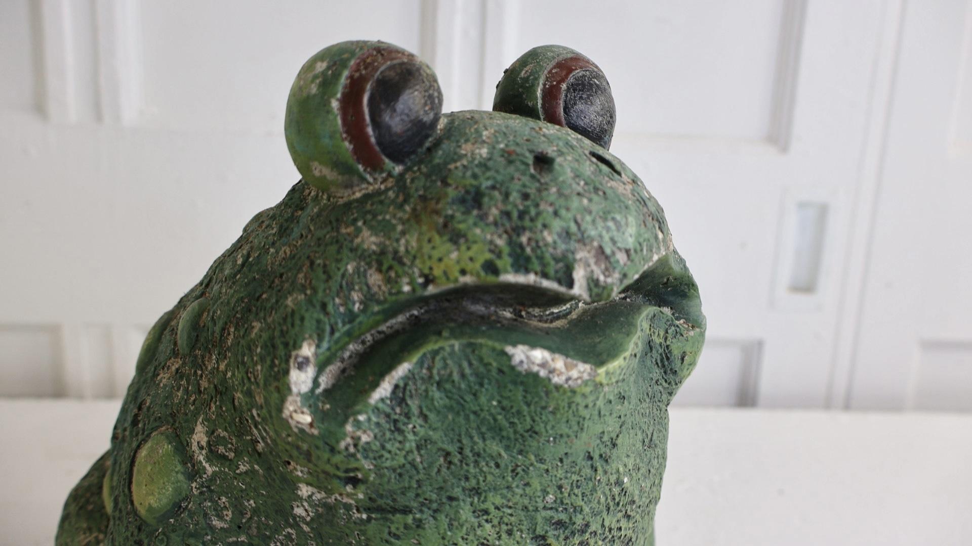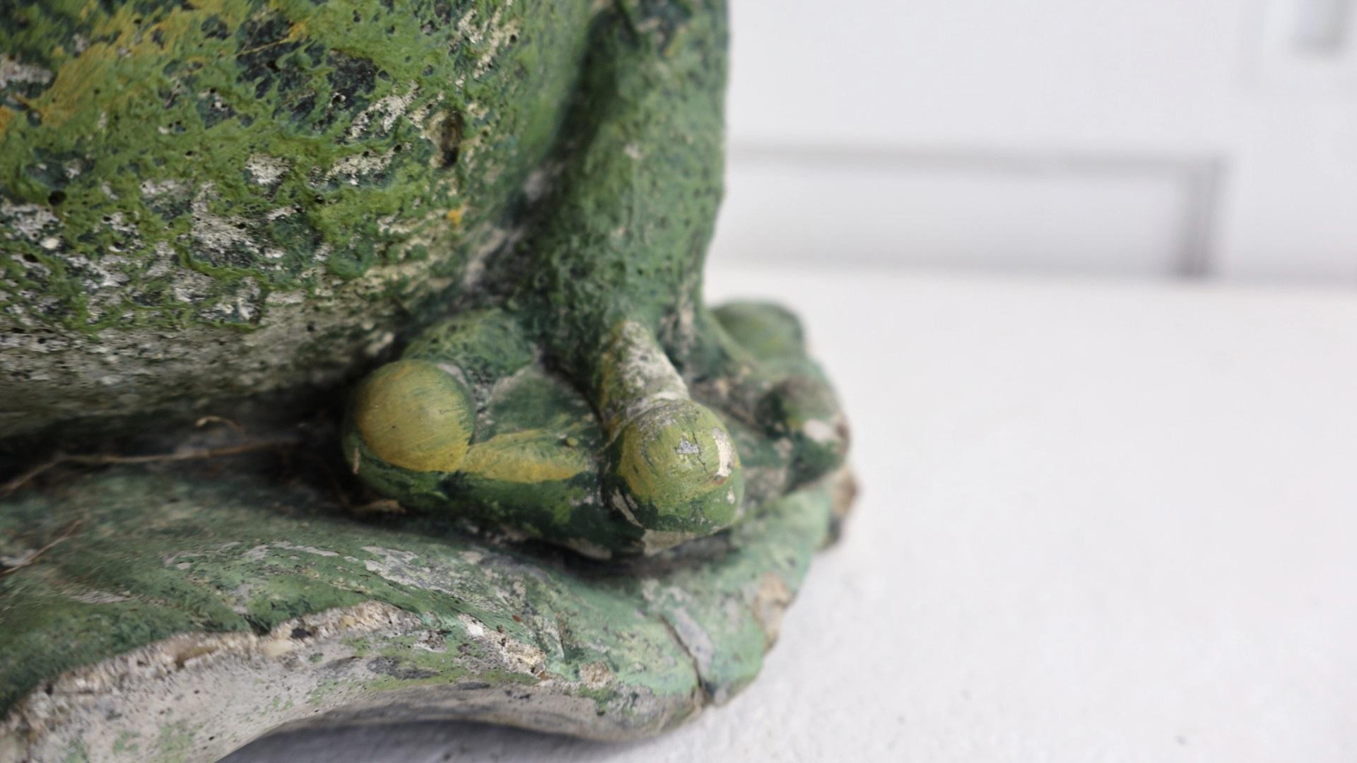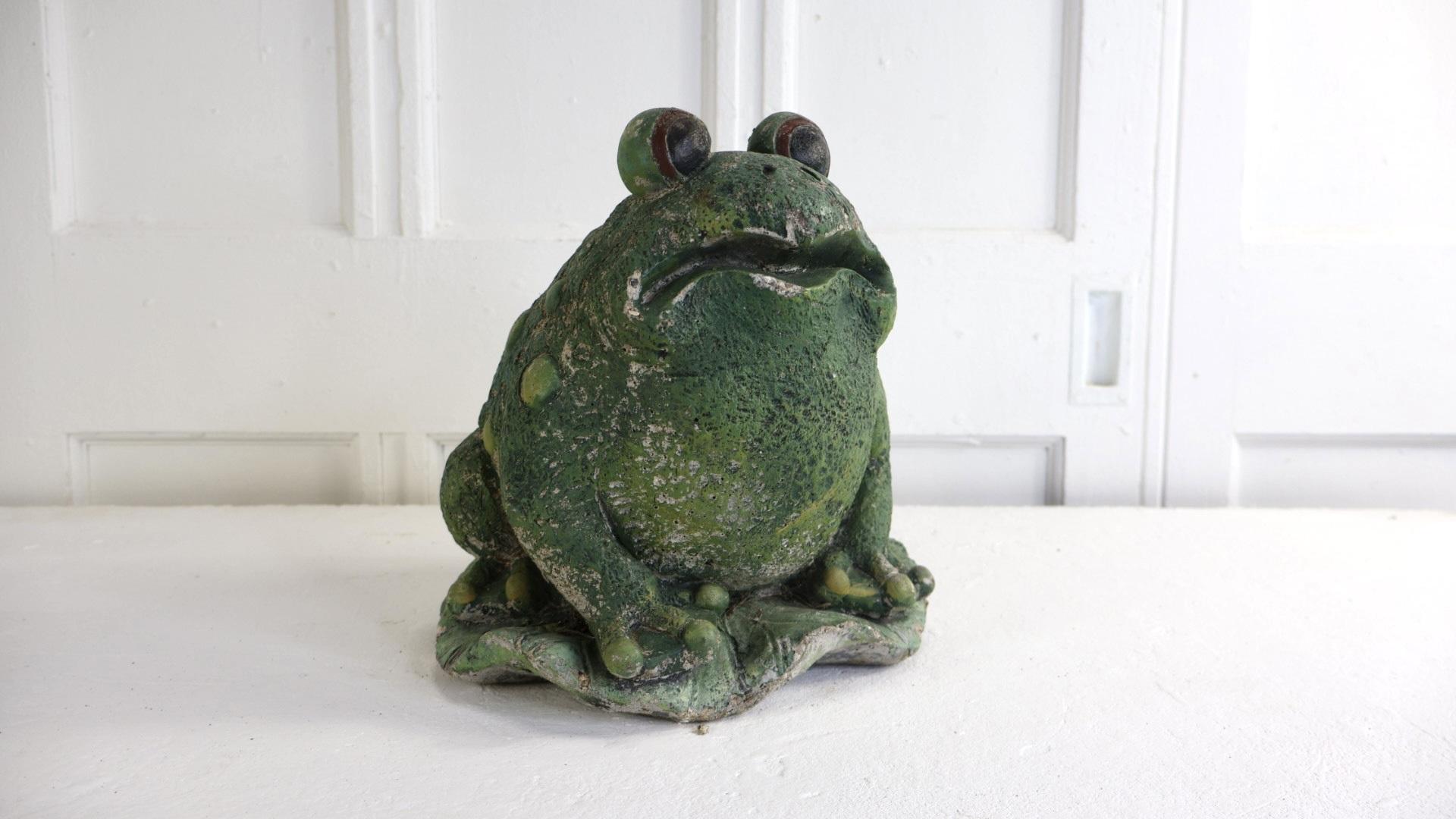 Charming, hand painted statue of a large toad, sitting on a lily pad.