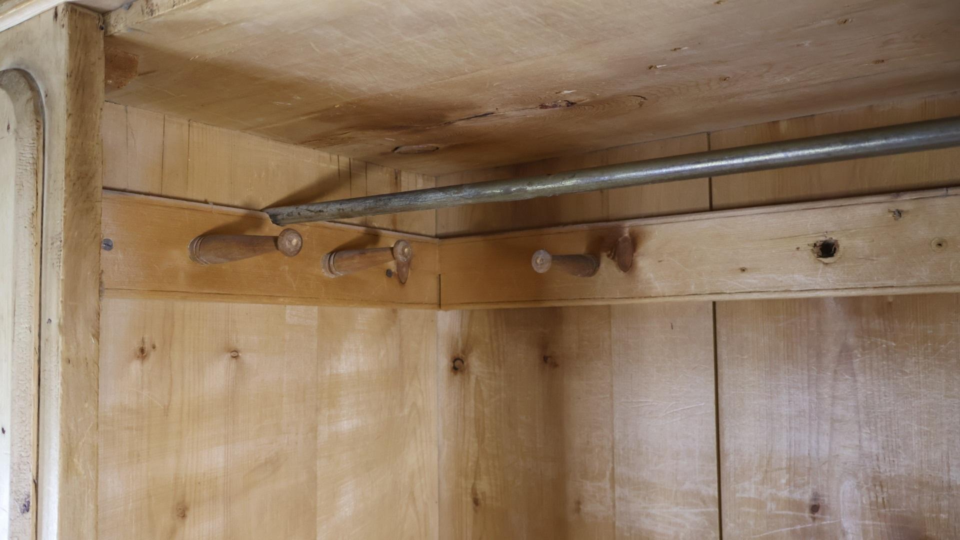 A clean example of a 19thc English pine wardrobe, comprising of a large storage cupboard complete with several coat pegs and a brass hanging rail.