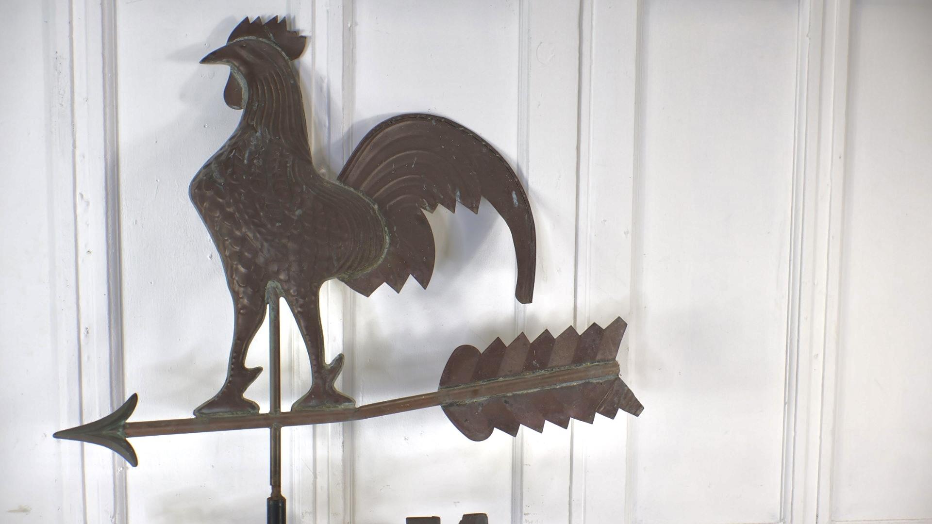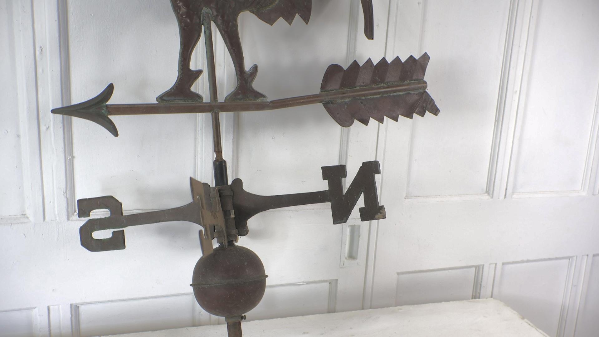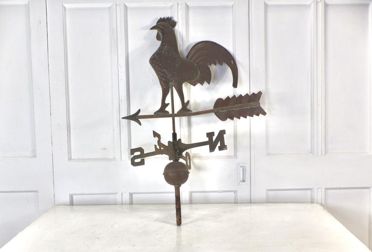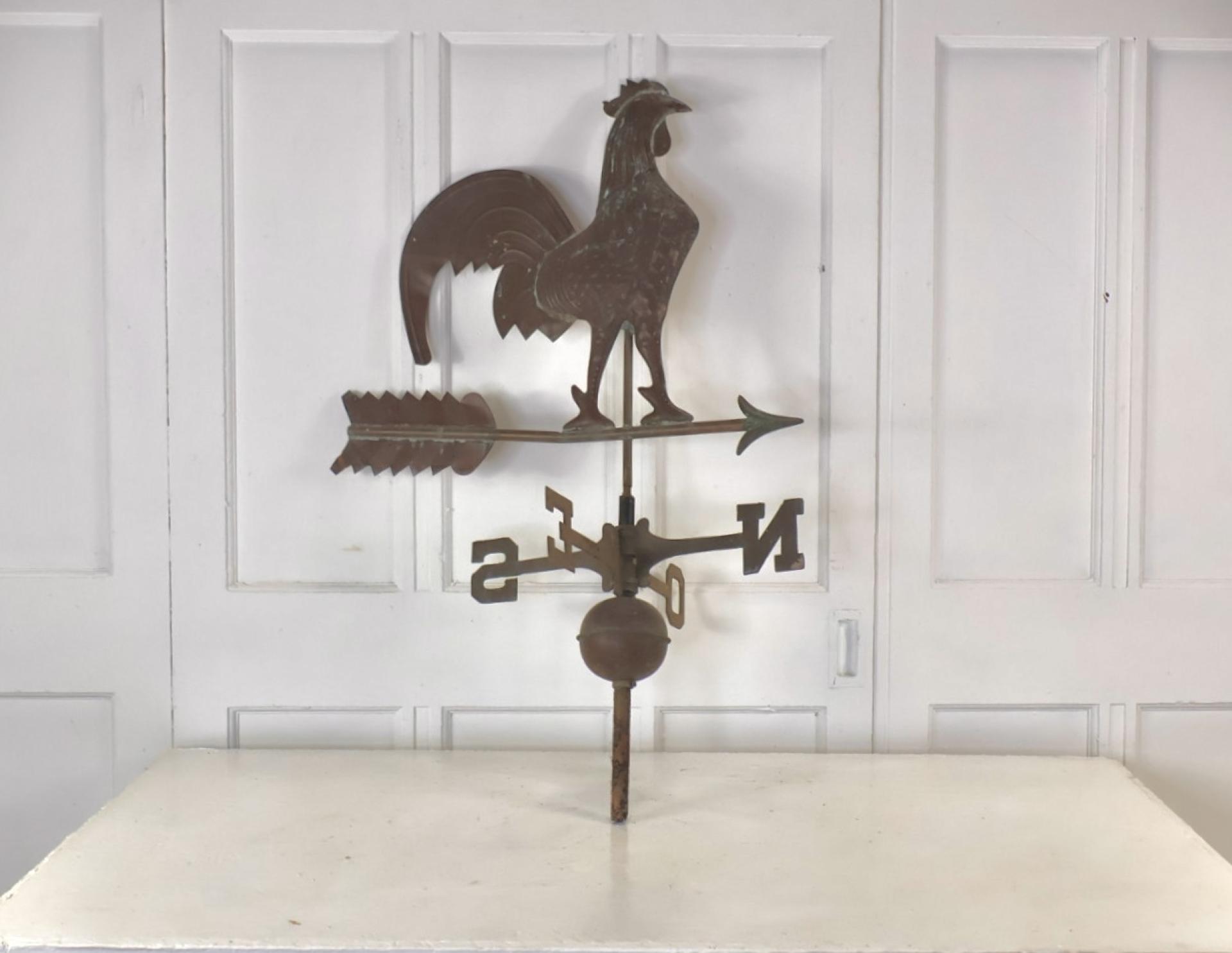 A large, impressive copper weathervane, with a full bodied cockerel and directional arrow. and lettering intact.