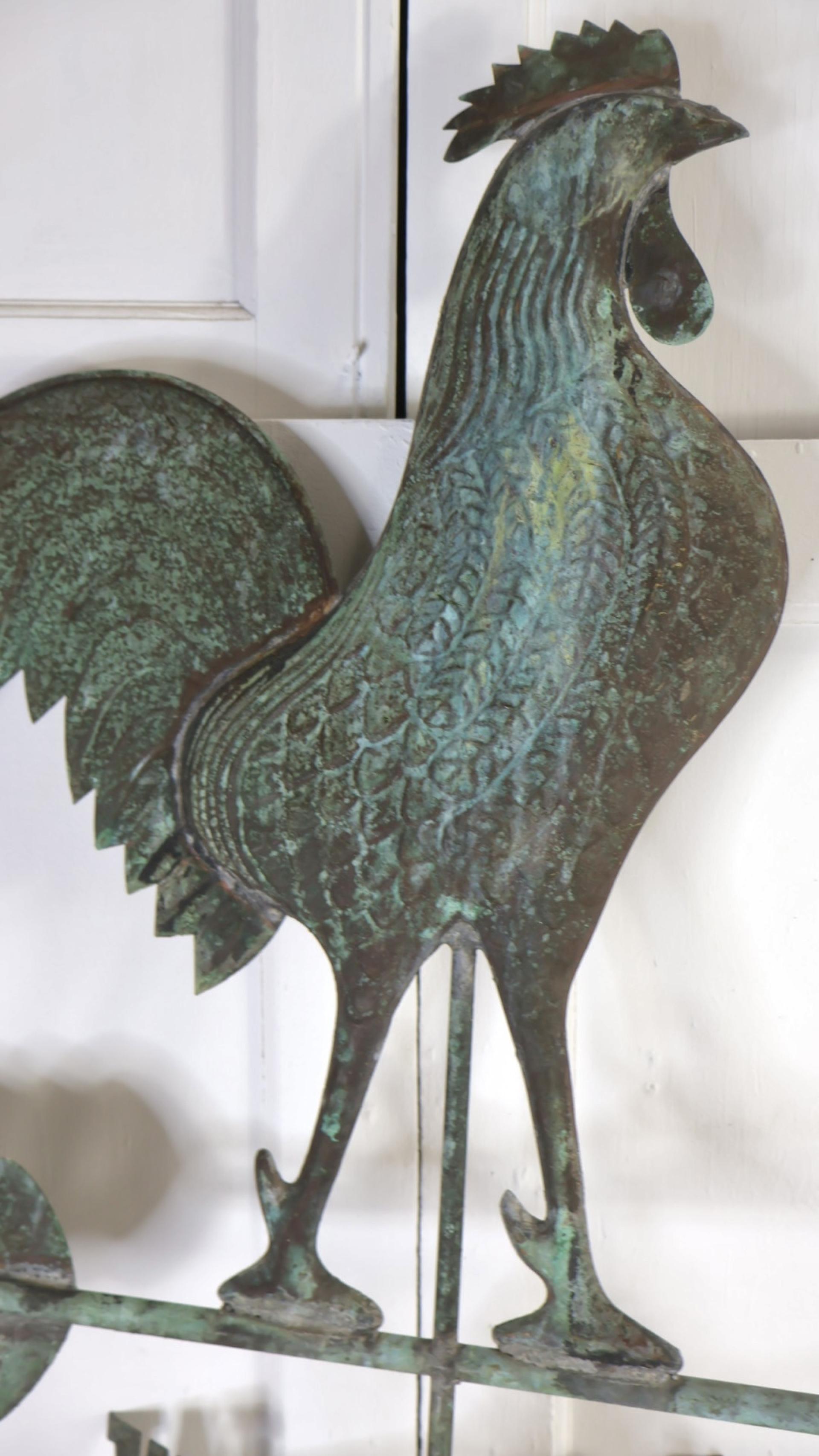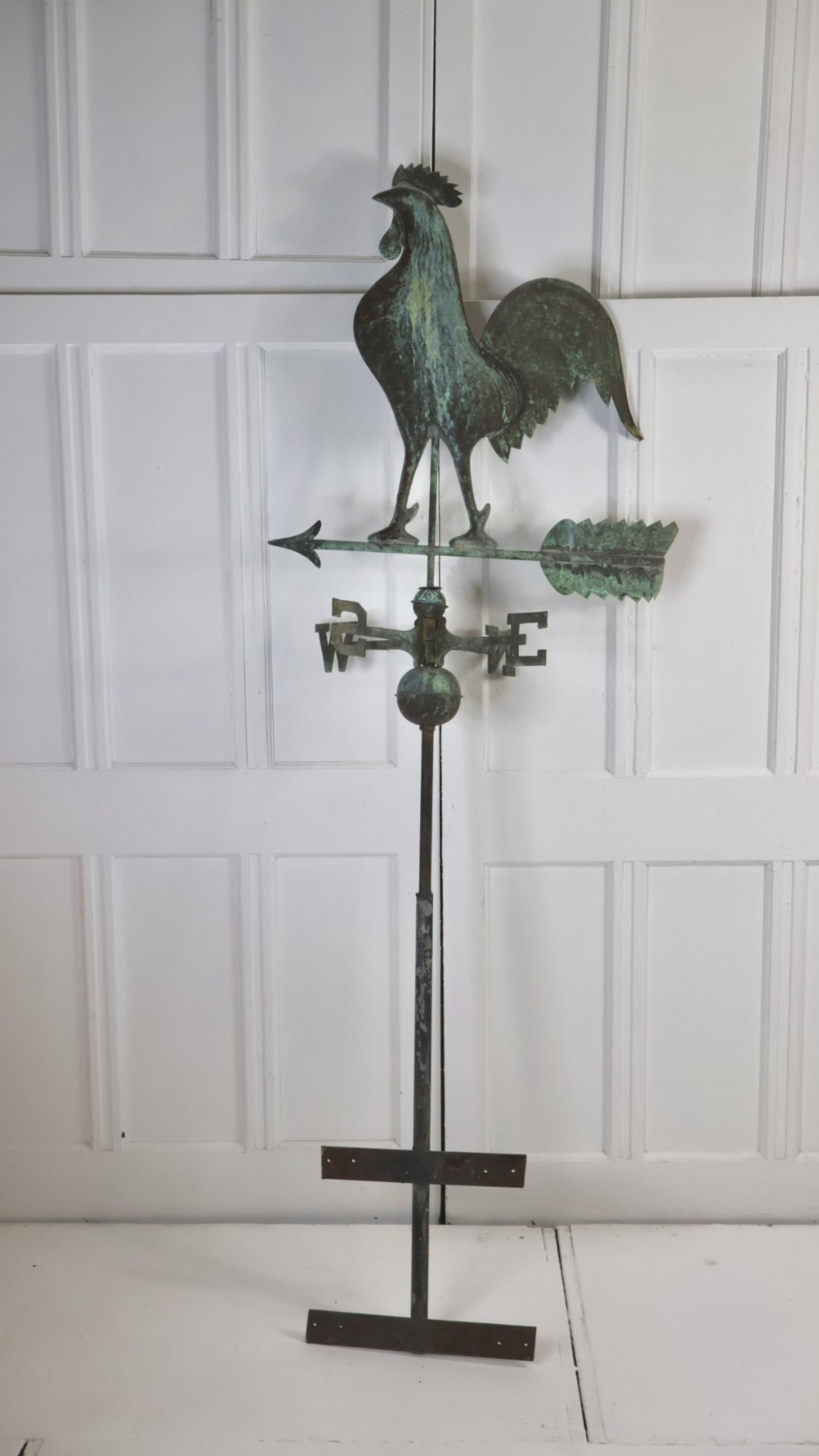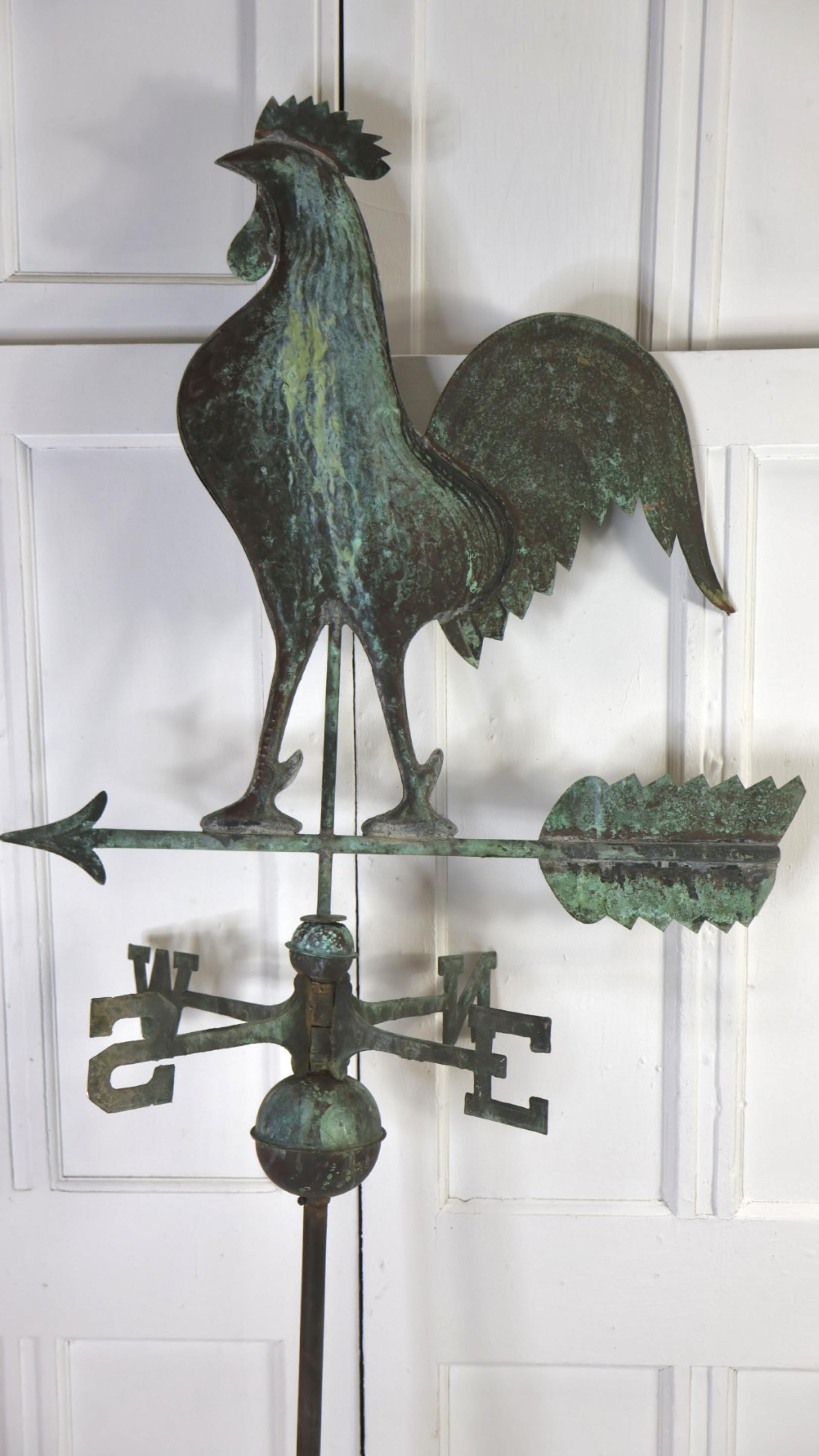 Full bodied copper cockerel, with a very decorative original verdigris finish, retaining its brass direction letters.