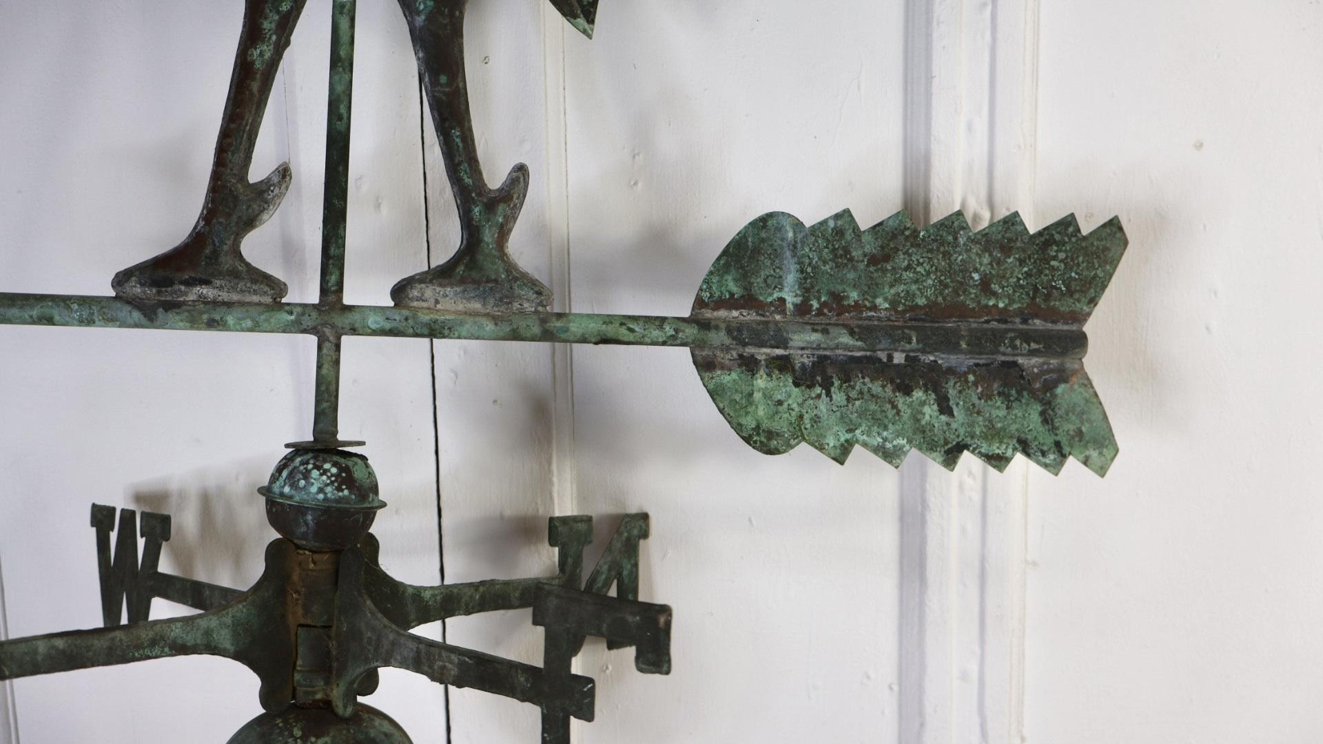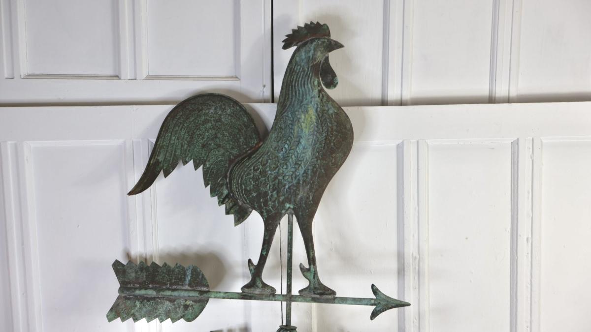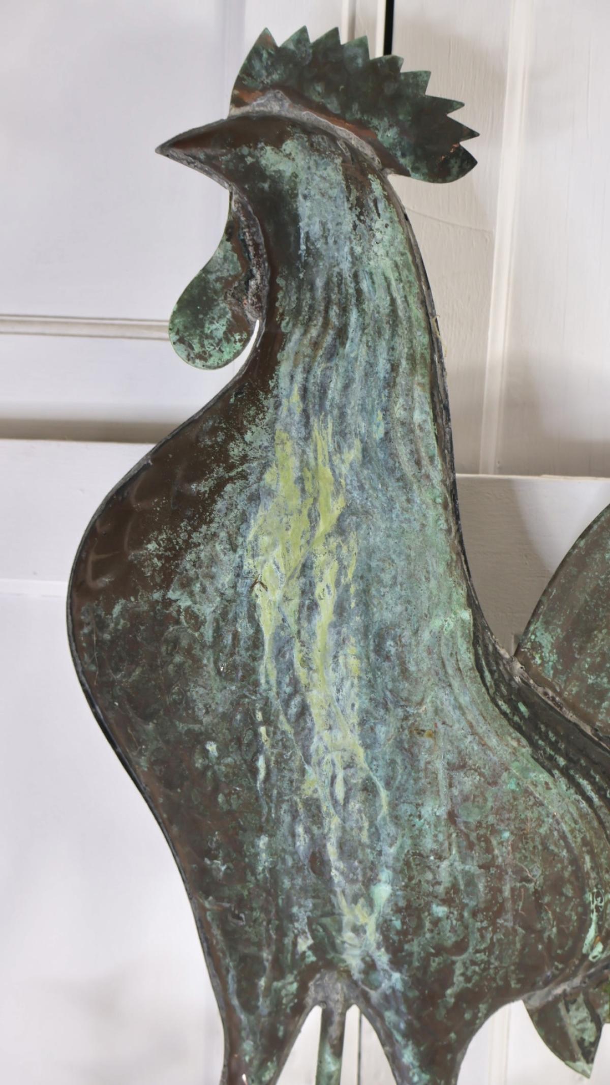 Full bodied copper cockerel, with a very decorative original verdigris finish, retaining its brass direction letters.