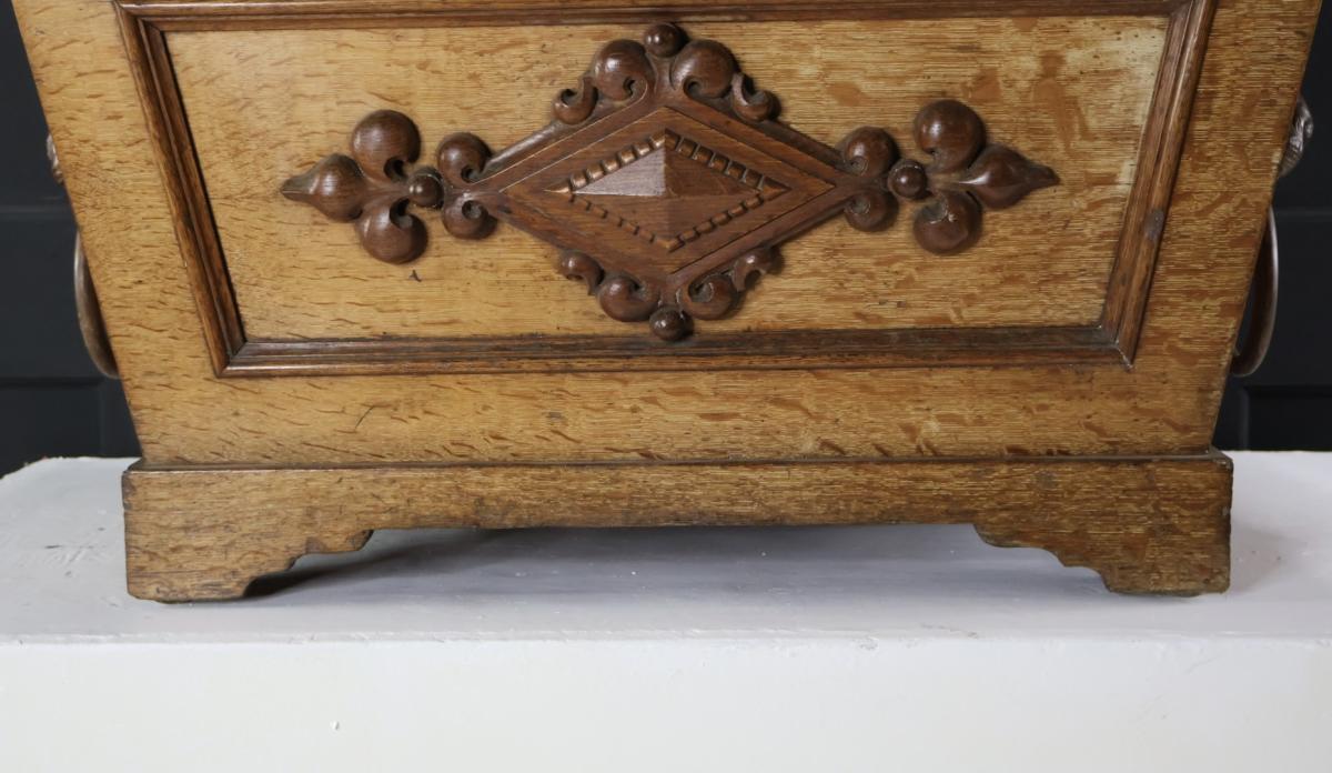 Decorated with a front facing hand carved embellishment and 2 large carved lion heads with wooden carrying rings to each end.